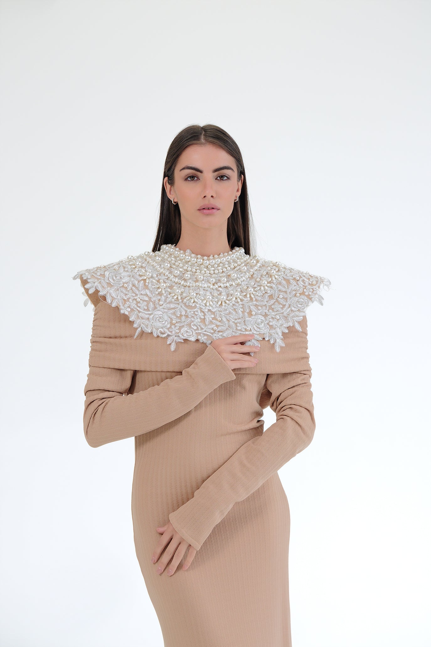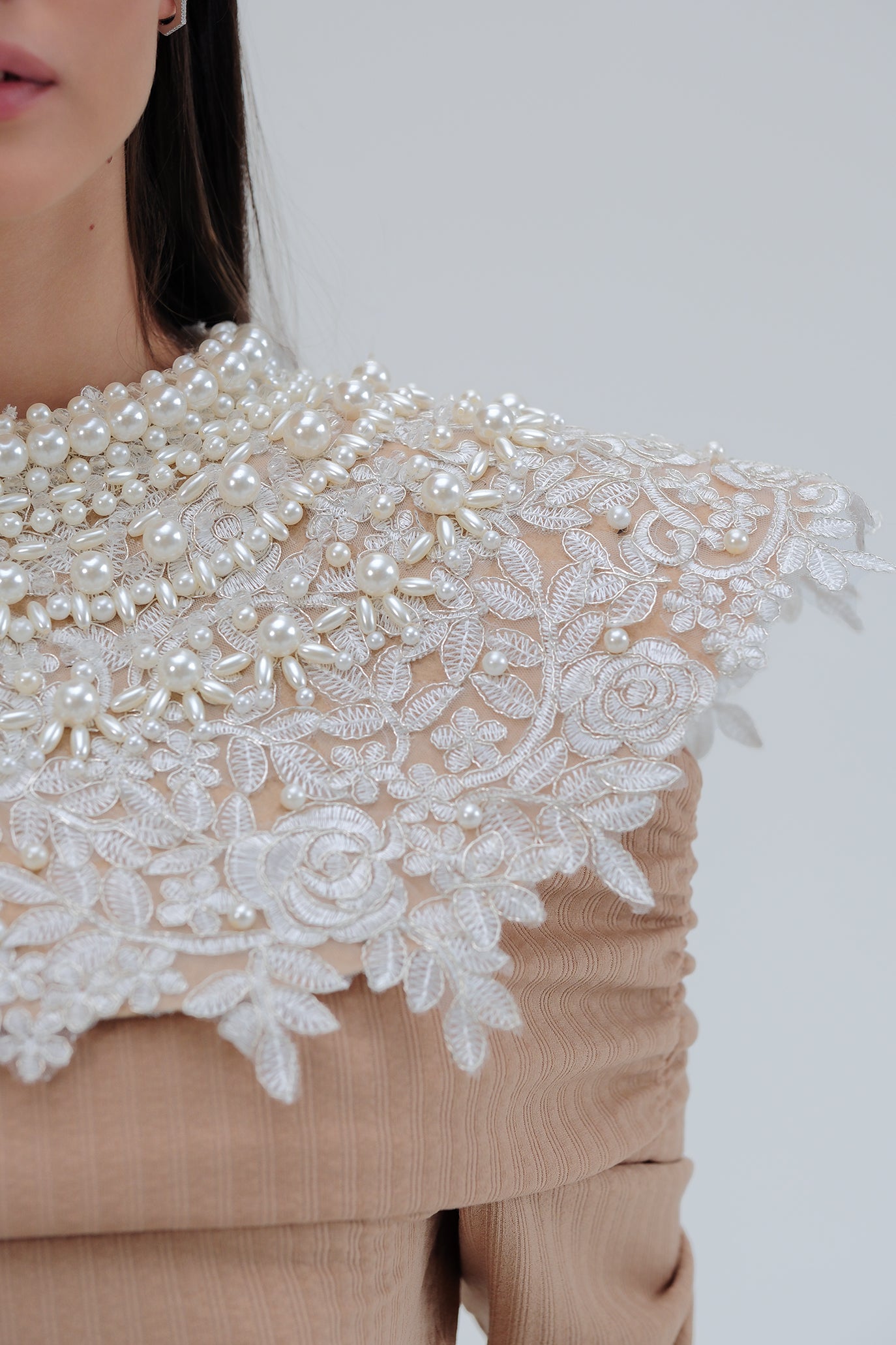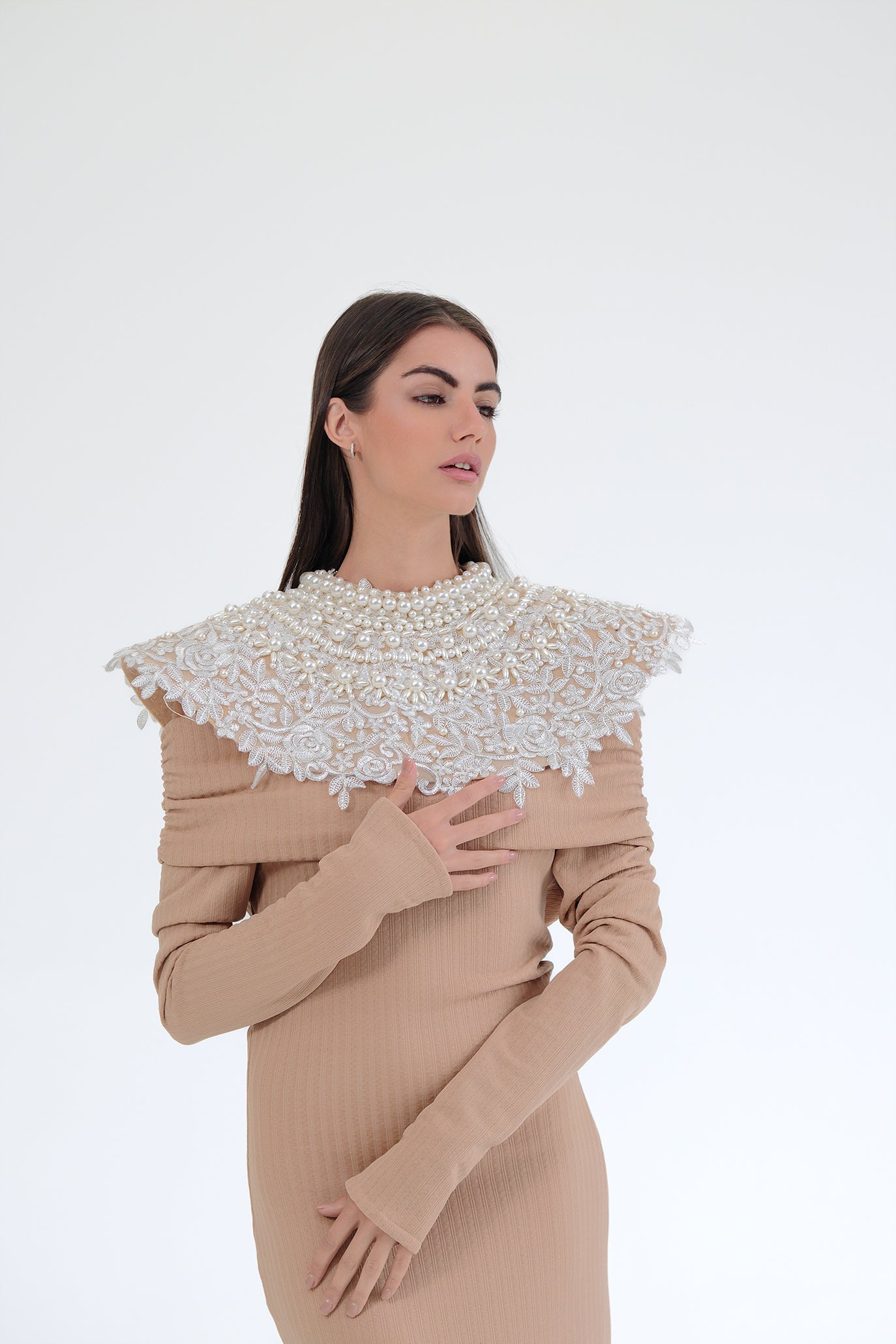 Истинско бижу за всяка специална визия. Яката е ръчно изработена от фина дантела с прецизна апликация на различни по размер перли и кристални мъниста, оформящи флорални мотиви. Формата е скосена, тип пелерина, която красиво обгръща раменете. Комплектът включва и ръчно декорирани ръкавици в същия стил – еластични и удобно прилягащи, с отвор за палеца. Подходяща за булчински визии, вечерни събития, фотосесии или стилен акцент върху минималистична рокля.