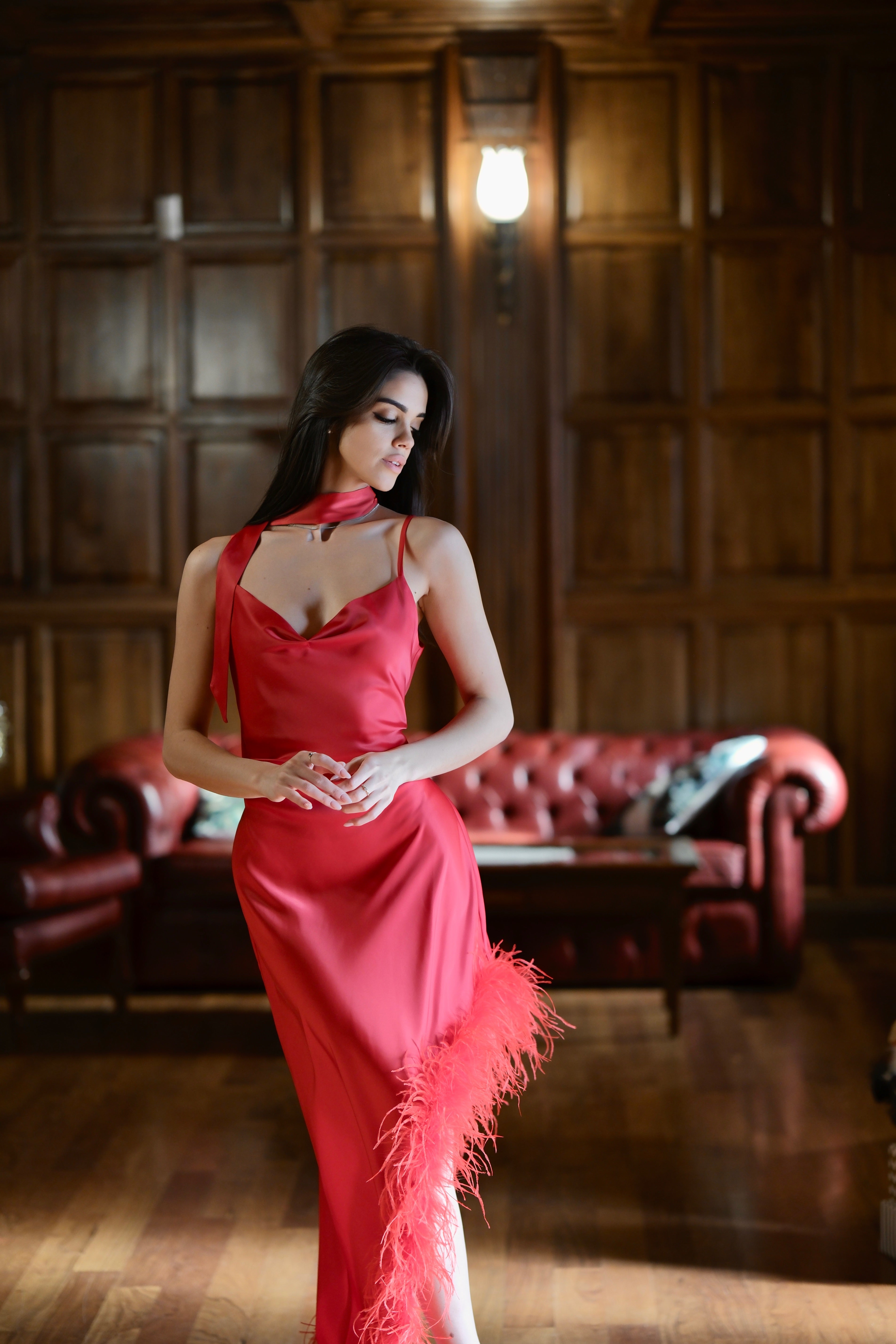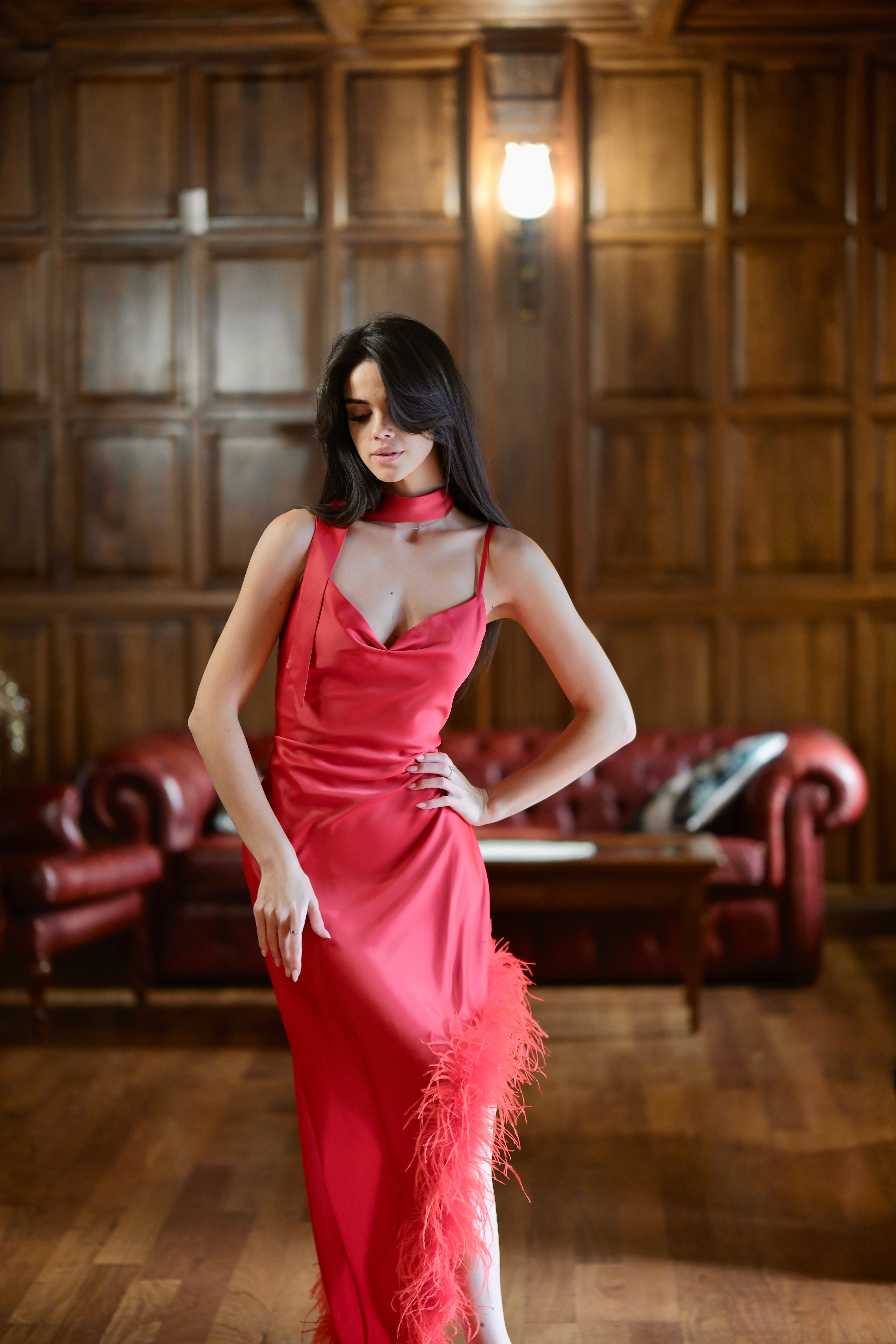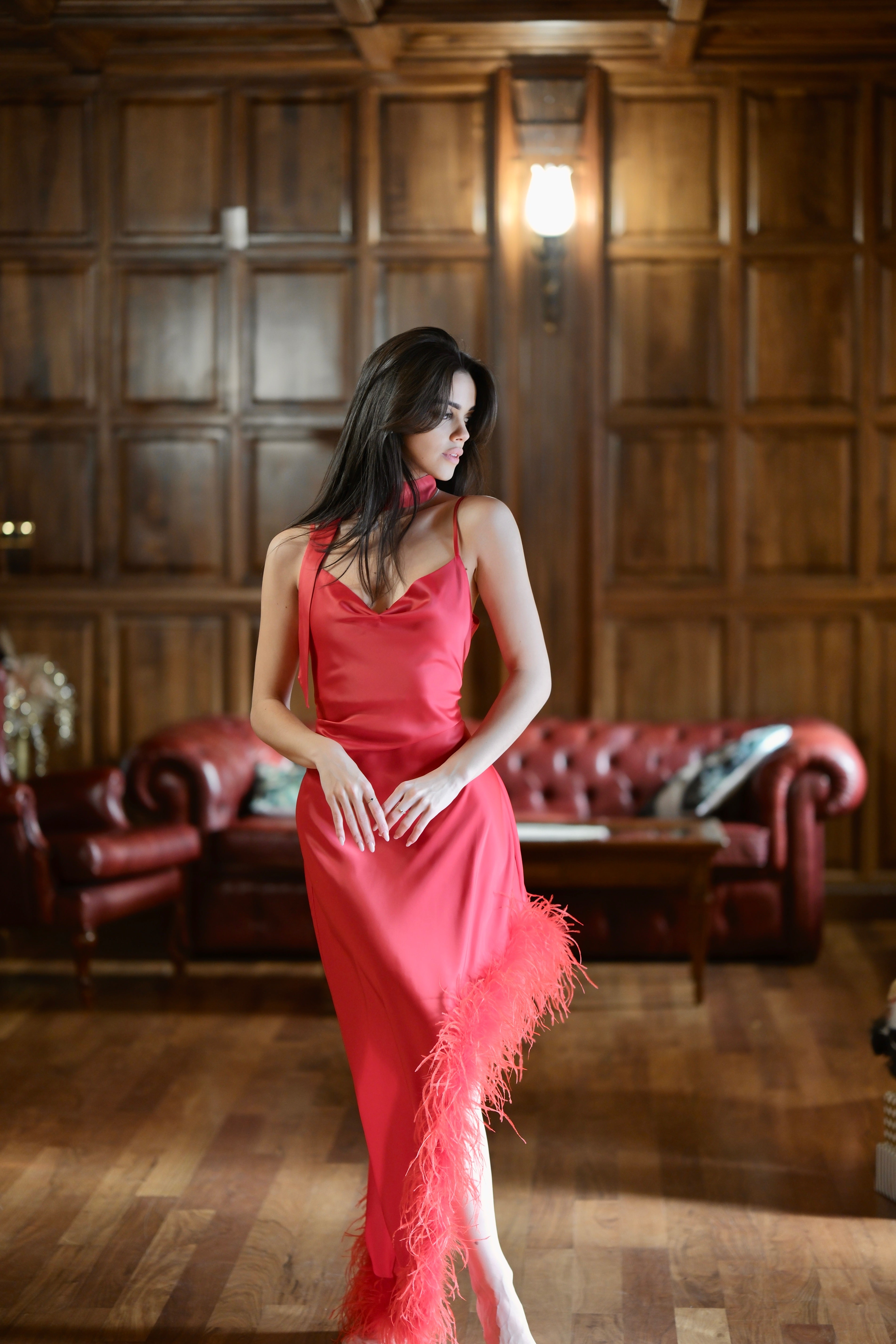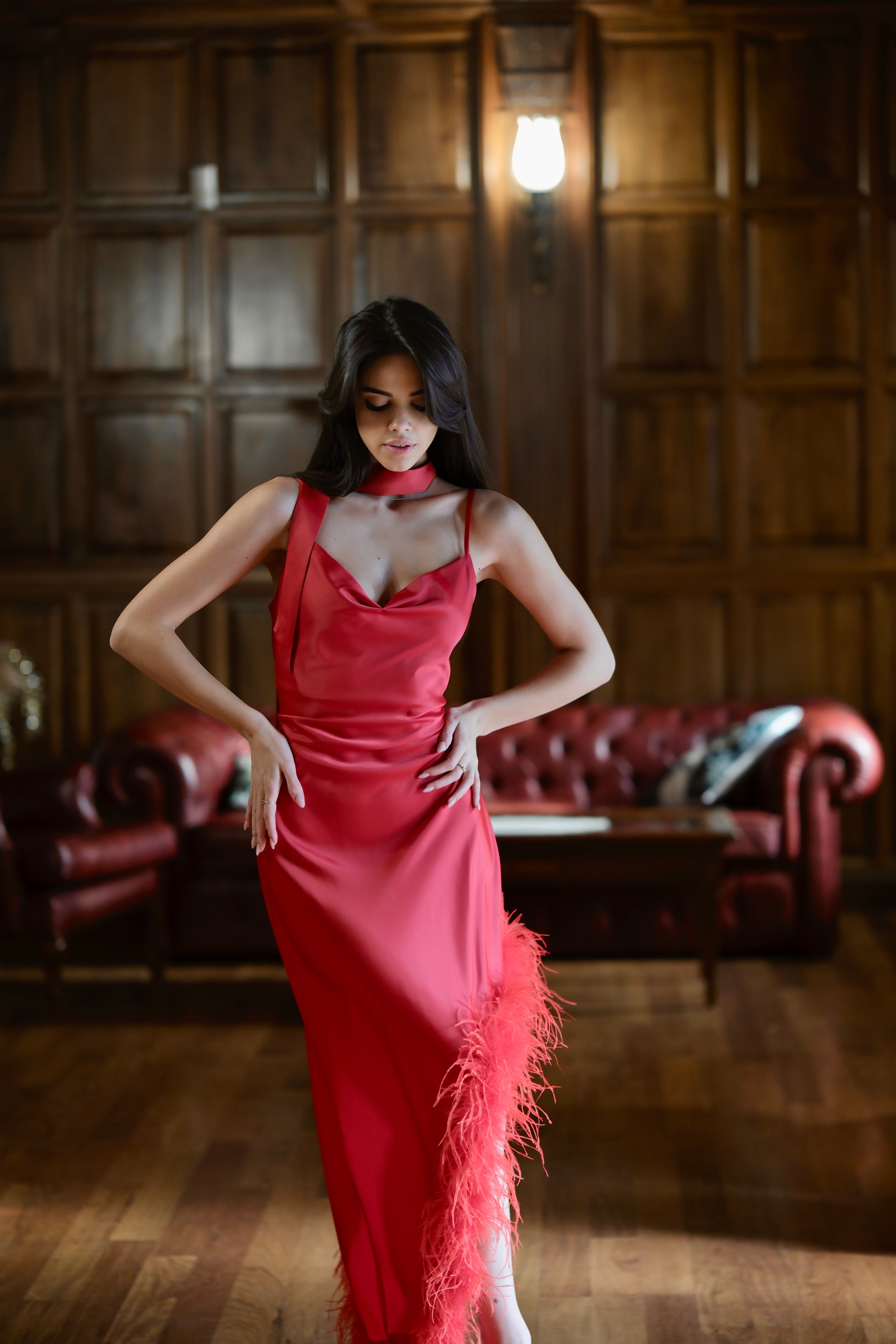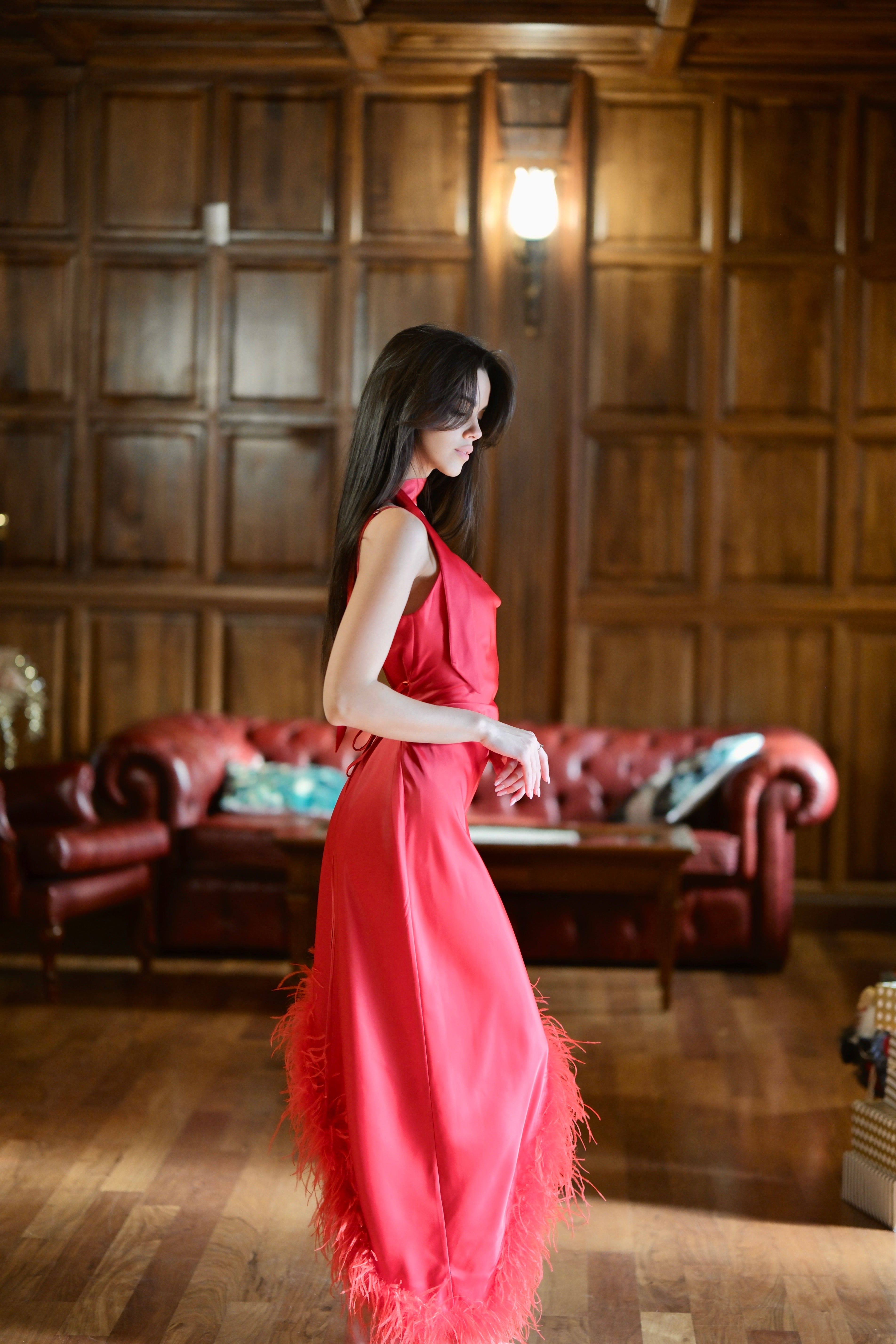 Дълга асиметрична рокля от луксозен сатен с деликатен блясък, която съчетава женственост и елегантност. Моделът е със свободна, асиметрична, ефирна кройка, тънки презрамки и паднало деколте тип „водопад“. Нежните пера по края допълват нежната визия. Отзад се регулира с връзки за перфектно прилягане към тялото.