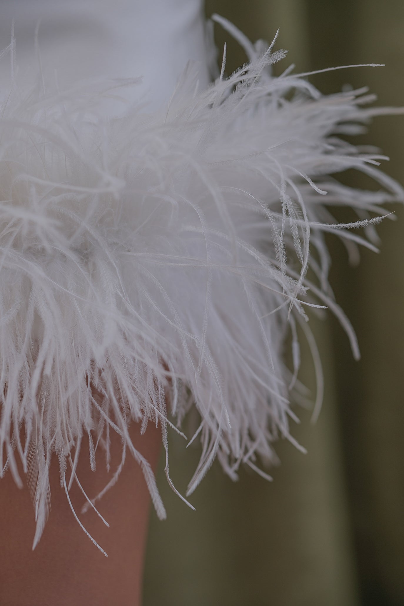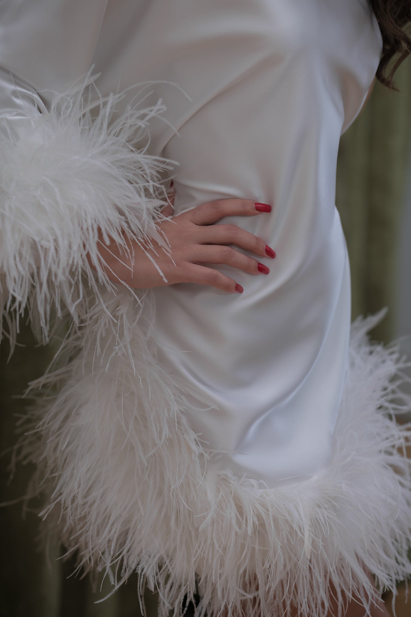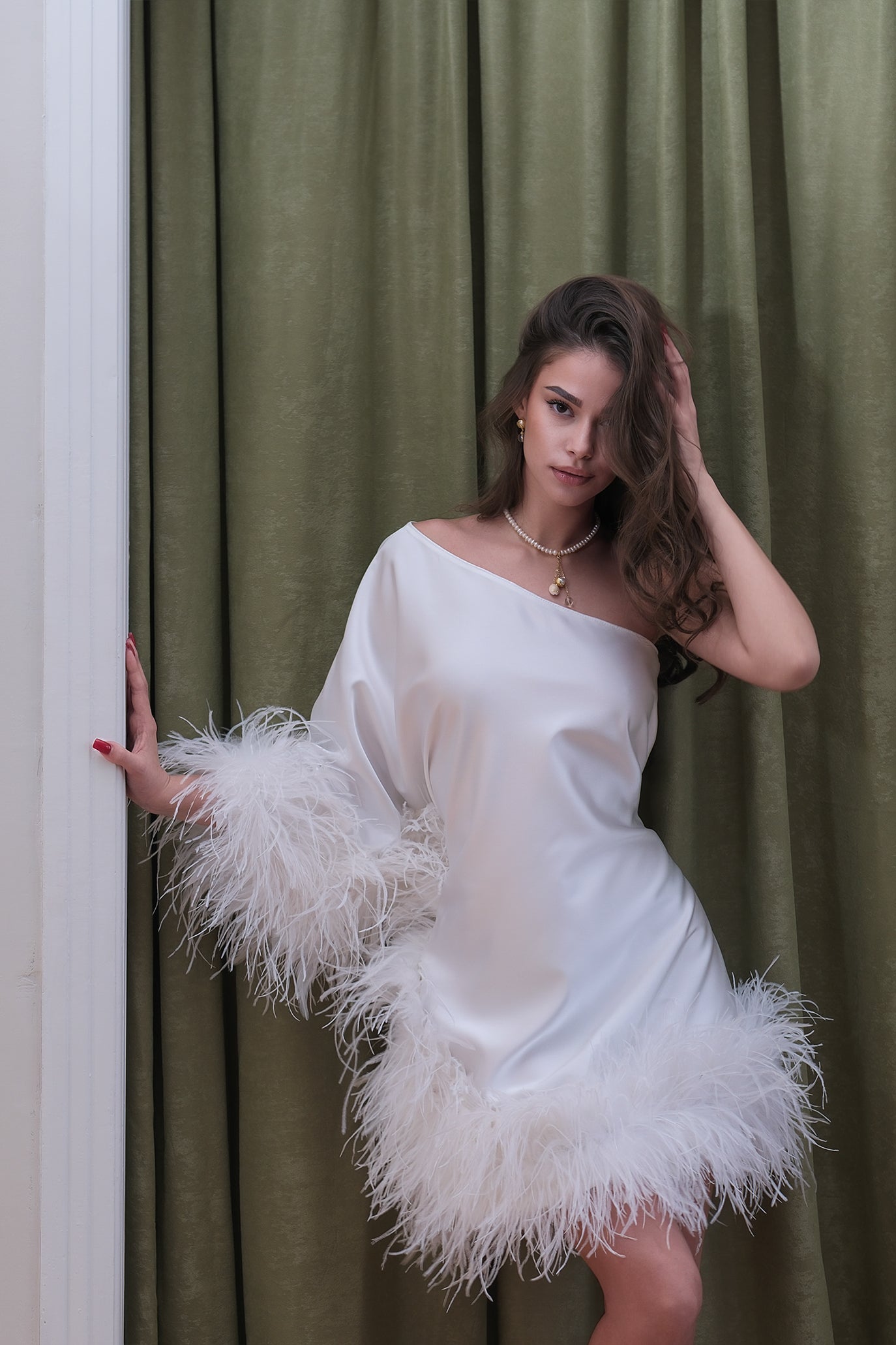 Елегантна къса рокля с асиметрично деколте и подчертана талия, създадена за впечатляващо присъствие. Моделът е с фина сатенирана материя и акцентни пера по подгъва и ръкава. Коланът оформя силуета.