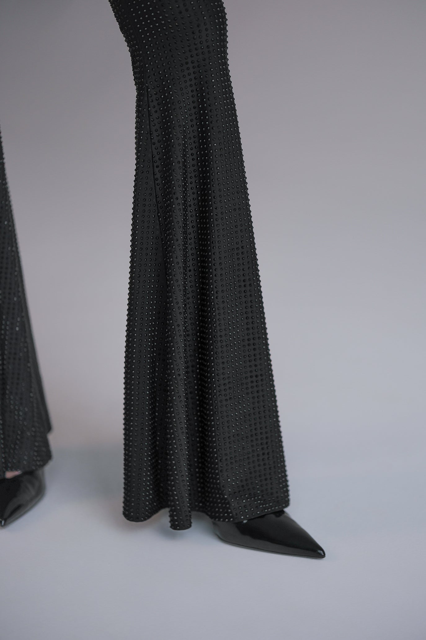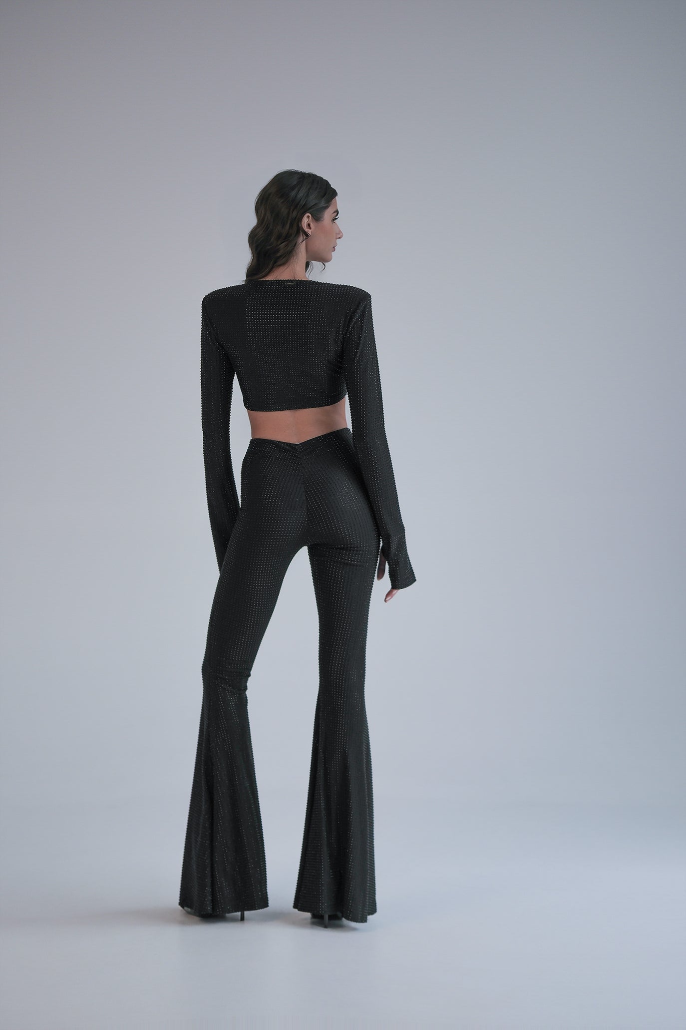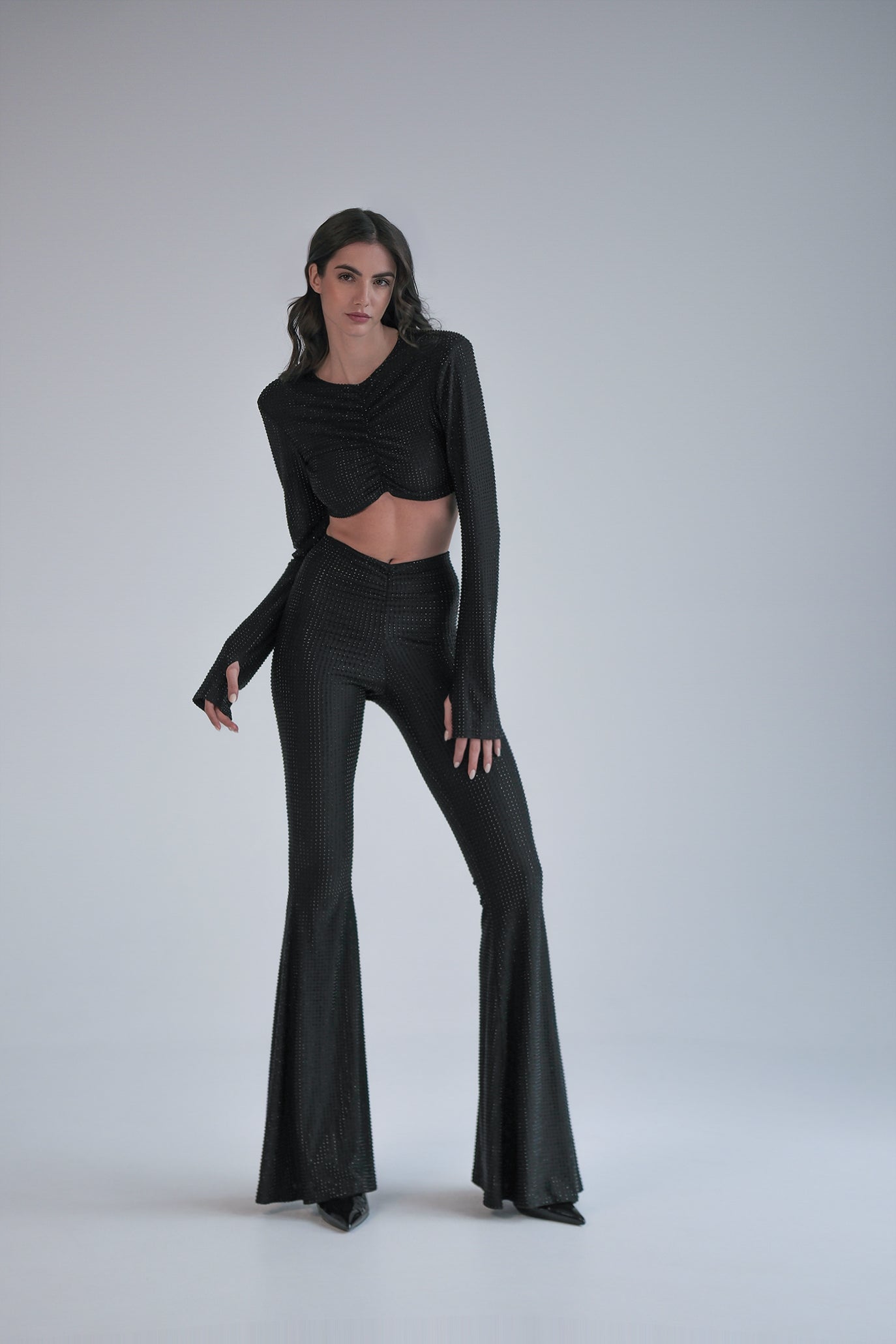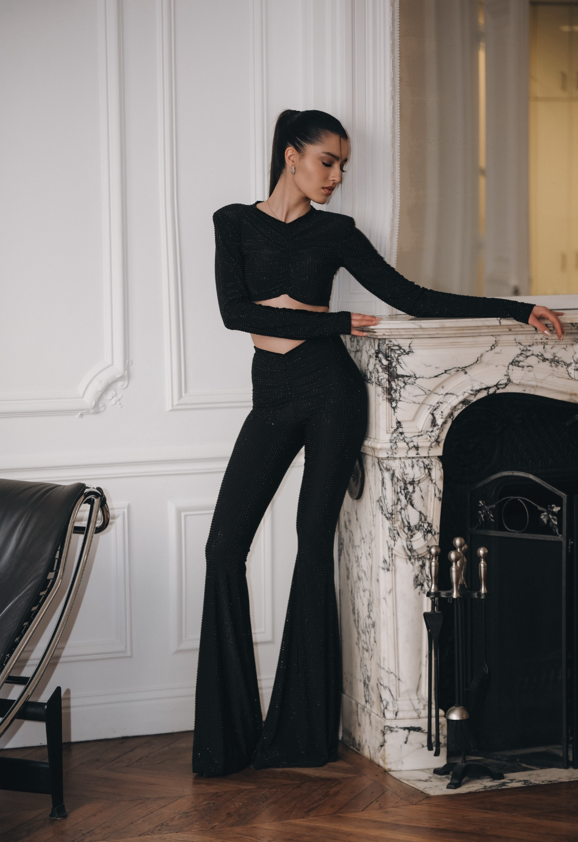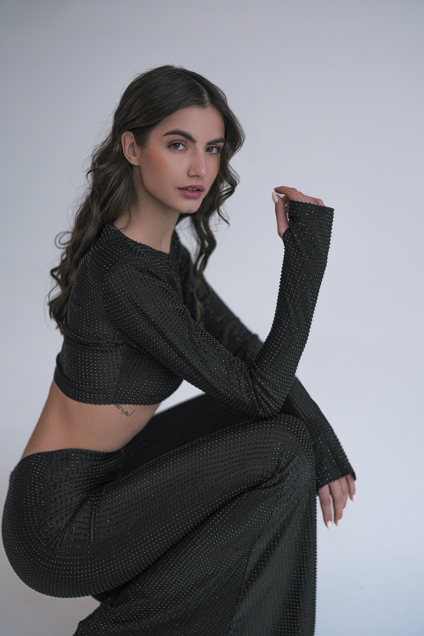 Елегантен комплект, съчетаващ плътно прилепващ топ с дълги ръкави и панталони с разкроена долна част. Моделът е с изтънчен дизайн и покритие от малки бляскави елементи, които добавят нотка лукс и завършеност на визията. Еластична и удобна за носене материя.