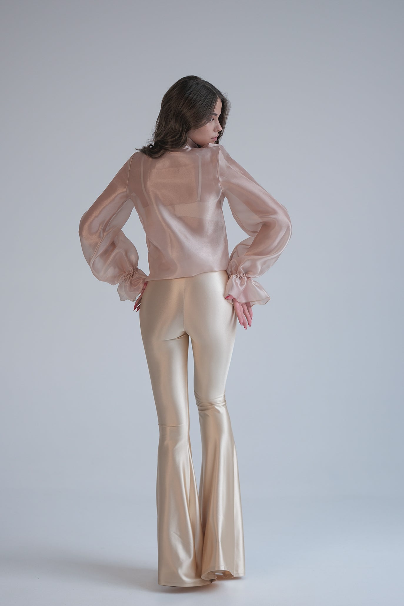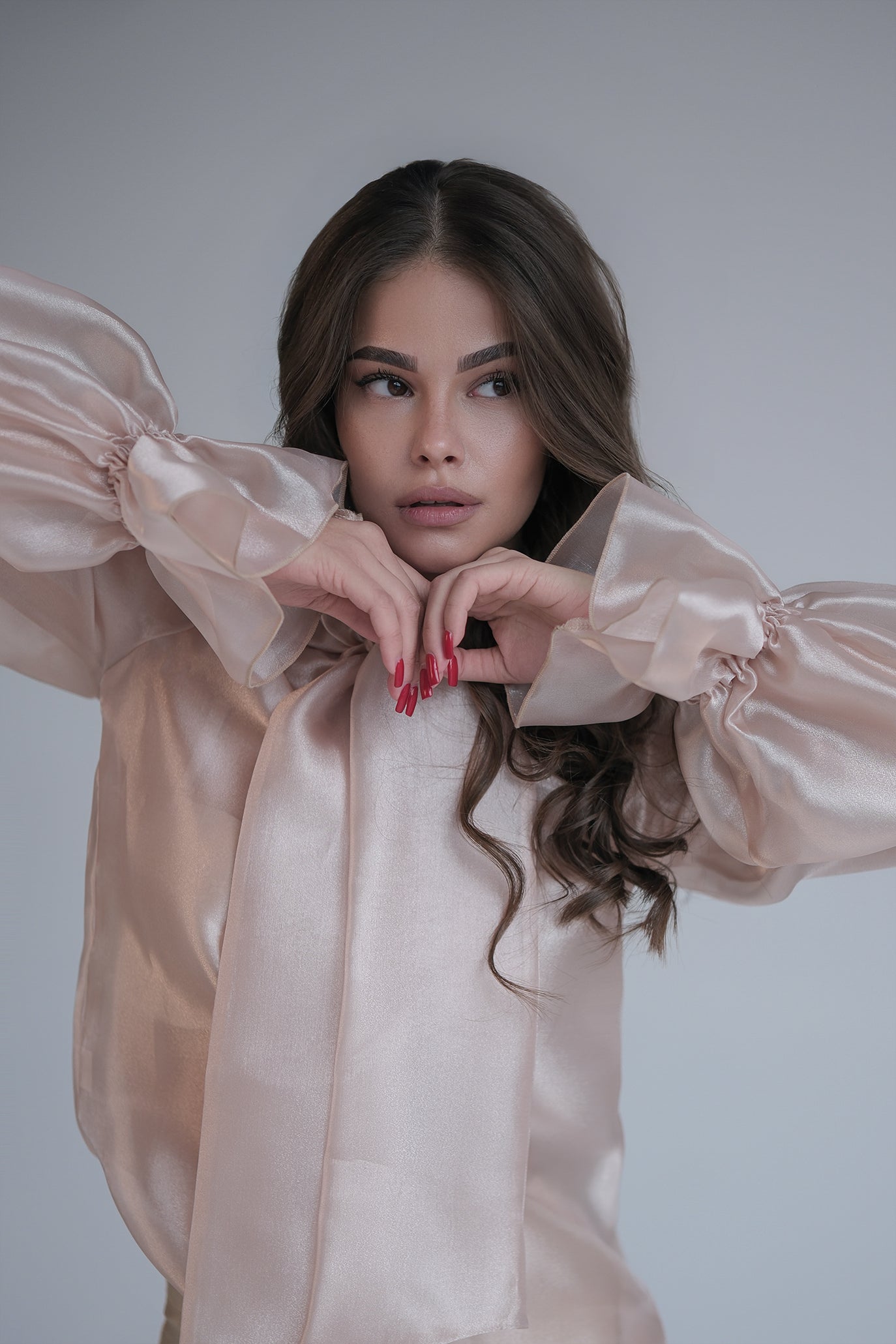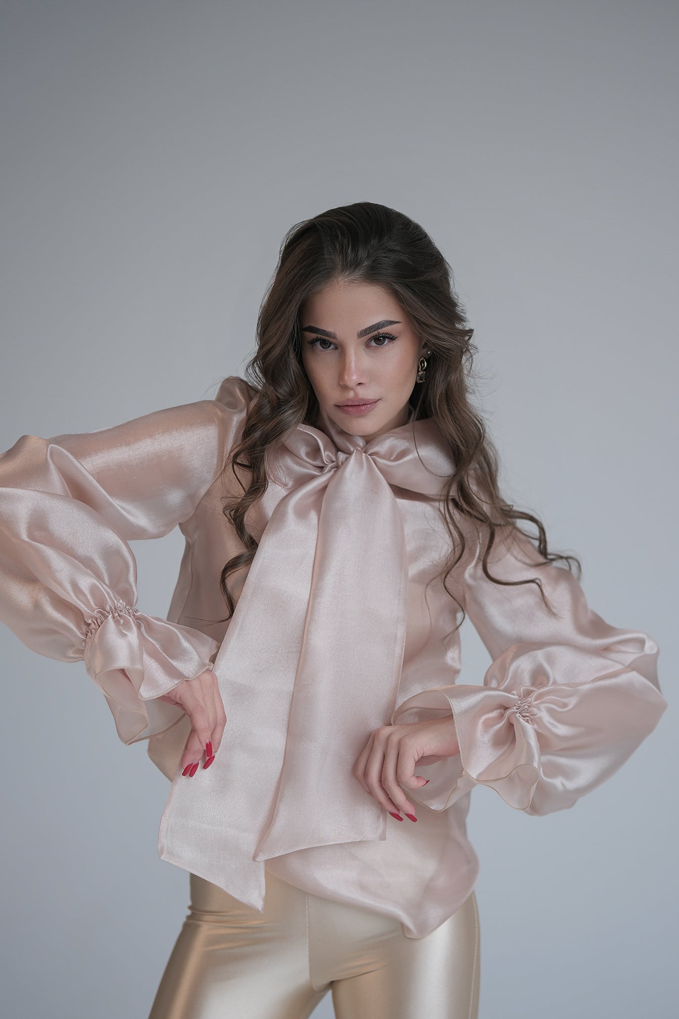 Блуза с дълъг ръкав, изработена от деликатен полупрозрачен и проветрив текстил, придаващ луксозен и ефирен вид. Акцентът е голяма панделка на врата, което добавя нестандартност на визията. Дизайнът е с леко обемни ръкави, които завършват с маншети, акцентирани с копчета. Може да се комбинира както с панталон, така и с пола, за да се създаде завършен и елегантен тоалет.