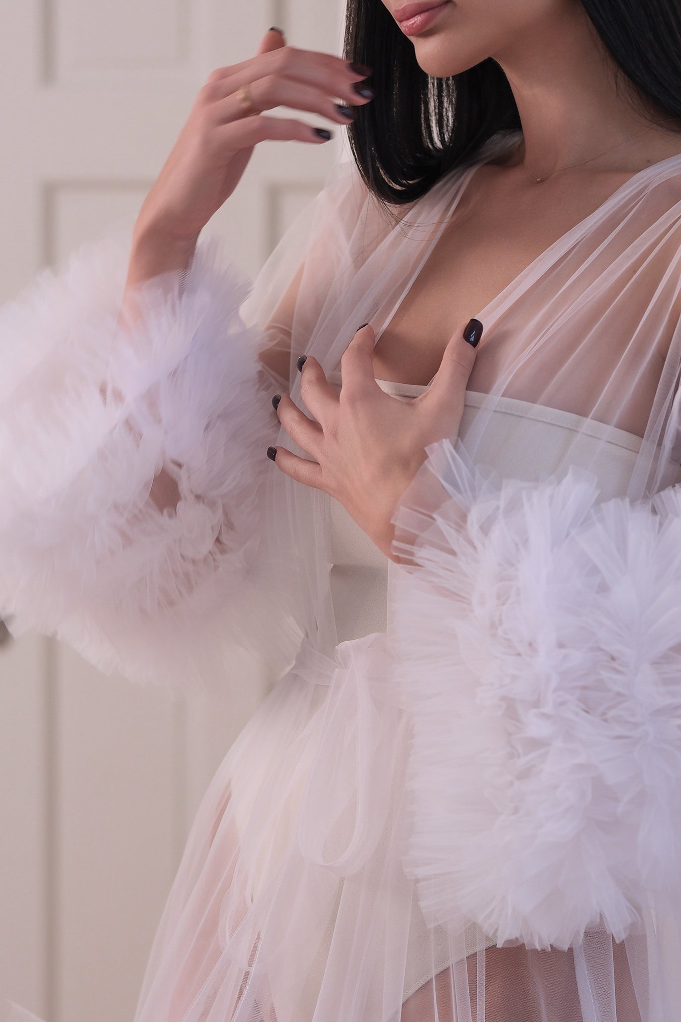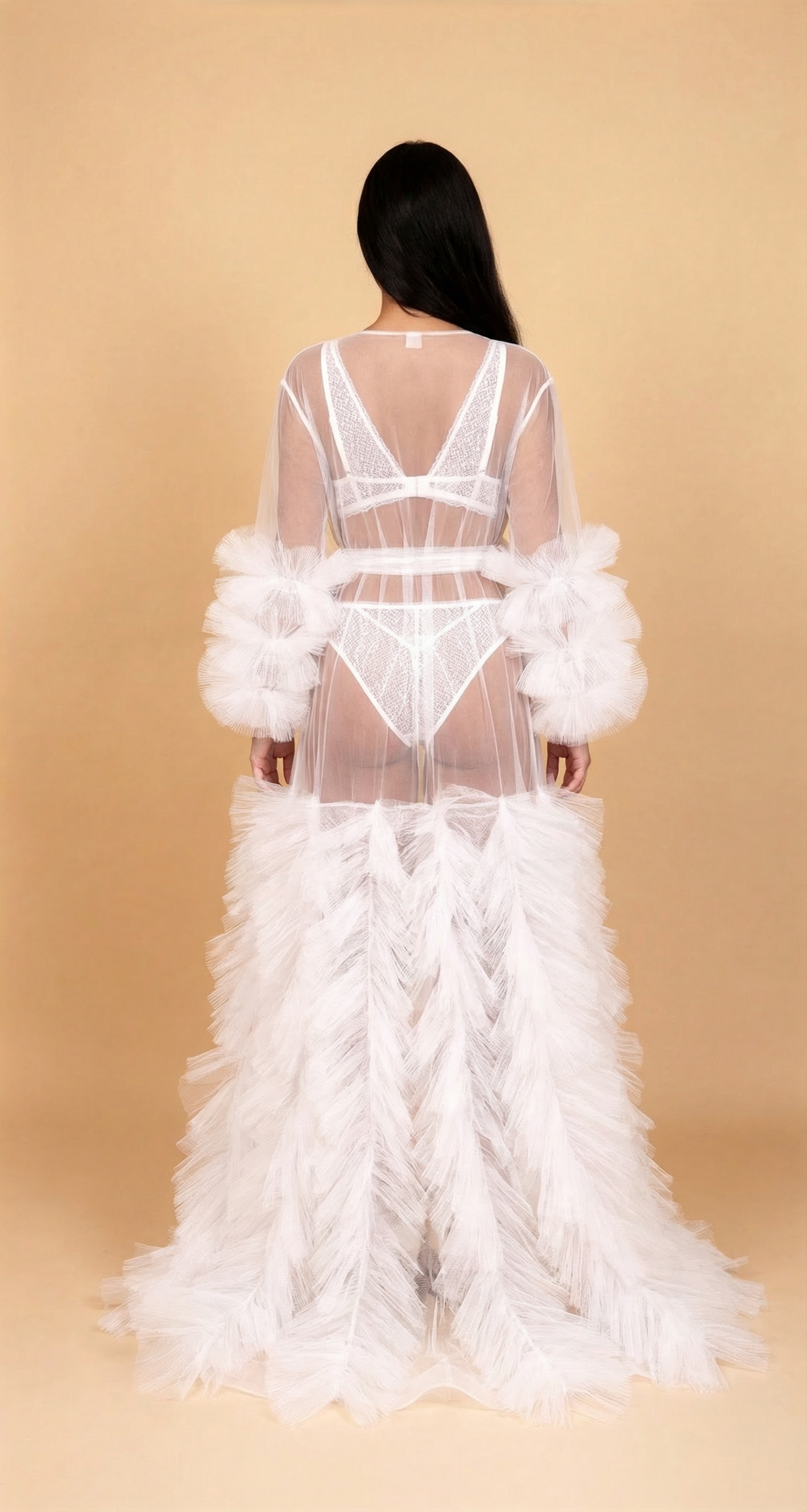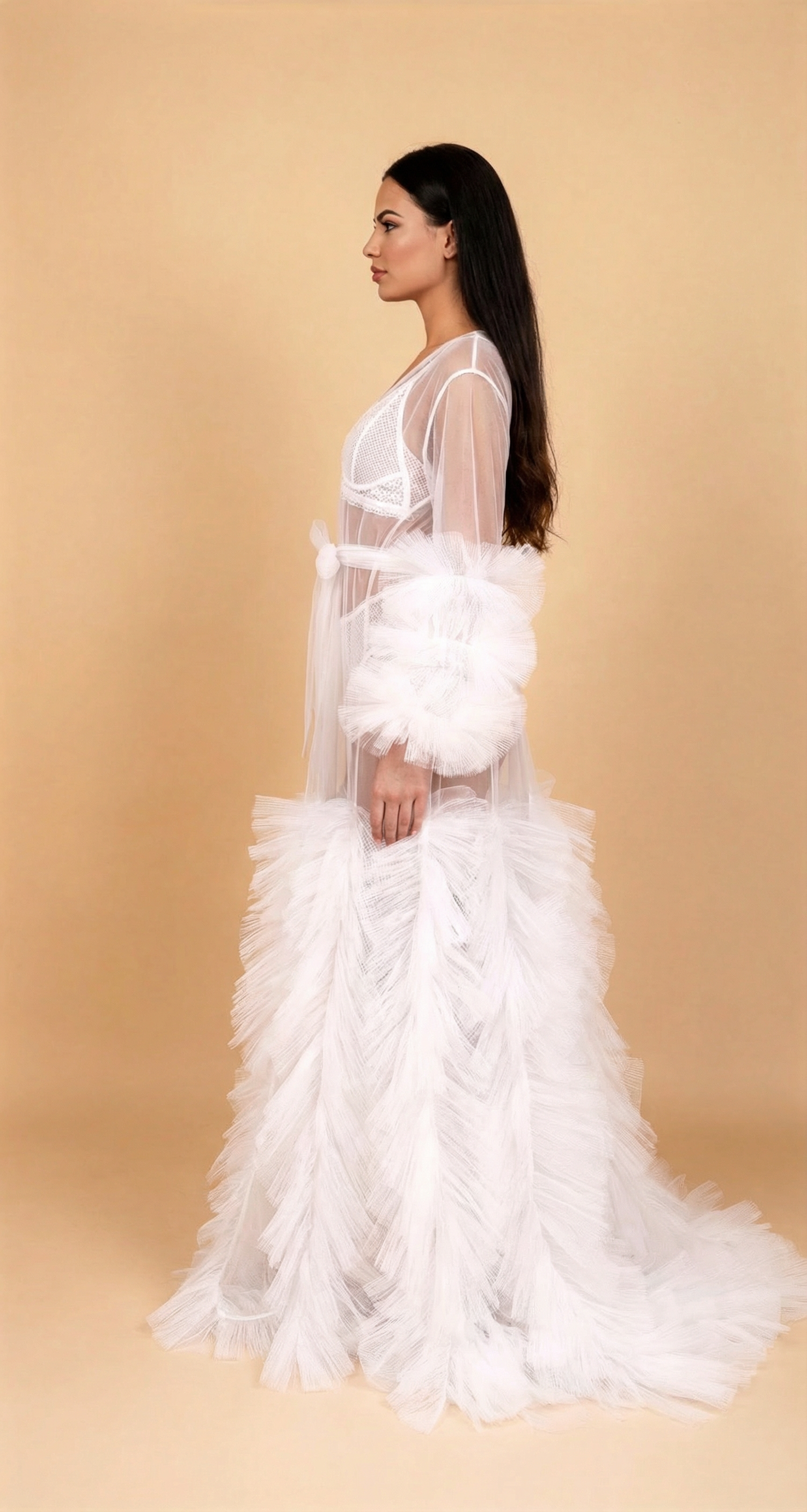 Луксозен дълъг халат от многослоен тюл, който впечатлява с изключителна лекота, обем и сценично излъчване. Ръкавите са оформени с тюлени волани, придаващи обем и ефирност при движение. Цялата дължина е декорирана с ръчно подредени тюлени пера, които създават уникален текстуриран ефект и движение. Прозрачната структура на халата позволява да се носи както върху бельо, така и като акцент към фотосесии, сватбени подготовки или специални моменти. Коланът от тюл подчертава талията и завършва визията с нежна женственост.