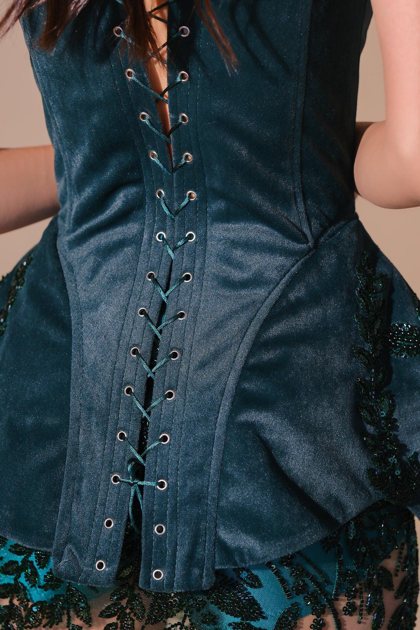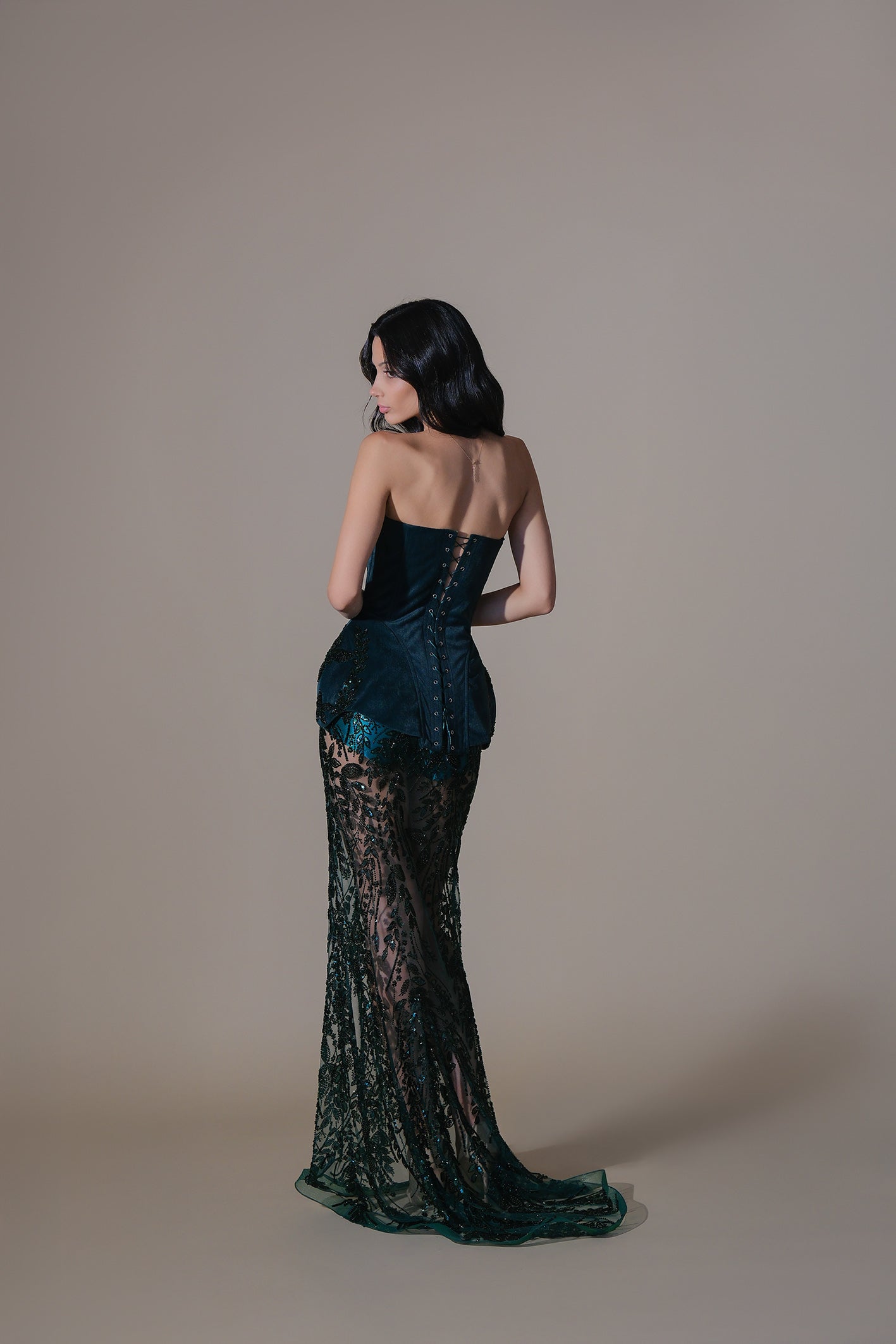 Впечатляваща вечерна рокля, изцяло ръчно изработена. Горната част е тип корсет от кадифе с твърда структура, нестандартна издължена форма и връзки на гърба, които осигуряват перфектно прилягане към тялото. Долната част е оформена в свободна пола от блестящ полупрозрачен плат, създаващ ефект на движение и блясък. Роклята подчертава силуета и добавя доза изтънчена елегантност. Ексклузивен модел.