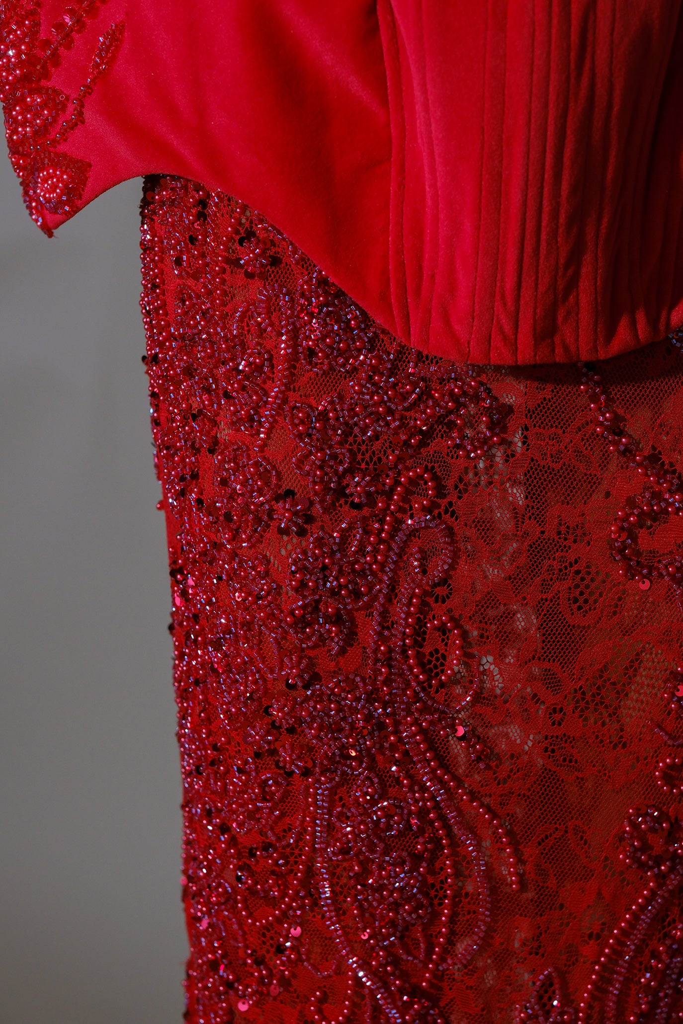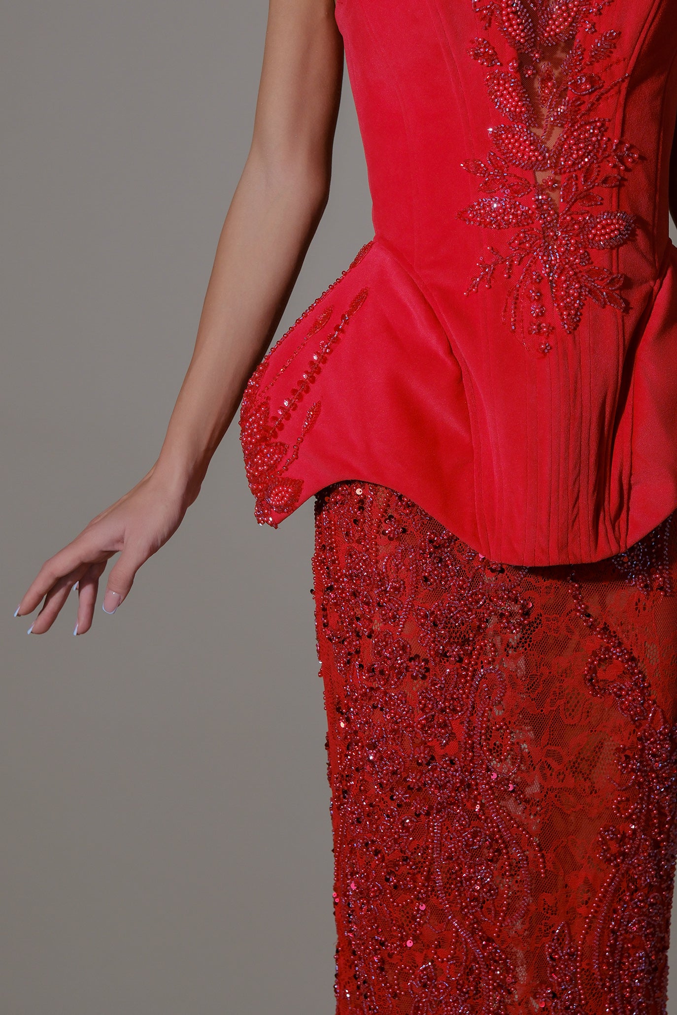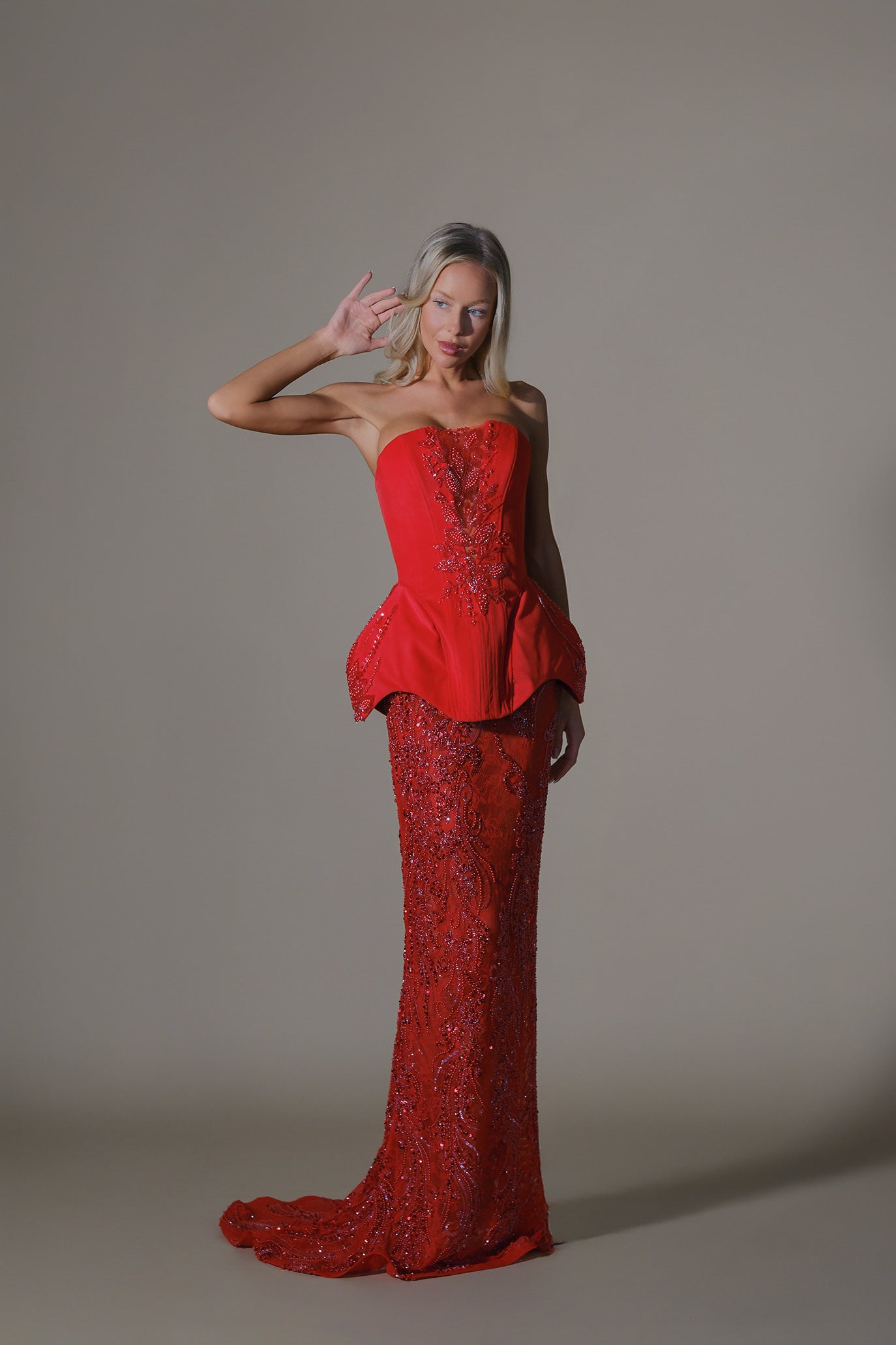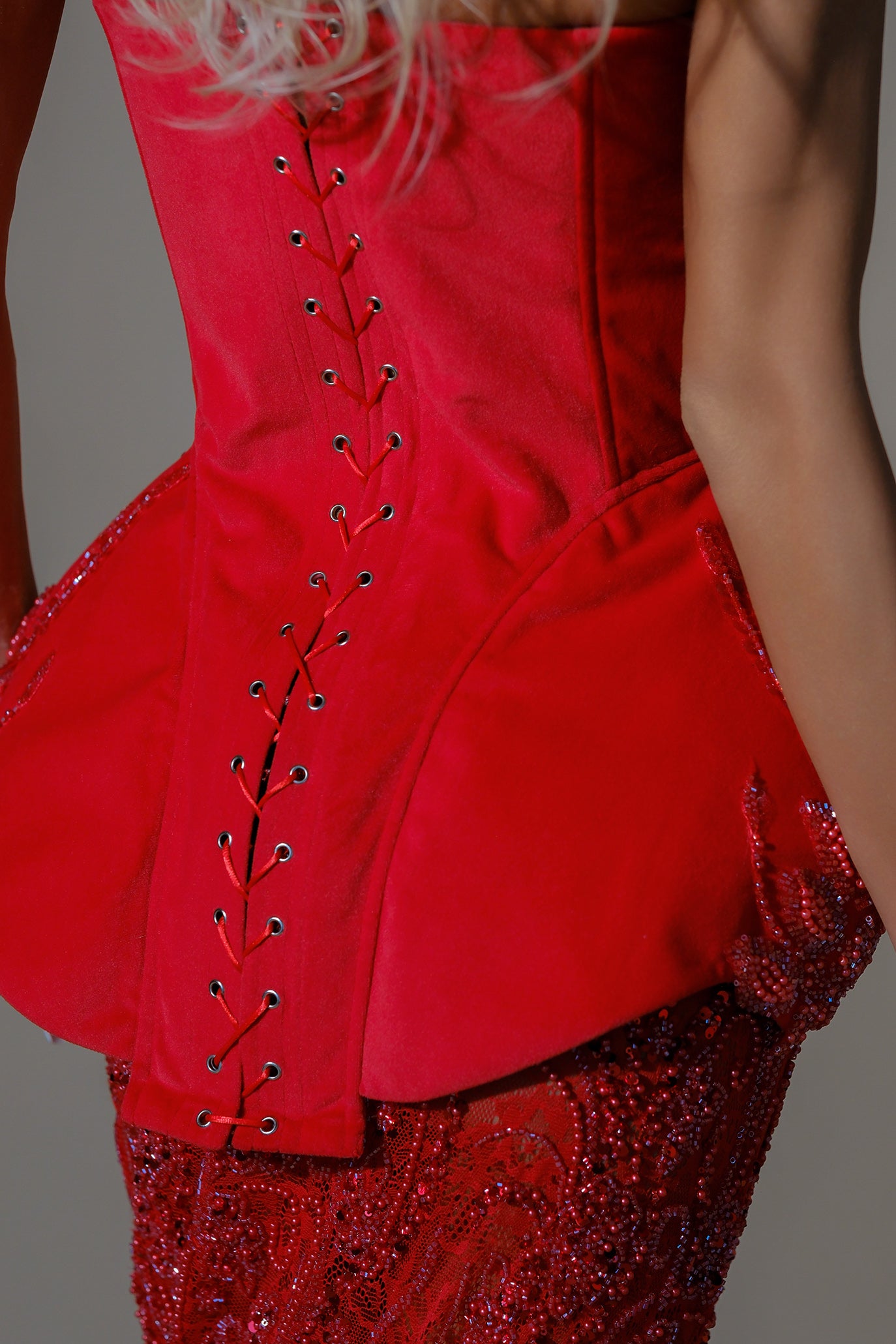 Впечатляваща вечерна рокля, изцяло ръчно изработена. Горната част е тип корсет от кадифе с твърда структура, нестандартна издължена форма и връзки на гърба, които осигуряват перфектно прилягане към тялото. Долната част е оформена в свободна пола от блестящ полупрозрачен плат, създаващ ефект на движение и блясък. Роклята подчертава силуета и добавя доза изтънчена елегантност. Ексклузивен модел.