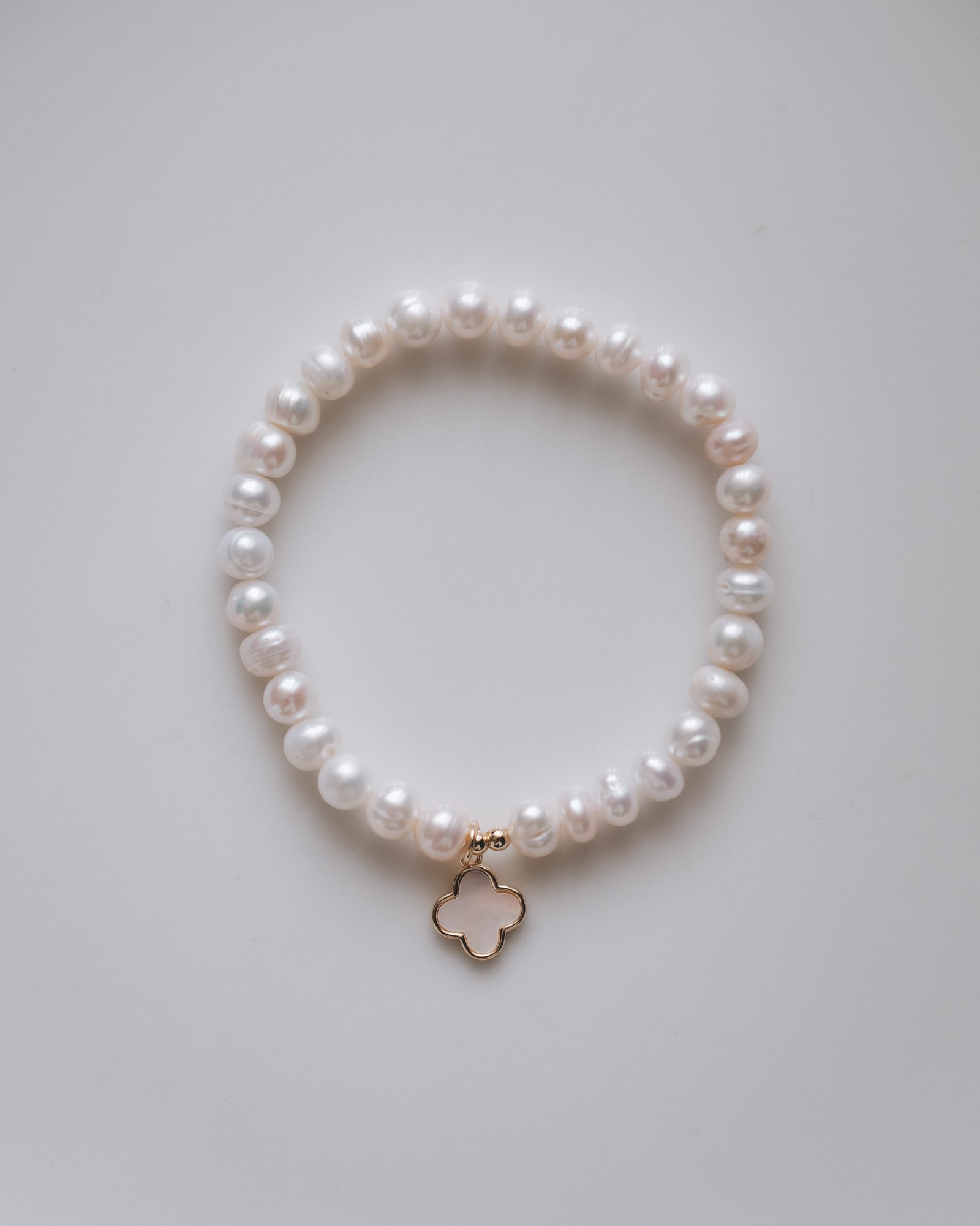 Елегантна гривна, изработена от перли с нежен перлен блясък, допълнена от деликатен златист акцент във формата на детелинка. Лека и удобна за носене, гривната е стилен завършек към всяка женствена визия.