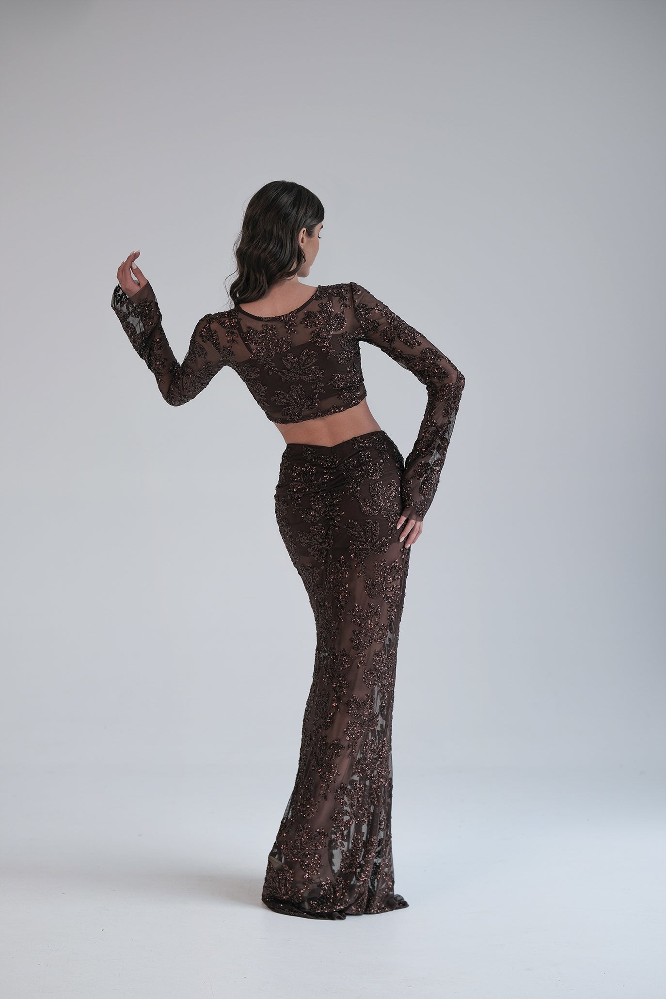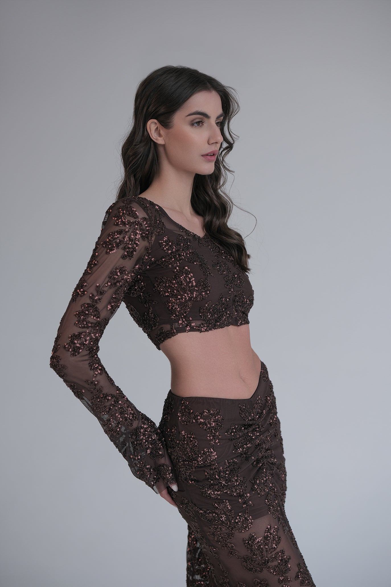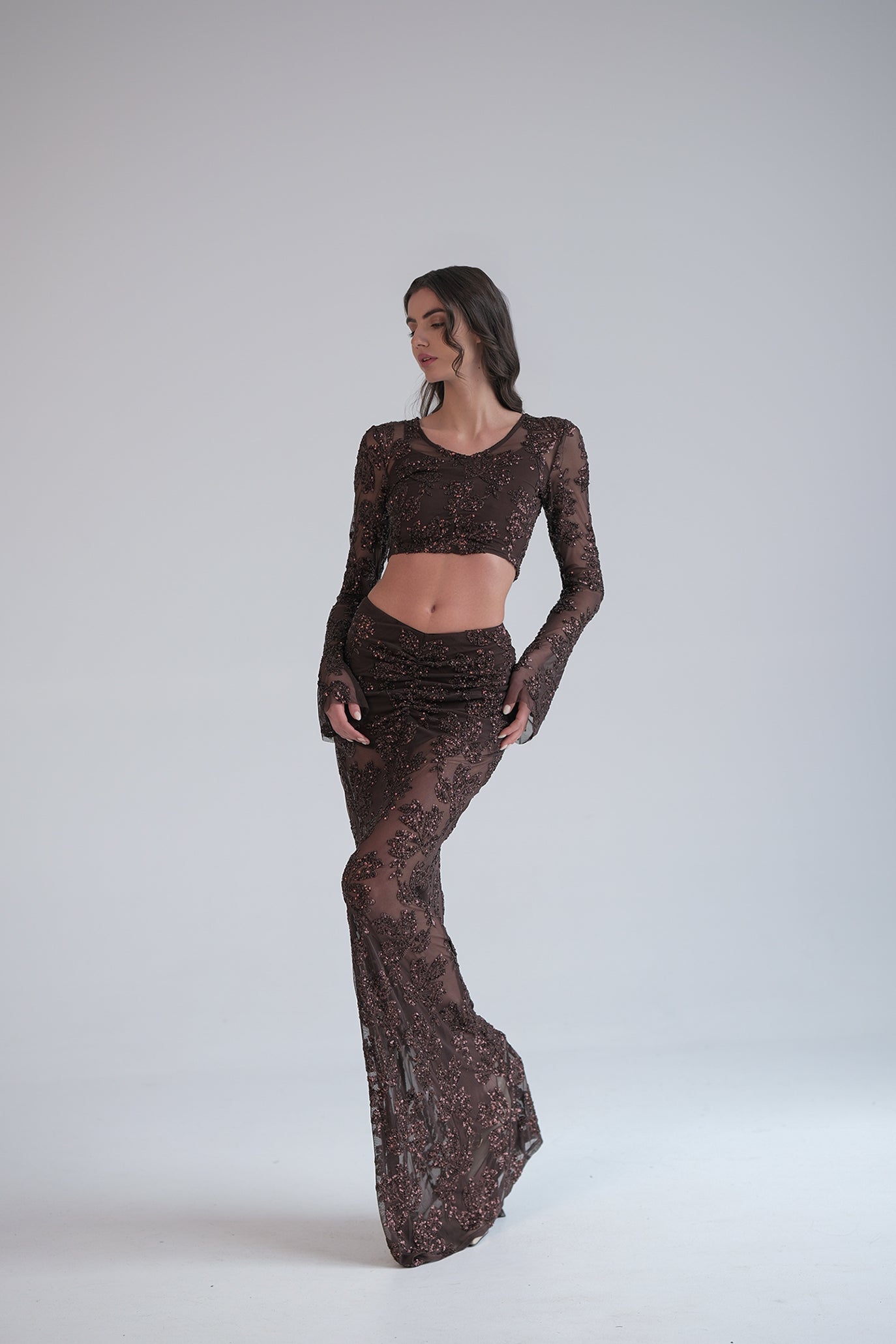 Сет от топ и пола с изваян, женствен силует. Изработени от много разтеглива, мека дантела с много приятен допир към тялото. И горната и долната част имат подплата, за да не прозират. Върху полата има леки набори отпред и отзад за още по-изваяна линия.