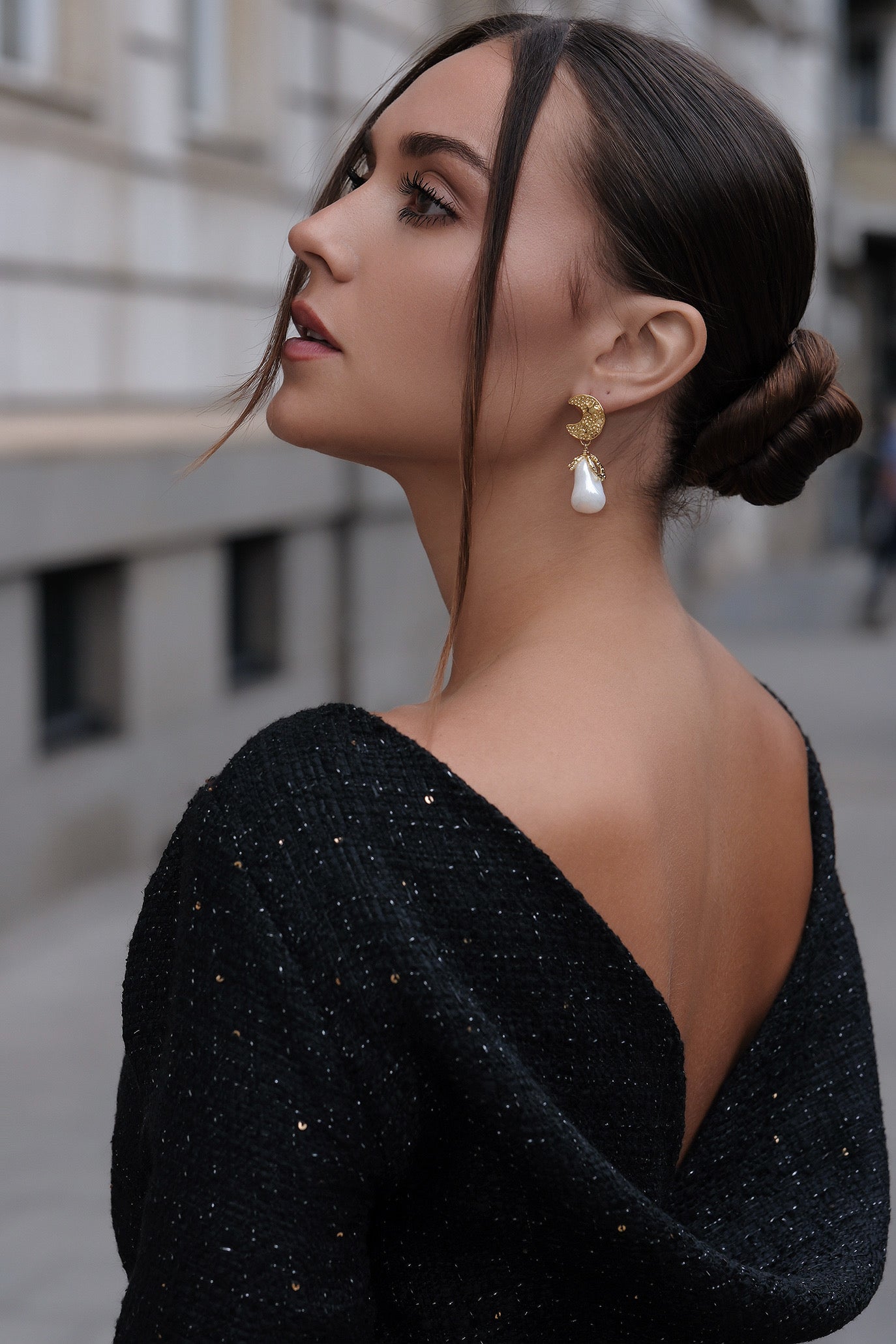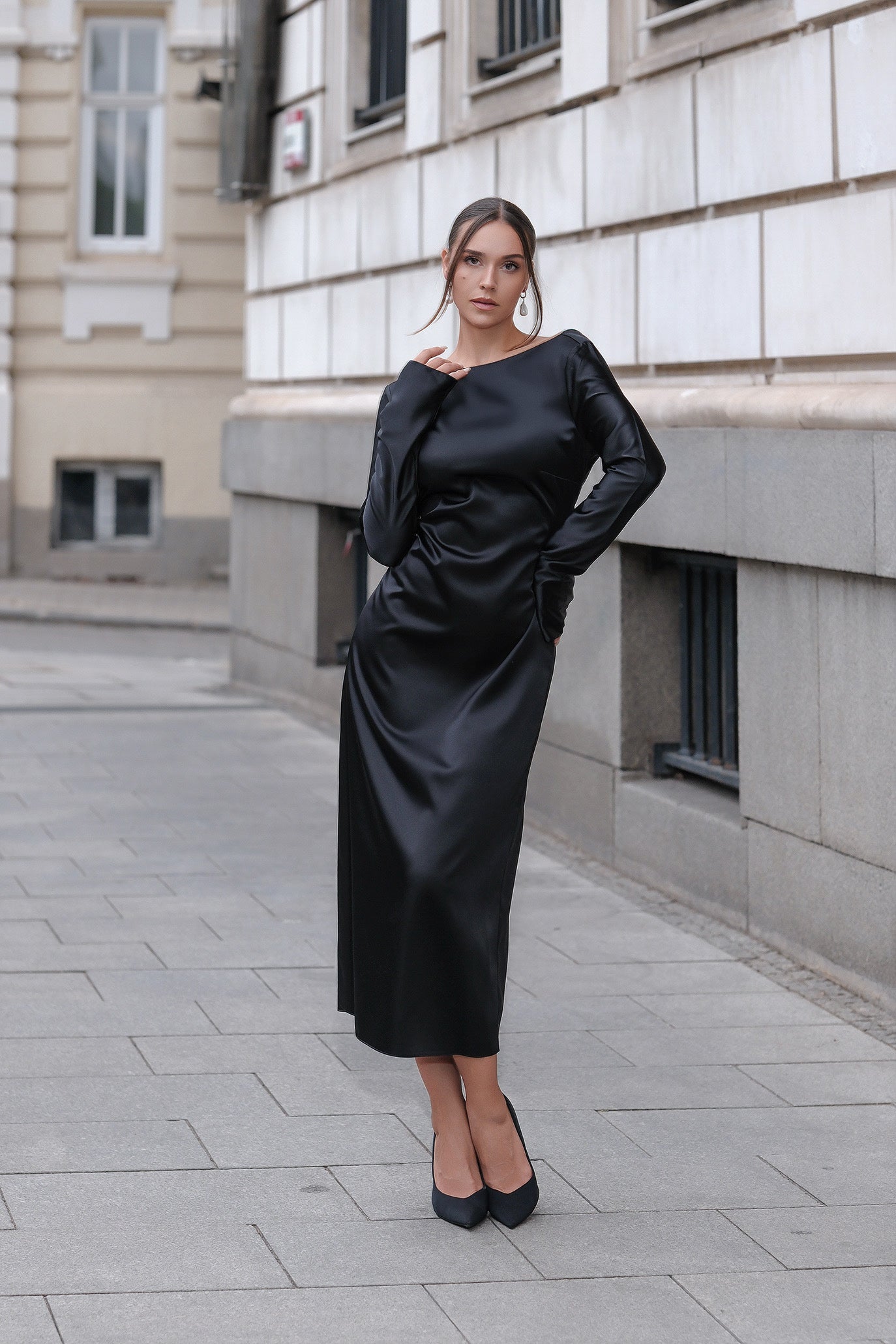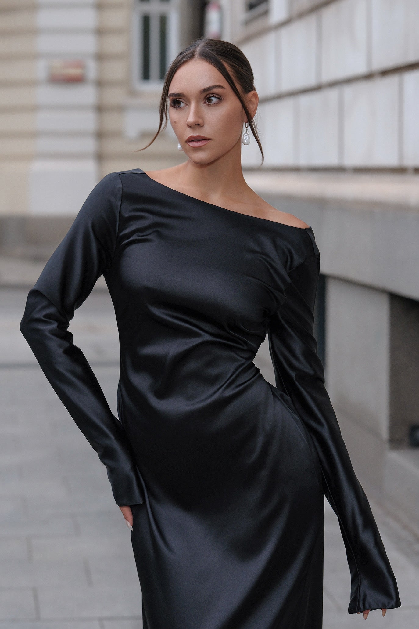 Минималистична, но въздействаща. Създадена от гладък сатен, който се движи с тялото. Предната част е с изчистено деколте, а гърбът впечатлява с дълбоко отворен гръб тип "водопад". Връзките за пристягане подчертават талията и позволяват индивидуално прилягане. Удължените ръкави са елегантни и удобни.