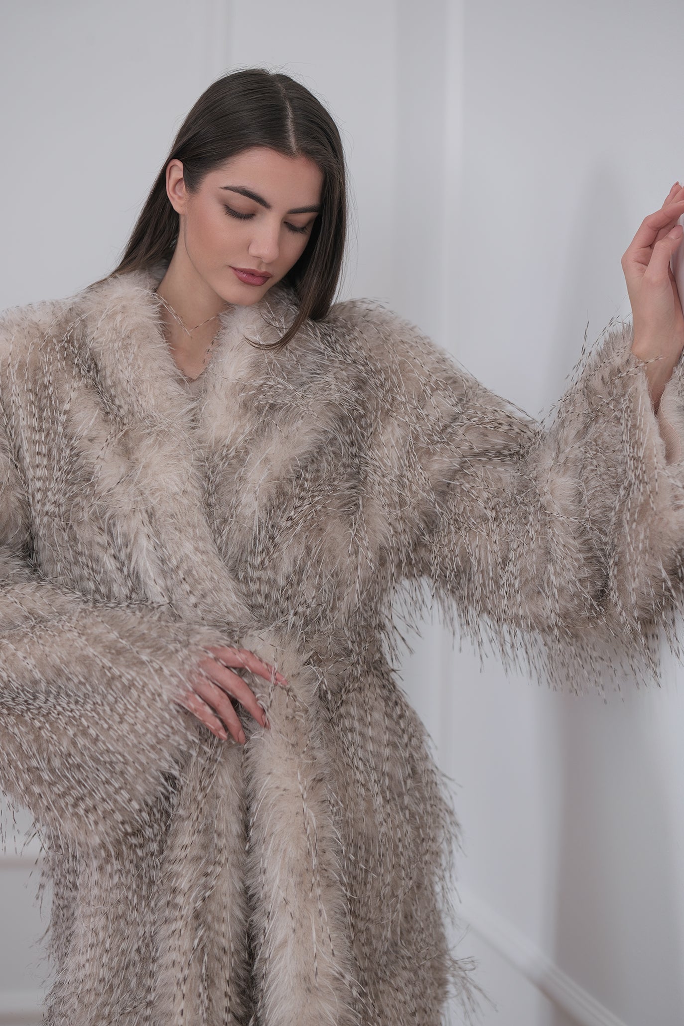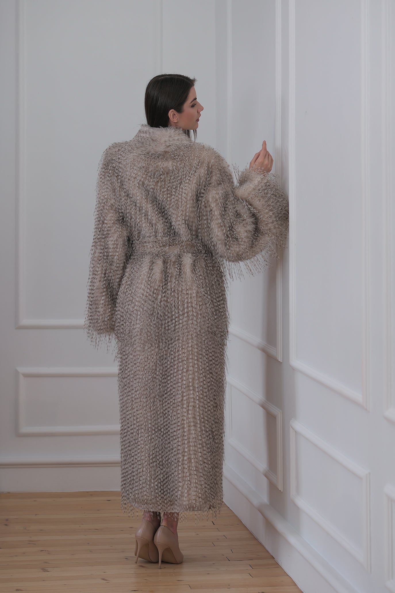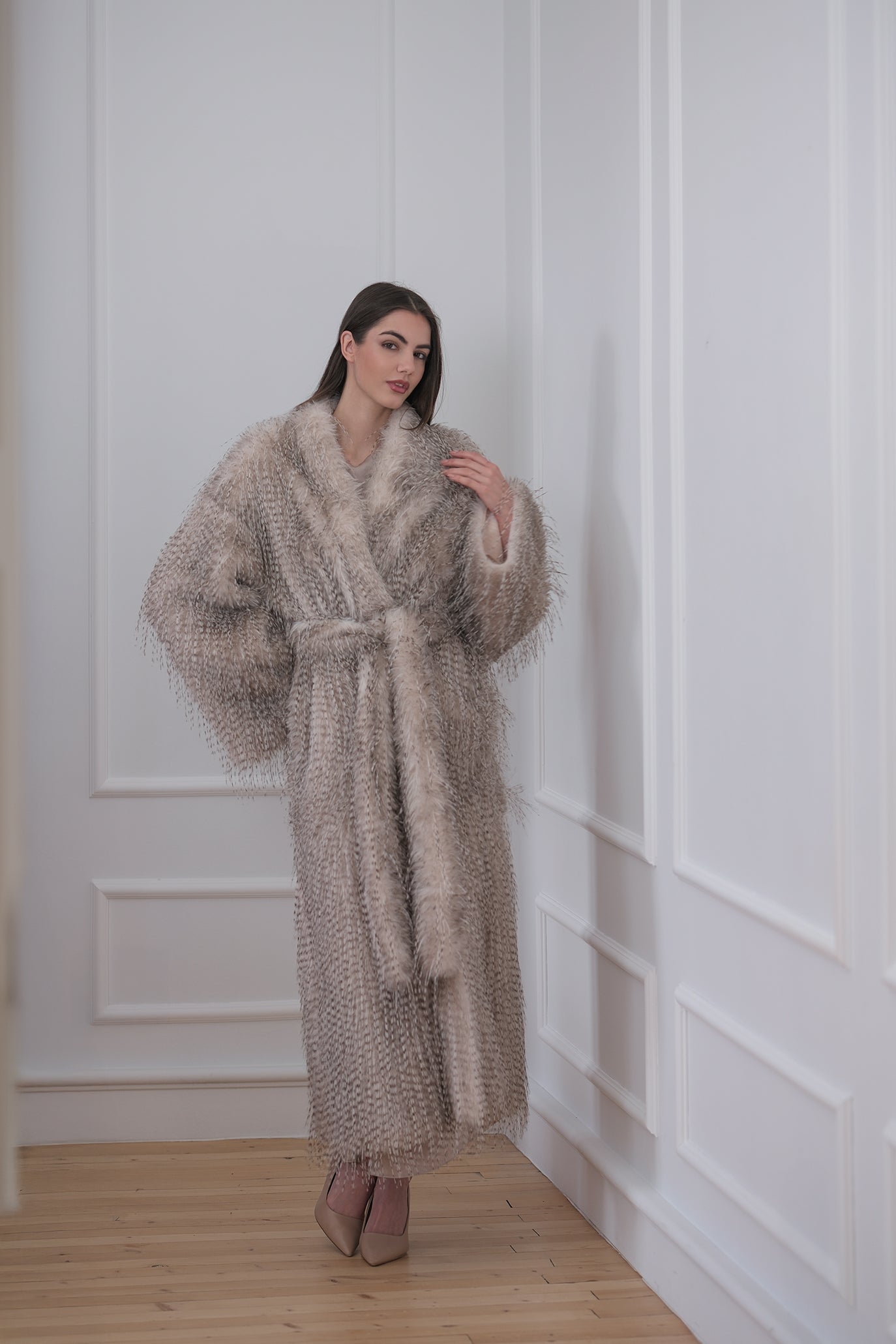 Ефектно дълго палто, изработено от специални ресни с ефект на бодливо свинче. Коланът подчертава талията. Дължина до глезена и леко движение при всяка стъпка. Идеален завършек върху рокли, костюми и гащеризони. Дължина на палтото - 130см.