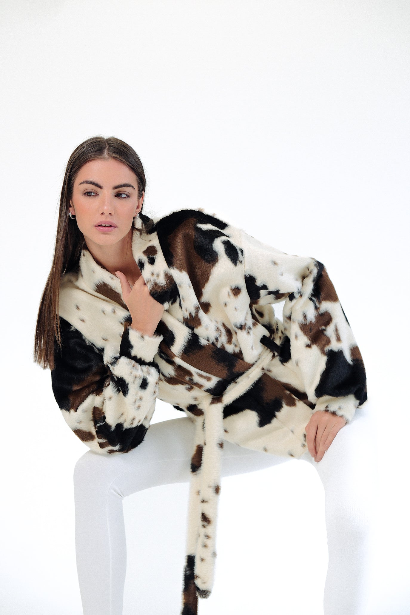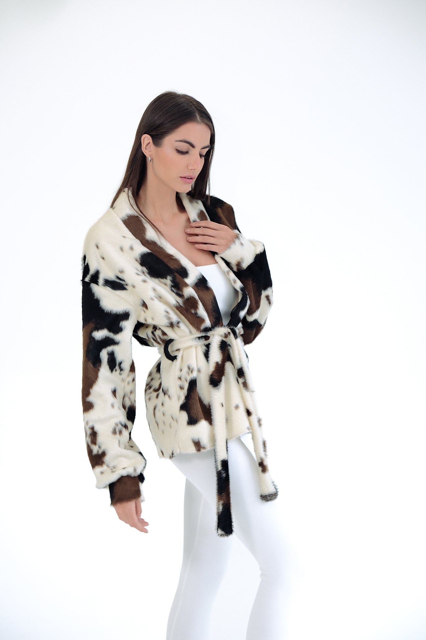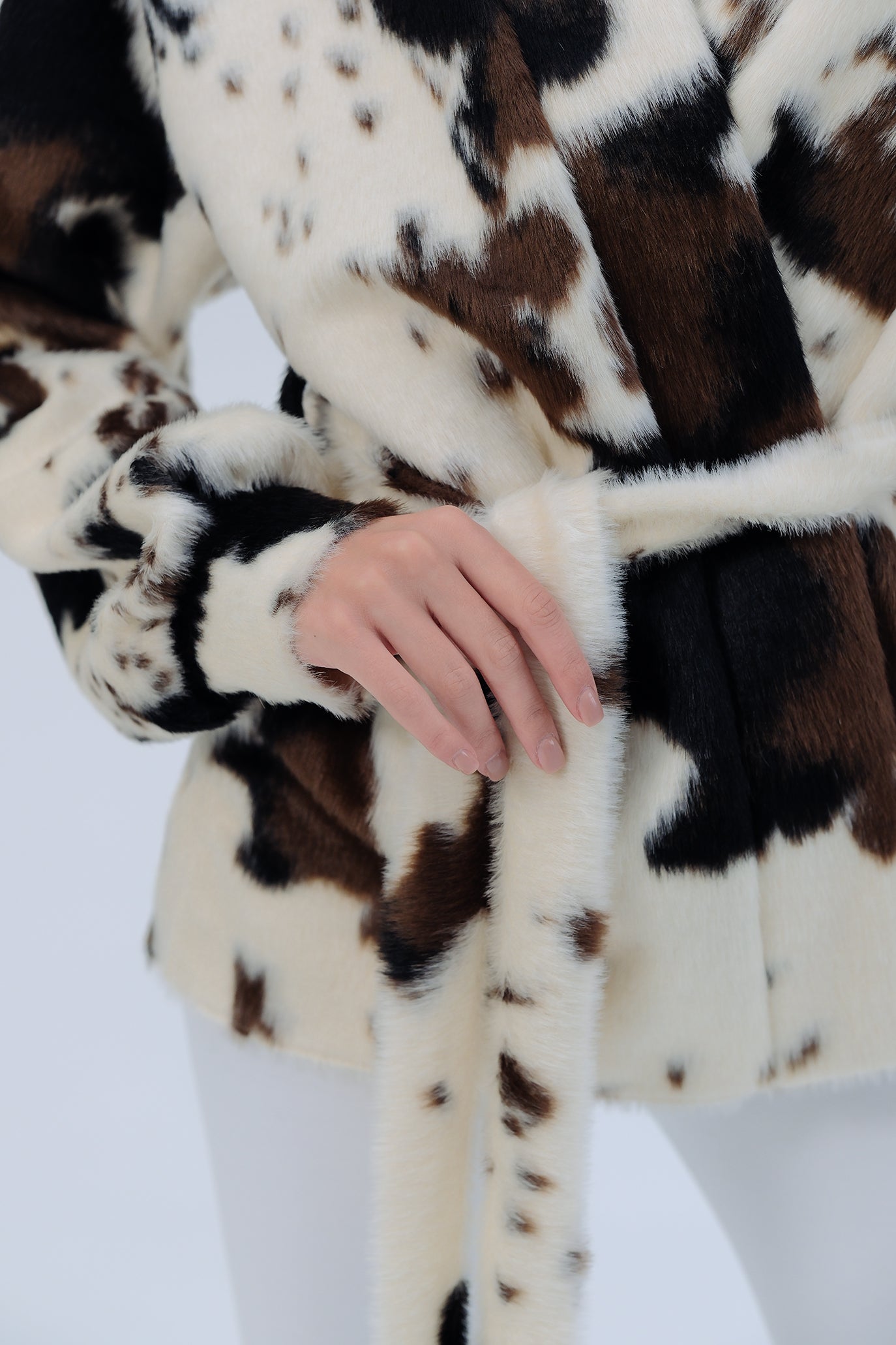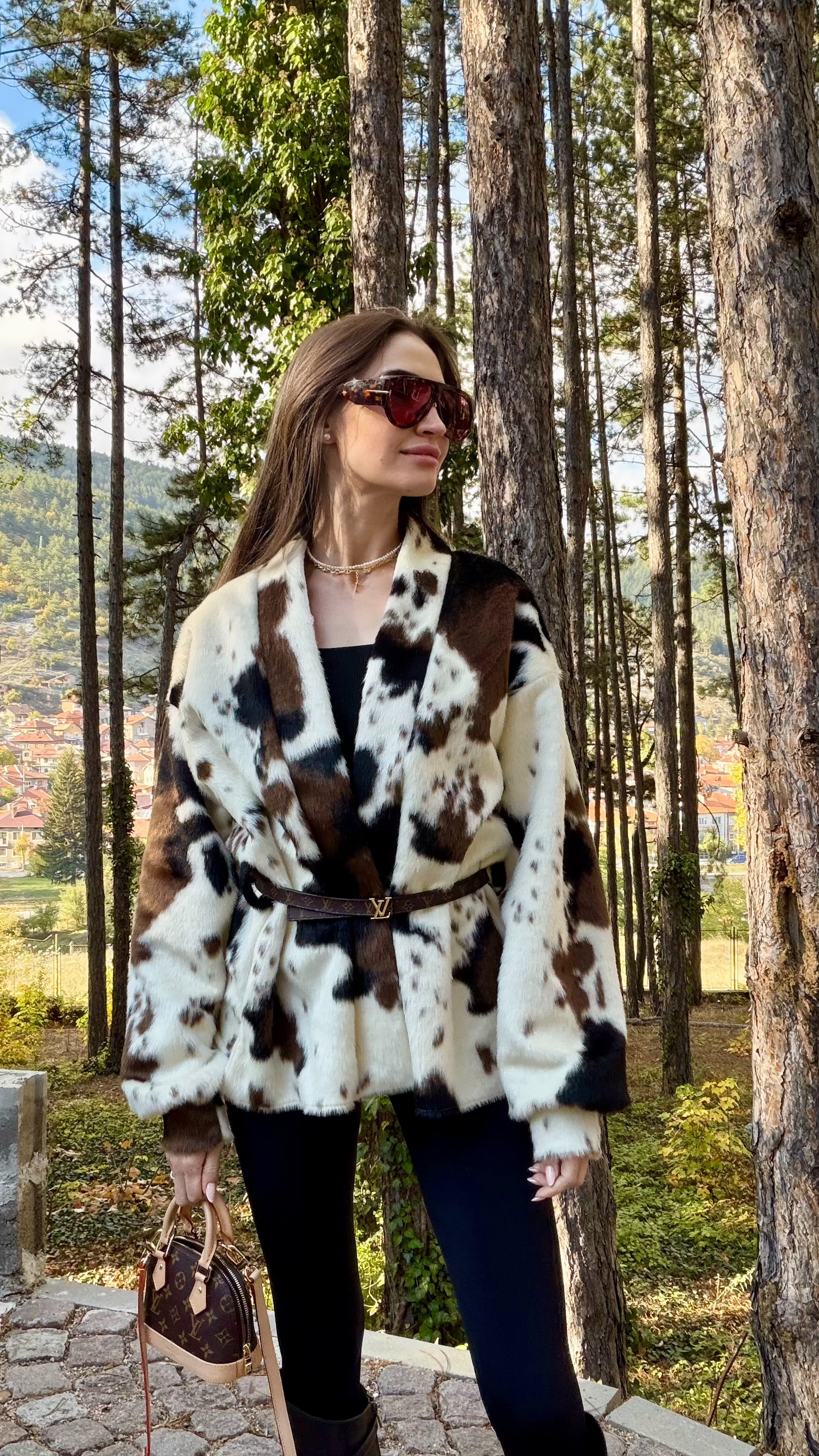Късо палто от луксозен еко пух с ефектен animal принт. Мекият косъм осигурява топлина и комфорт, без утежняване. Класическа права линия с паднало рамо и обемна яка. Коланът подчертава талията и позволява индивидуално прилягане – носете свободно разкопчано за relaxed визия или пристегнато за елегантен силует. Перфектно за градски стил и вечерни излизания. Един универсален размер.