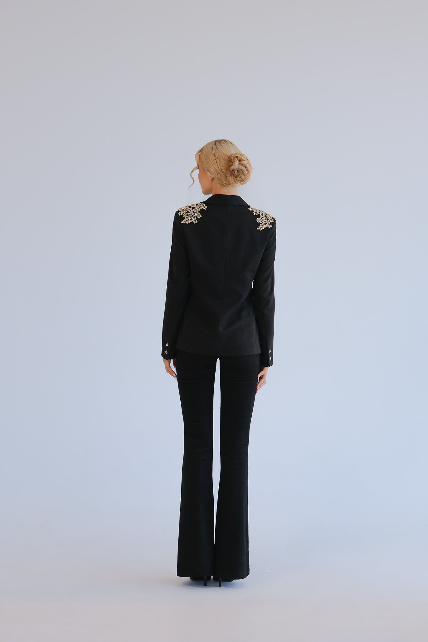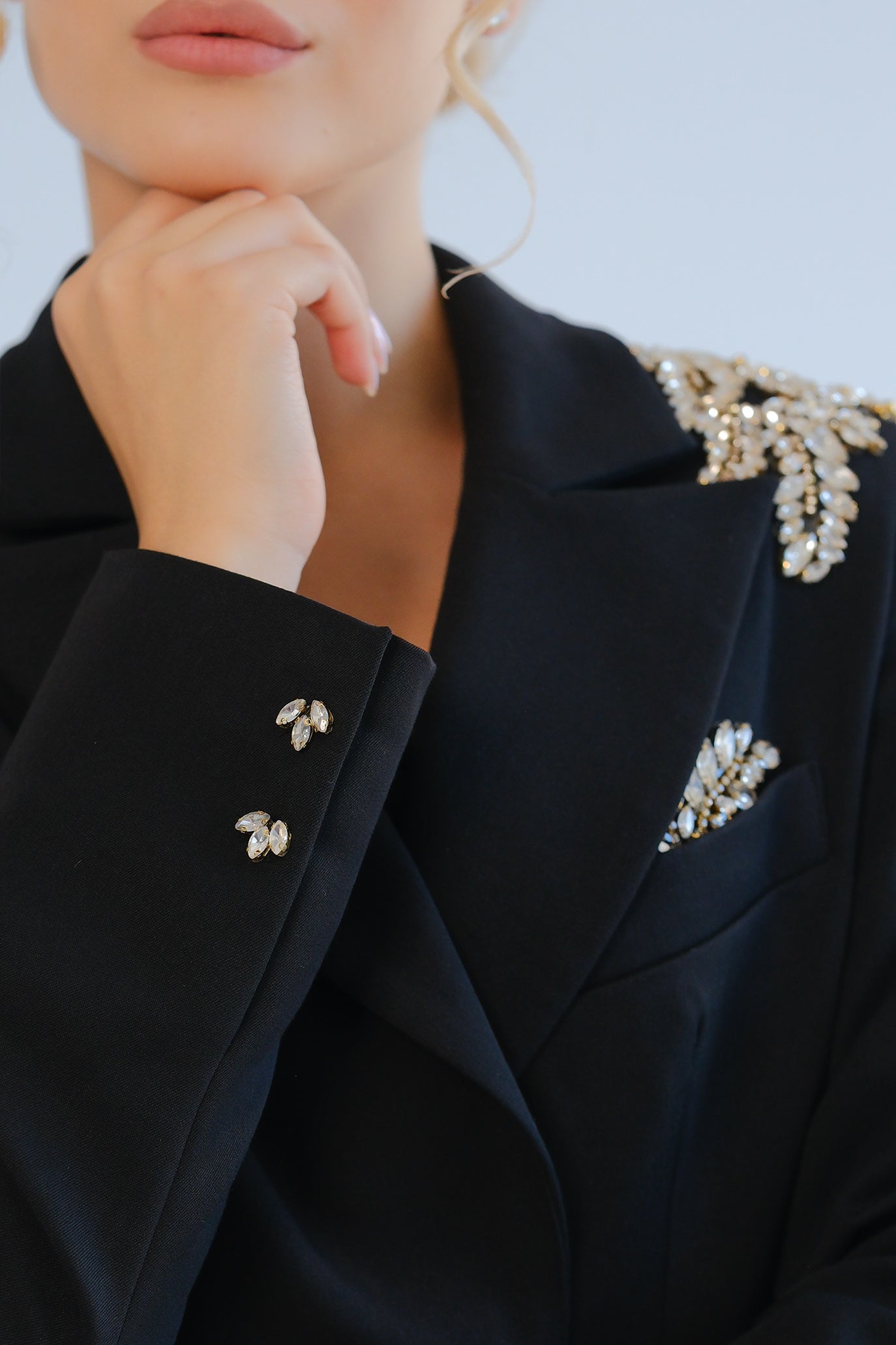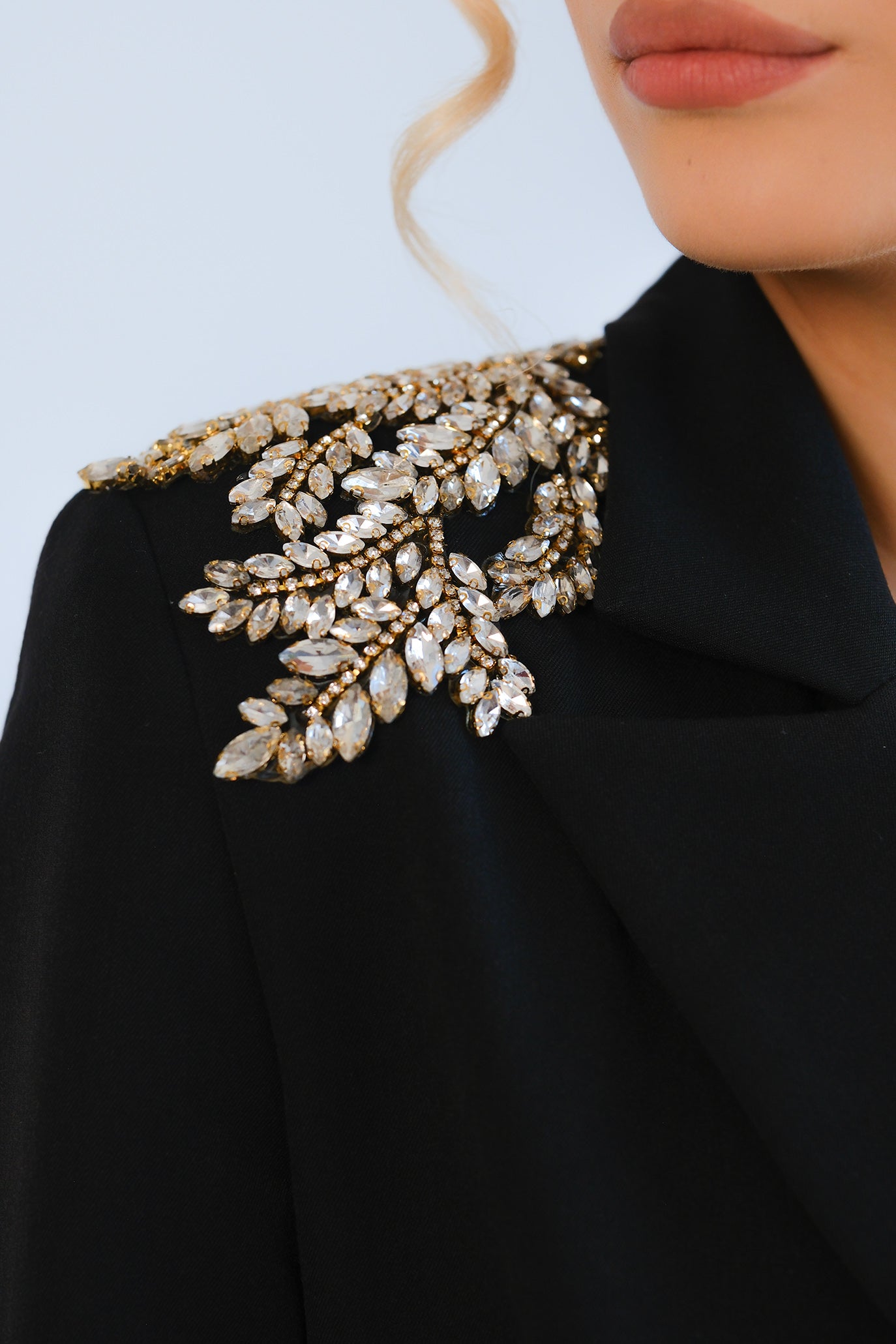 Сако за модерна, женствена версия. Дългото сако е със скулптурирани реверни и метални копчета оформя раменете. Материята е с плътност и еластичност за добро прилягане без ограничение в движенията. Има бляскав акцент на раменете с ръчно пришити камъни, които са залепени върху основа и след това пришити към сакото.