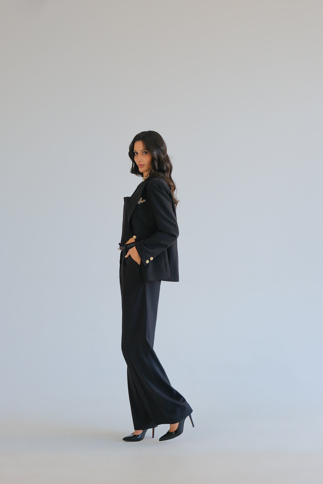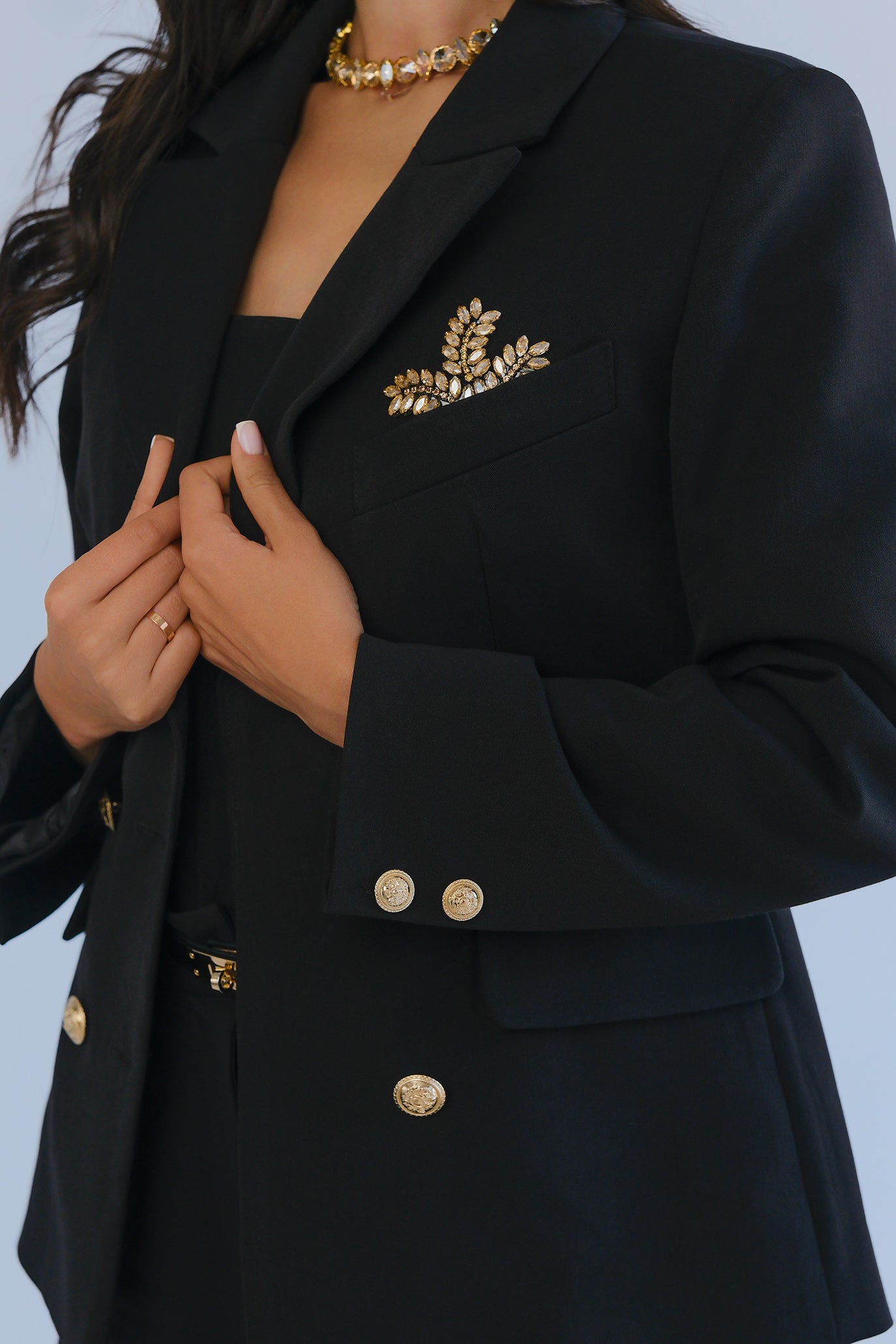 Сако за модерна, женствена версия. Дългото сако е със скулптурирани реверни и метални копчета оформя раменете. Материята е с плътност за добро прилягане без ограничение в движенията. Сакото е от висок клас на изработка. Кройката е тип овърсайз и леко по-дълго. Има подплата. Може да се закопчее отпред с копчета. Идеално за бизнес срещи или стилни вечерни събития. Има бляскав акцент на страничния джоб с ръчно пришити камъни, които са залепени върху основа и след това пришити към сакото.