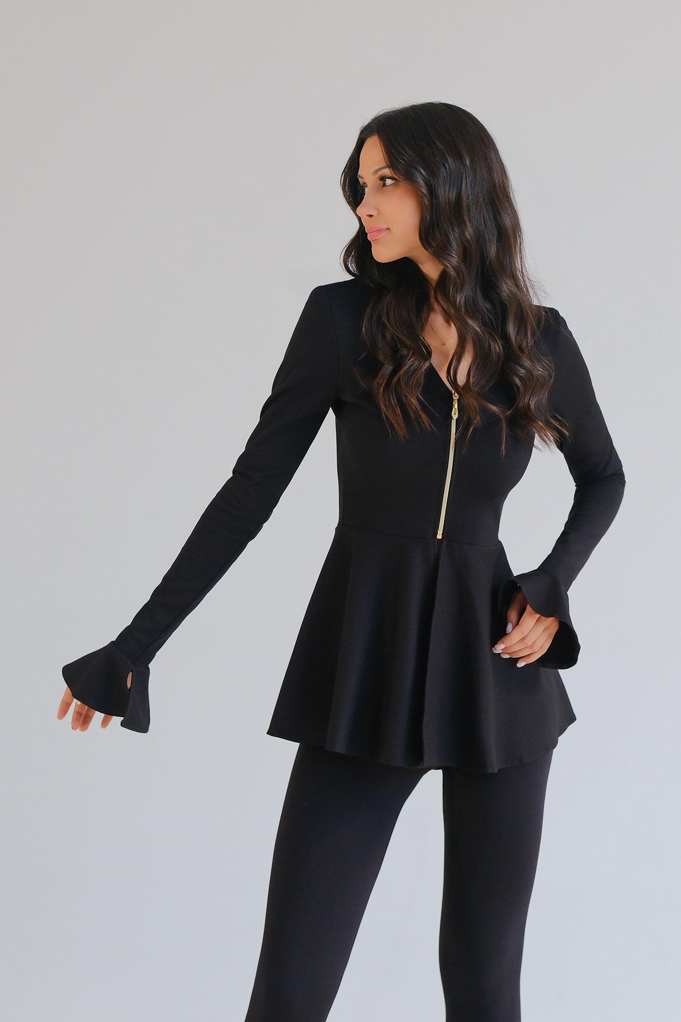 Сетът е създаден да моделира фигурата и да придава елегантен „пясъчен часовник“. Пеплумът балансира линията на ханша и визуално стяга талията, а детайлът от плат при глезена издължава крака и стои ефектно с ток или маратонка. Еластичната материя осигурява комфорт и прилягане.