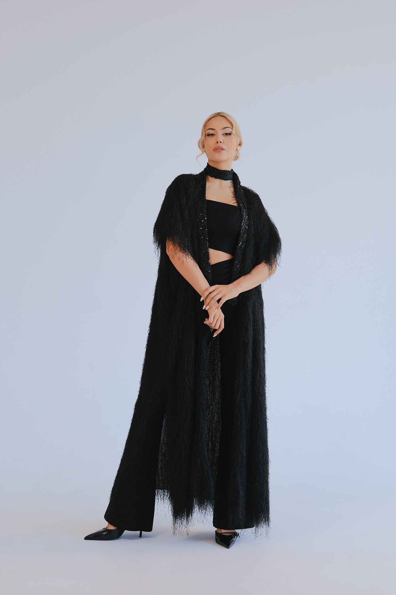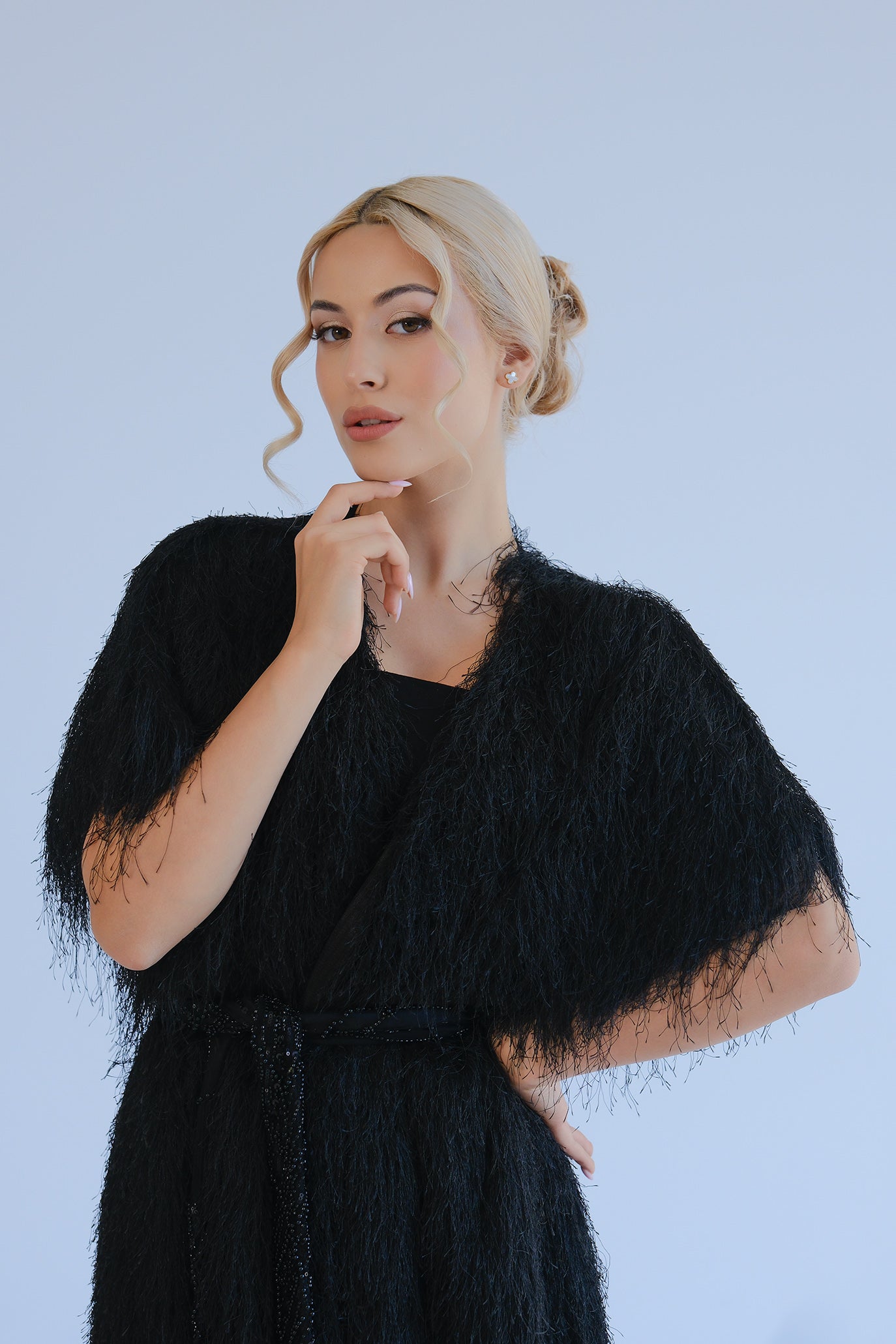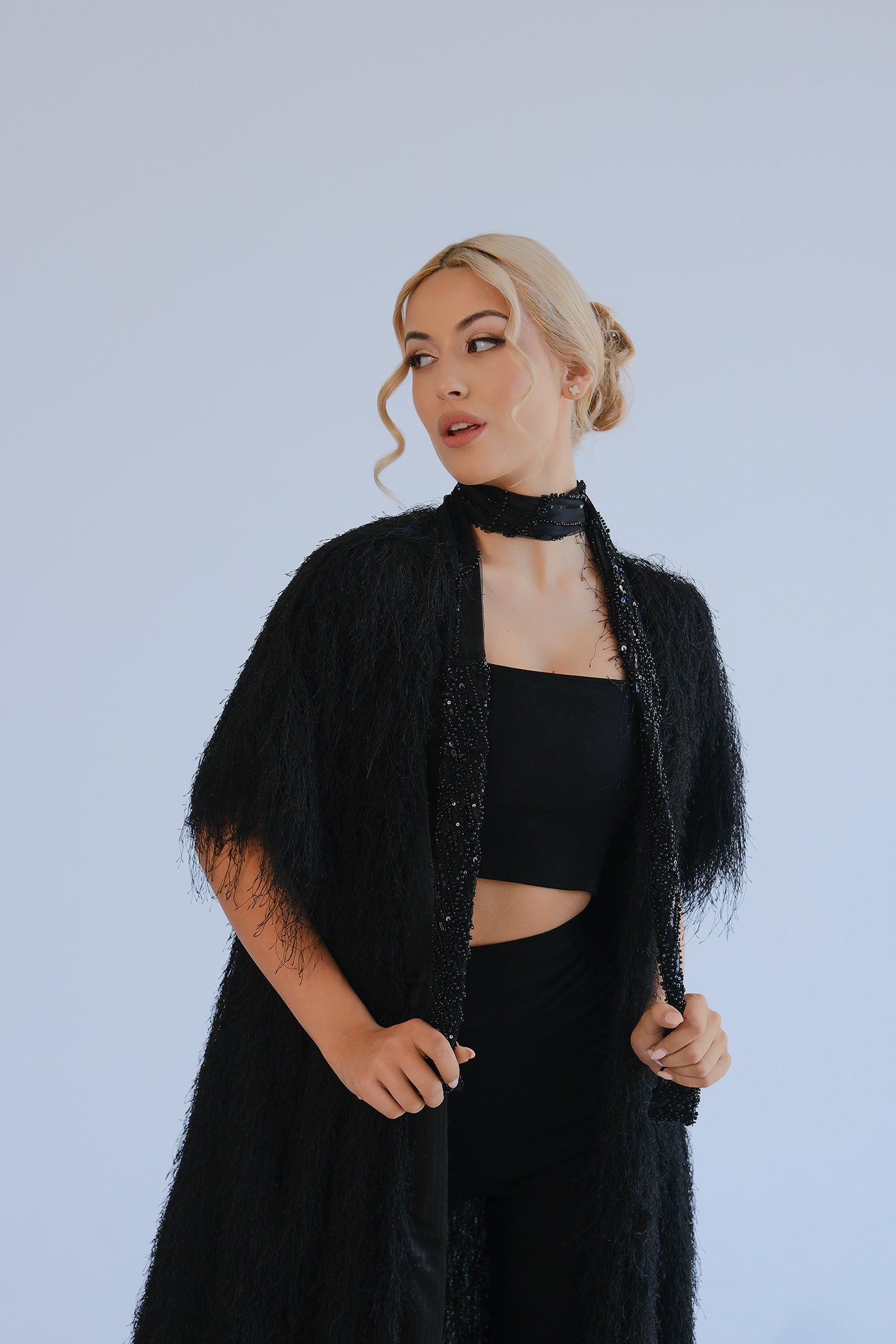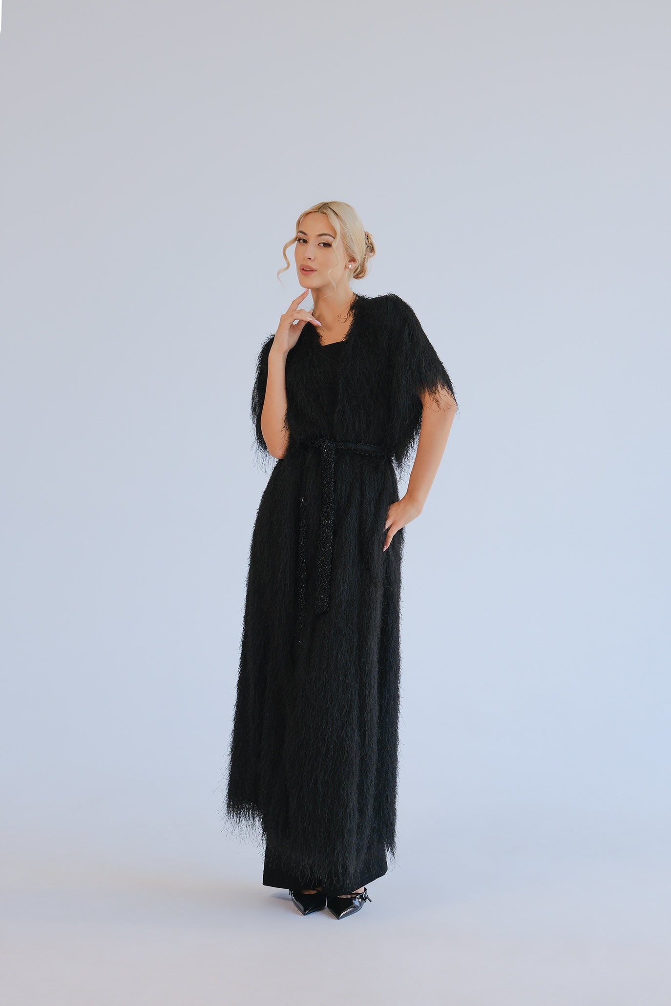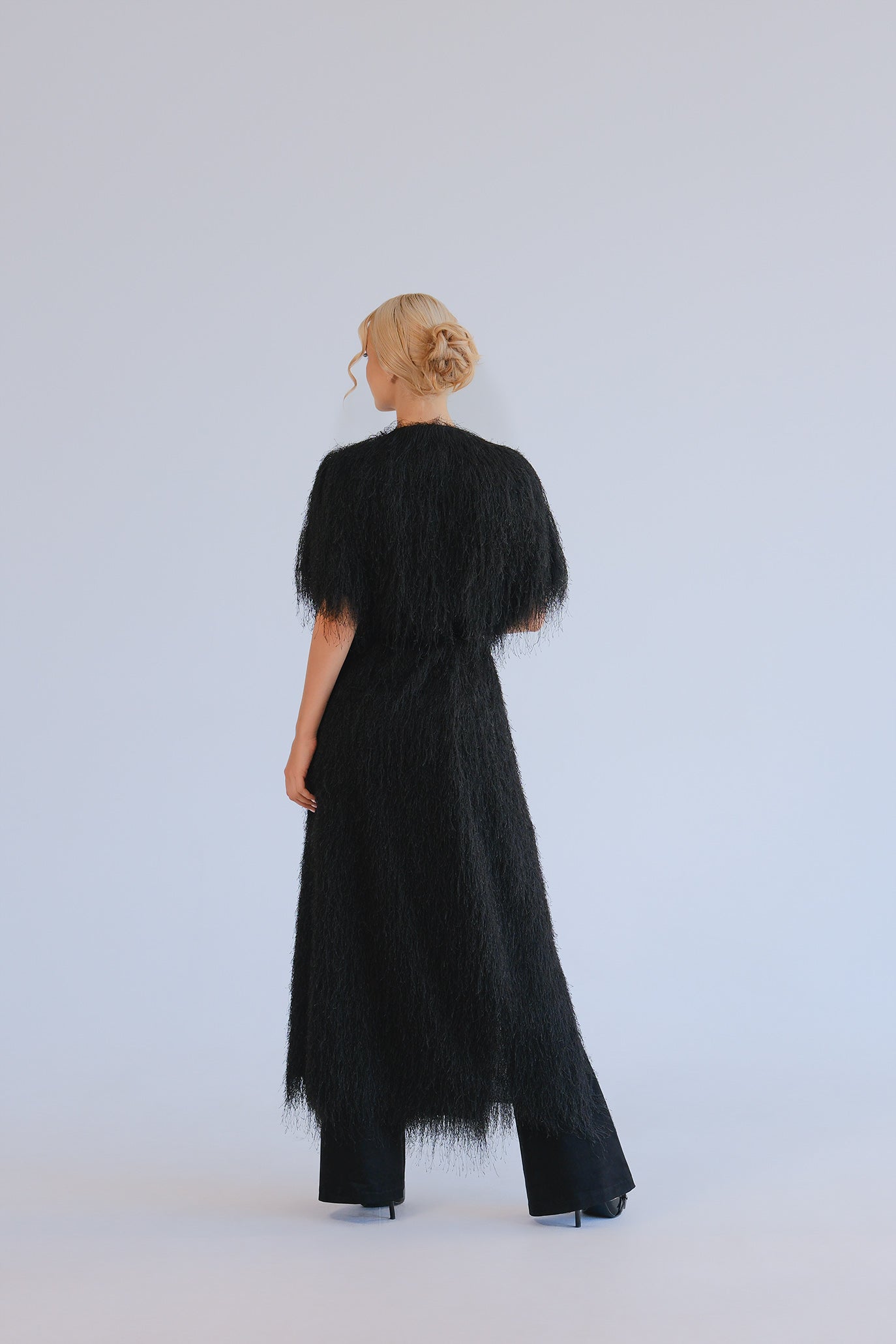 Ефектна дълга жилетка, изработена от специални конци - ресни с ефект на пера или косъм. Къс ръкав тип наметка, дължина до глезена и леко движение при всяка стъпка. Идеален завършек върху рокли, костюми и гащеризони.