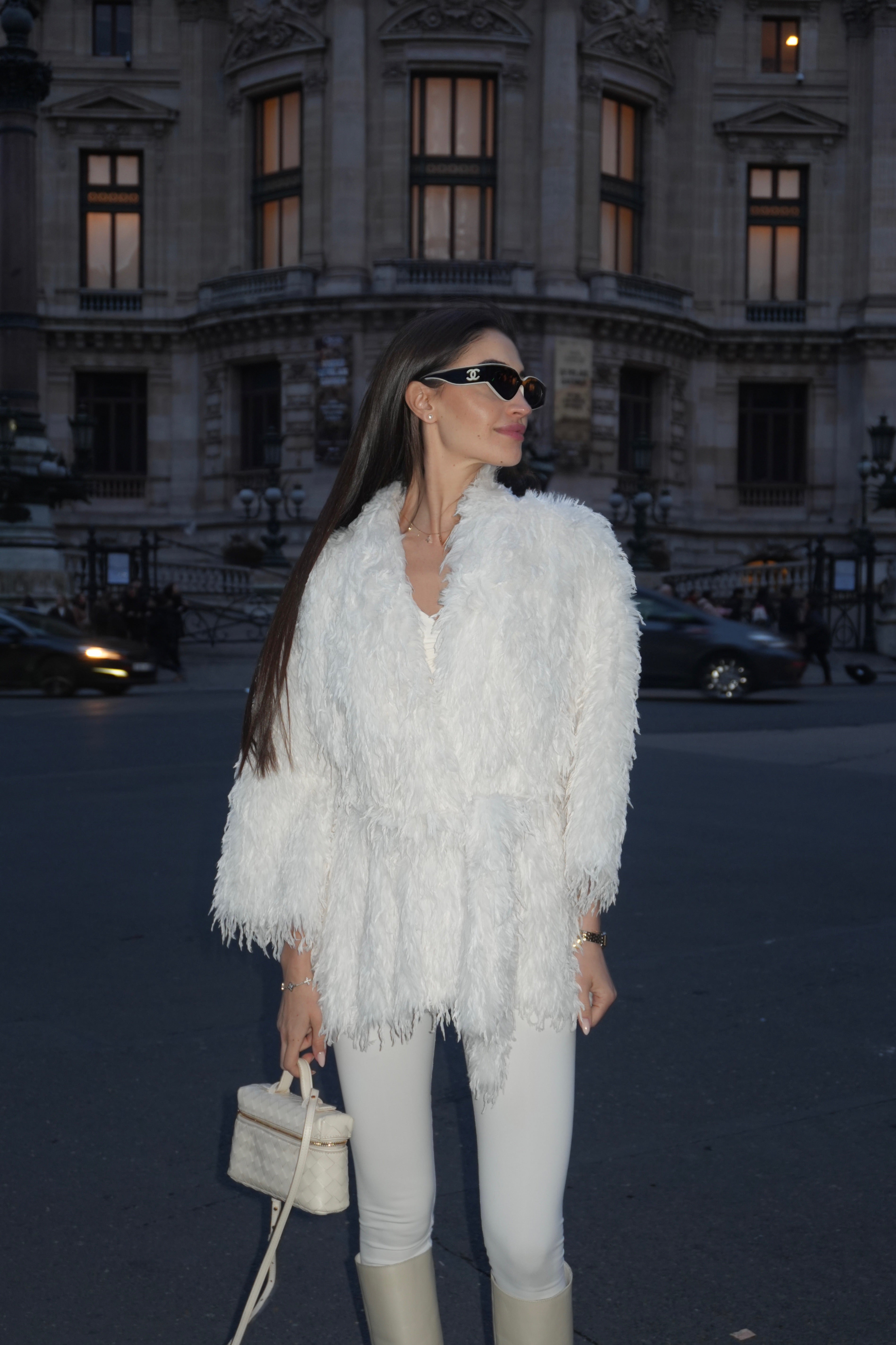 Късо палто / жилетка от изкуствен косъм. Меката материя осигурява топлина и комфорт, без утежняване. Класическа права линия с обемна яка. Коланът подчертава талията и позволява индивидуално прилягане – носете свободно разкопчано за relaxed визия или пристегнато за елегантен силует. Един универсален размер.