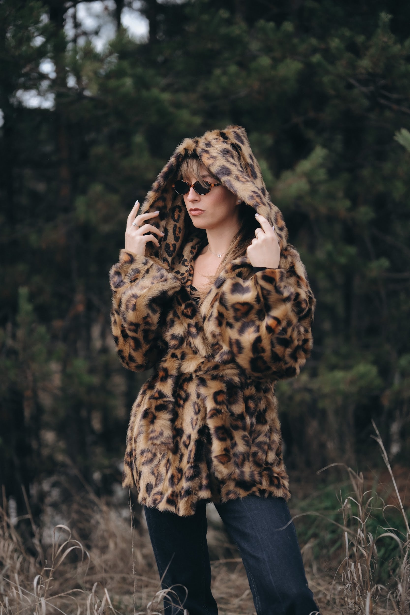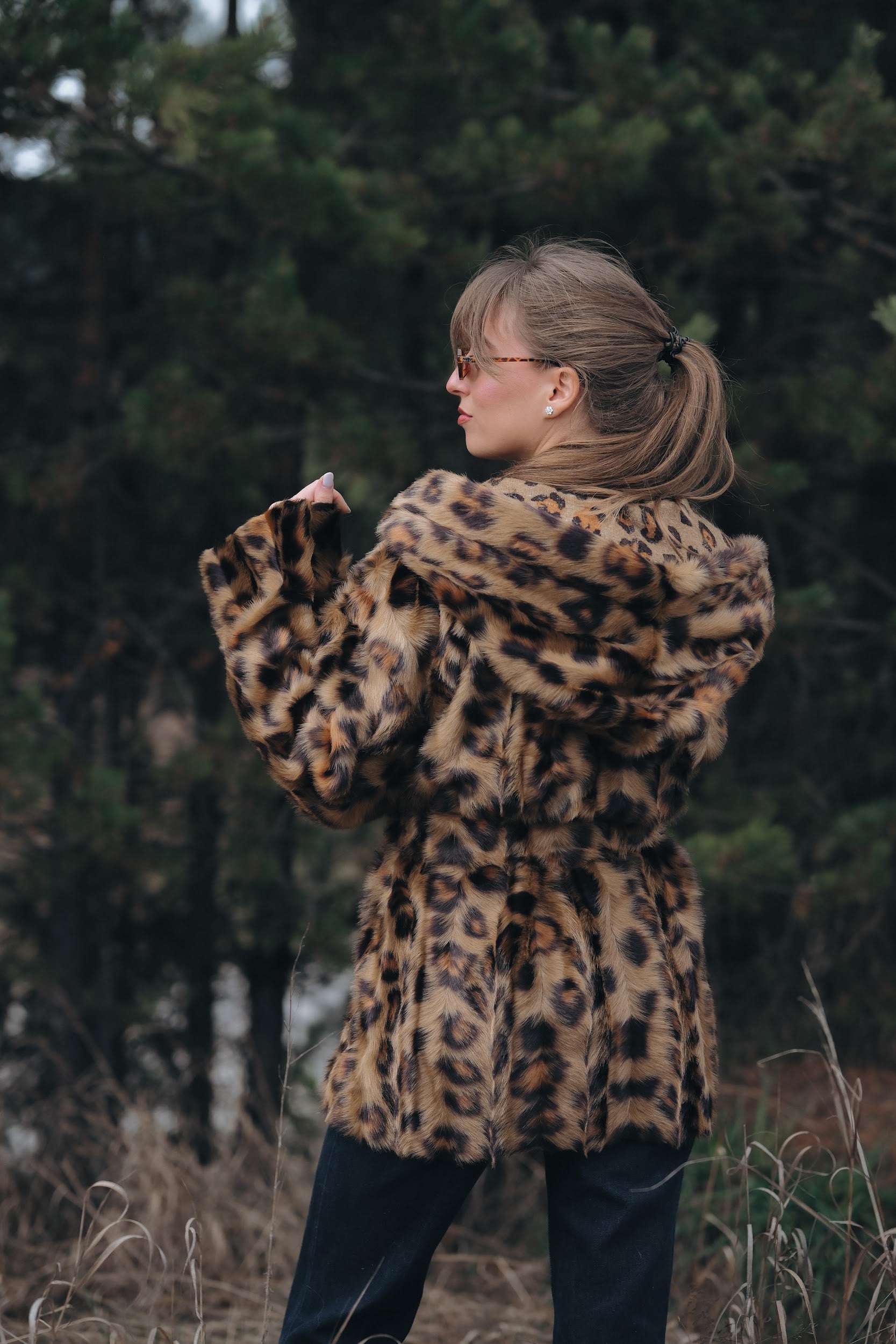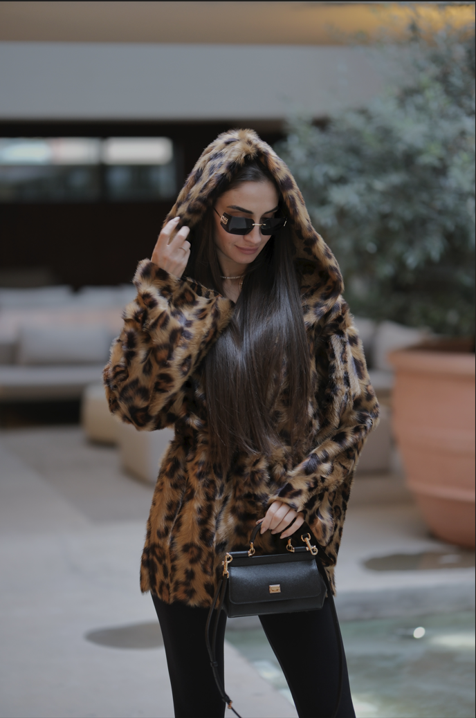 Късо палто от луксозен еко пух с ефектен animal принт. Мекият косъм осигурява топлина и комфорт, без утежняване. Класическа права линия с обемна яка тип качулка. Коланът подчертава талията и позволява индивидуално прилягане – носете свободно разкопчано за relaxed визия или пристегнато за елегантен силует. Перфектно за градски стил и вечерни излизания. Един универсален размер.
