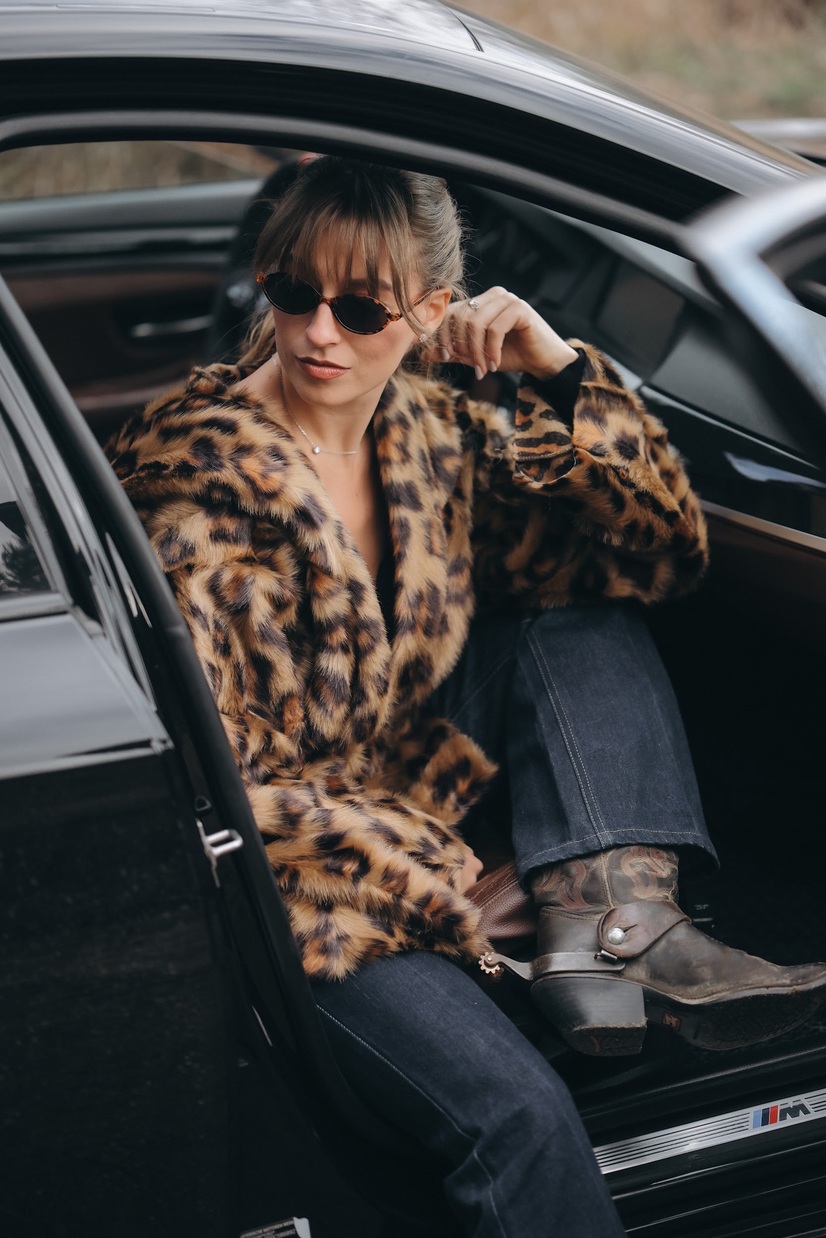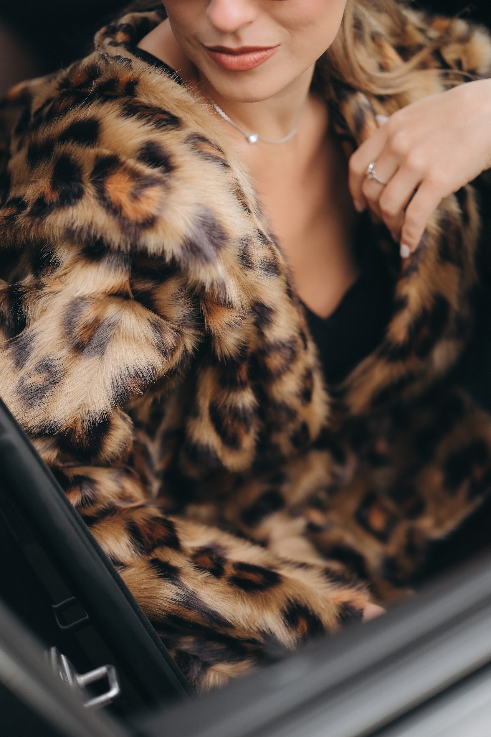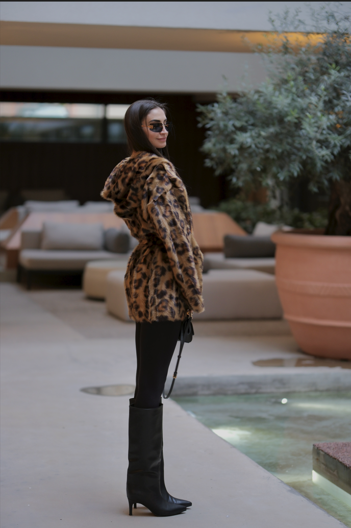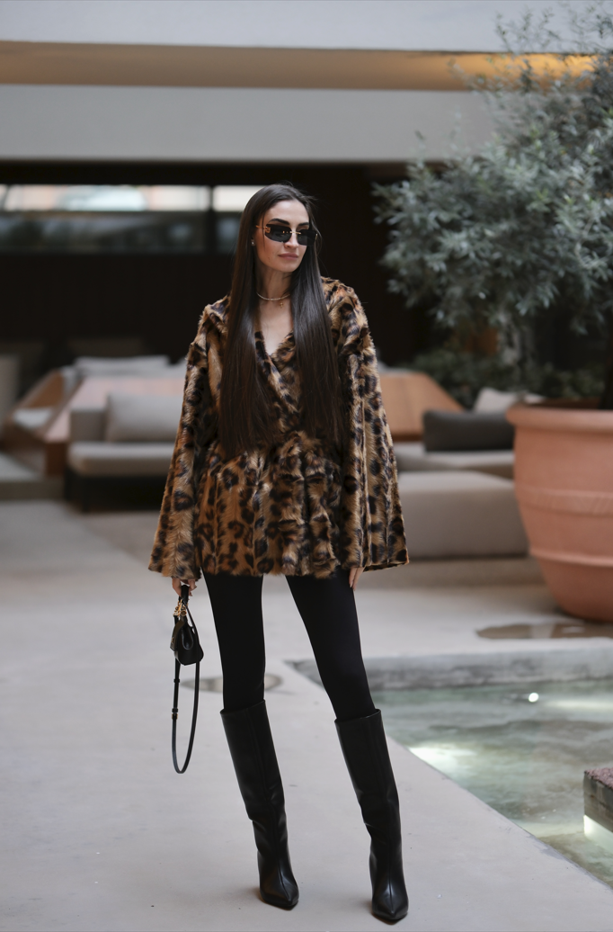 Късо палто от луксозен еко пух с ефектен animal принт. Мекият косъм осигурява топлина и комфорт, без утежняване. Класическа права линия с обемна яка тип качулка. Коланът подчертава талията и позволява индивидуално прилягане – носете свободно разкопчано за relaxed визия или пристегнато за елегантен силует. Перфектно за градски стил и вечерни излизания. Един универсален размер.