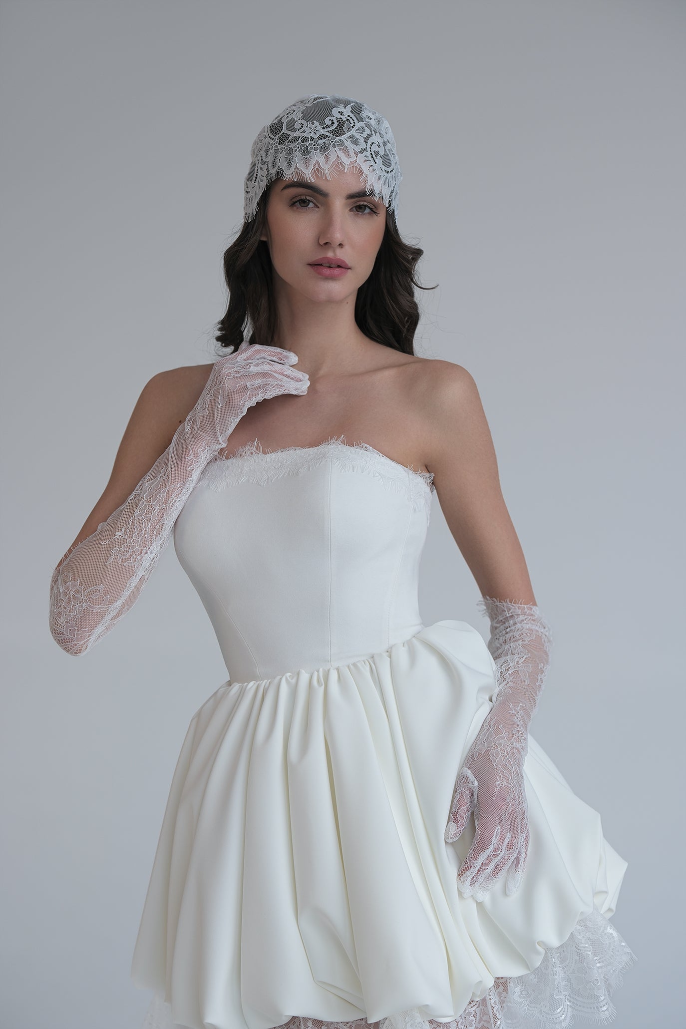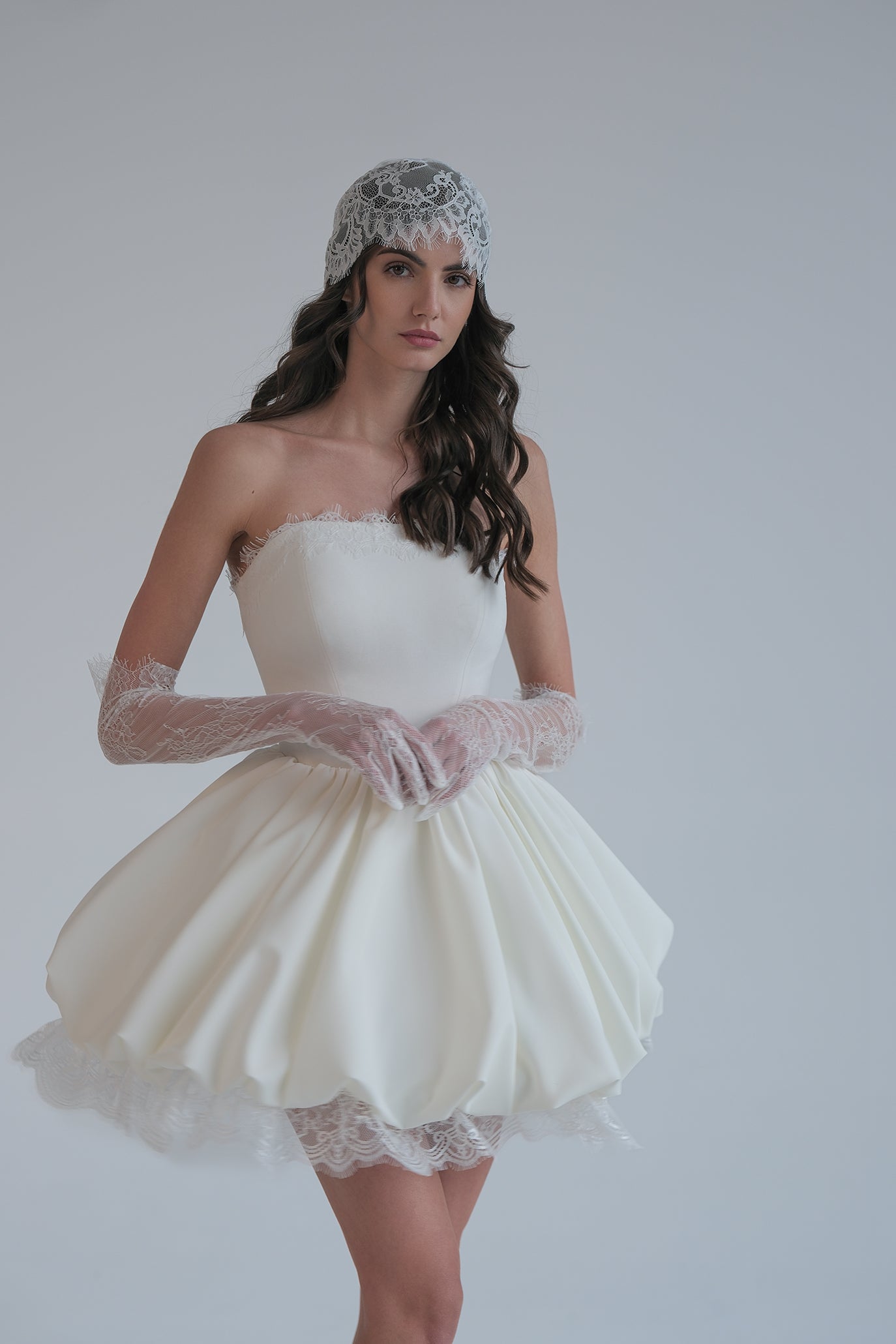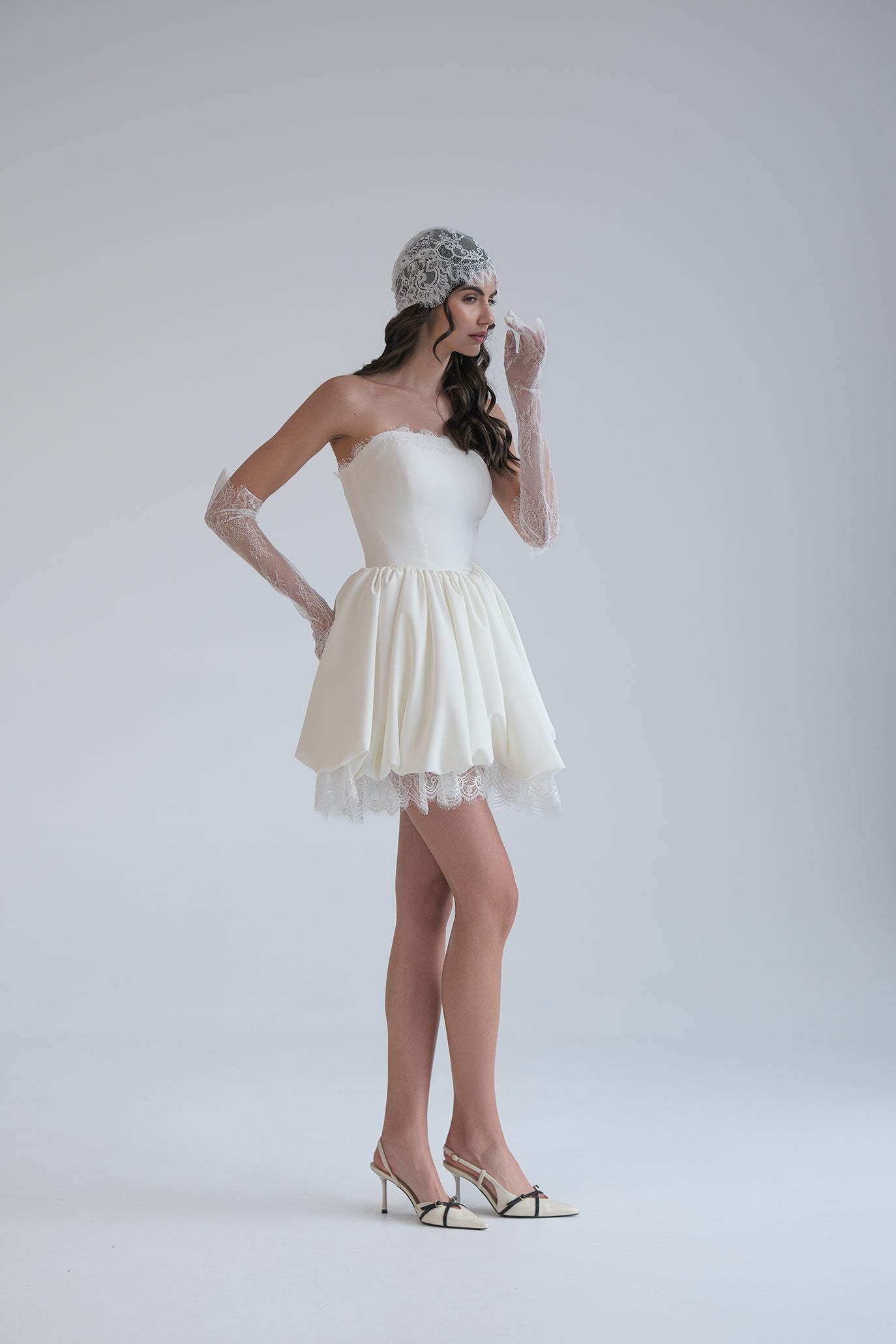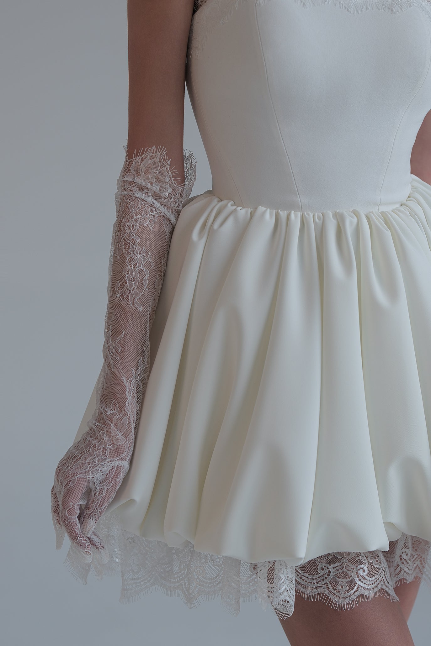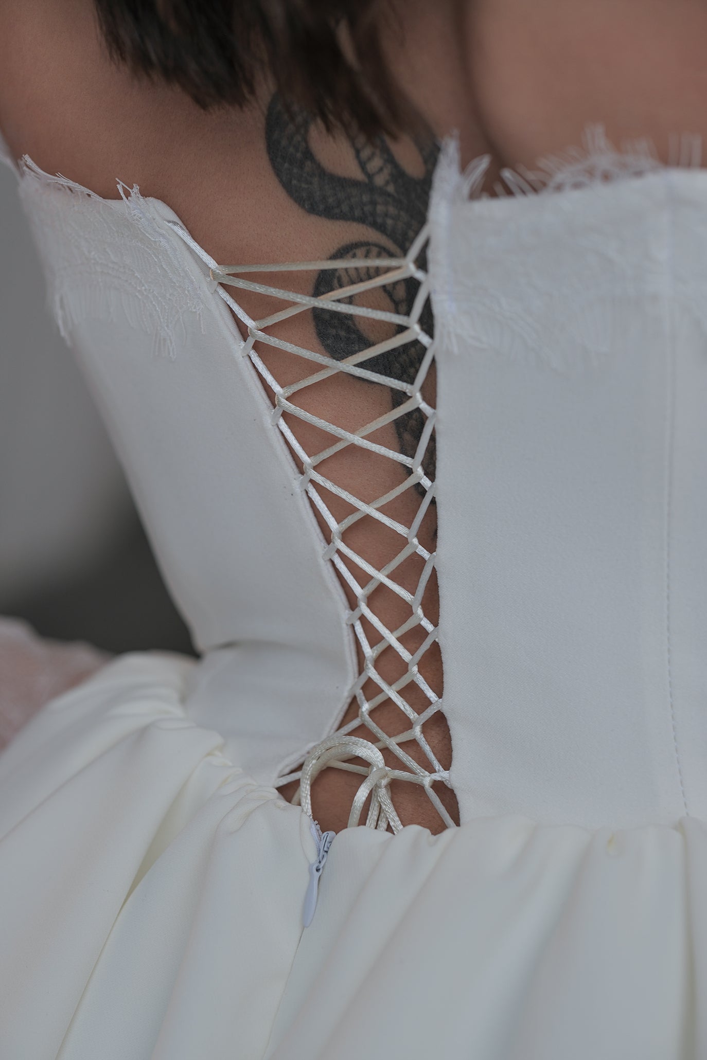 Елегантна рокля с изчистен корсет и обемна къса пола-балон, допълнена от фини дантелени акценти. Моделът впечатлява с корсетно връзване на гърба за прецизно прилягане.