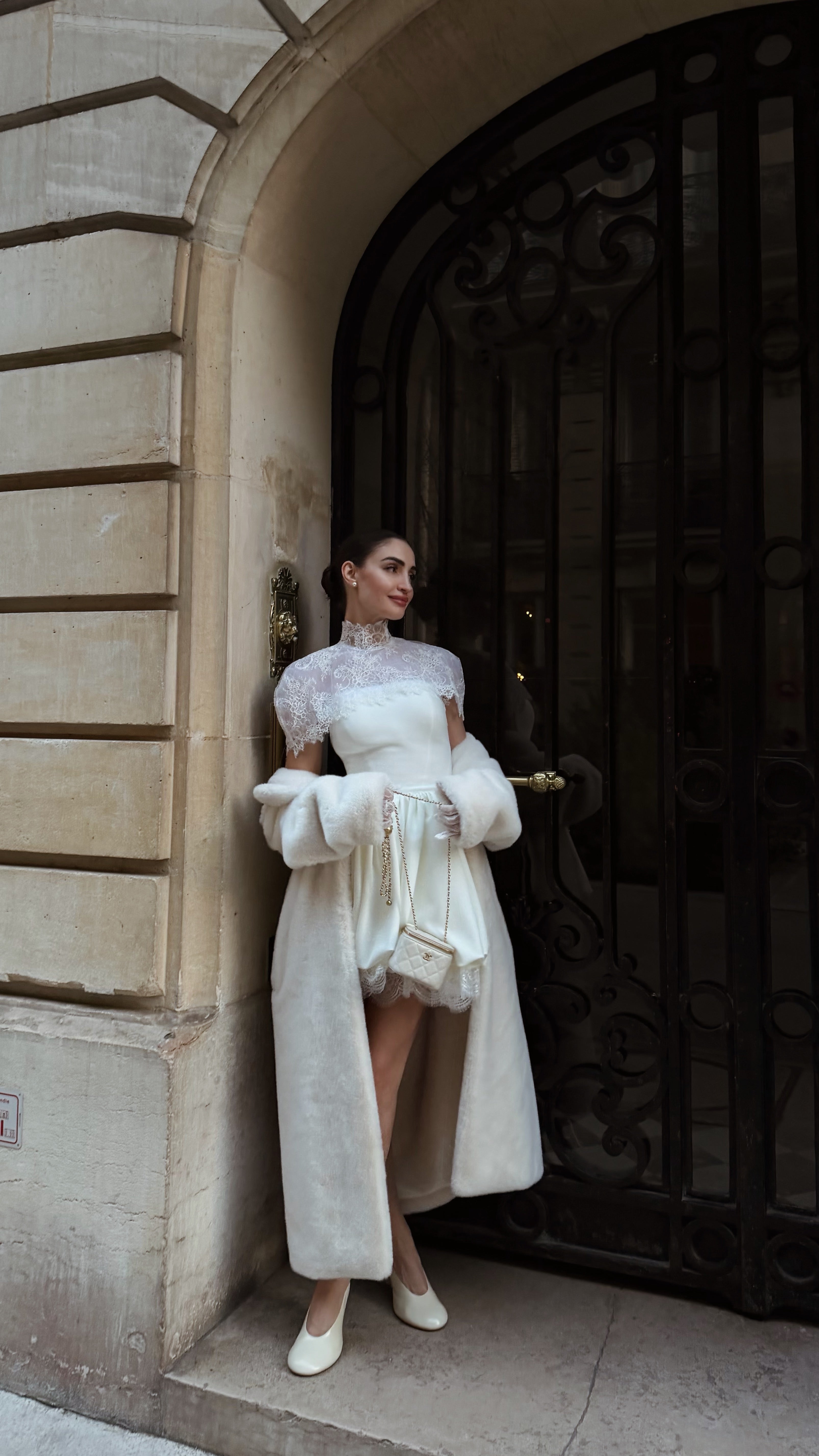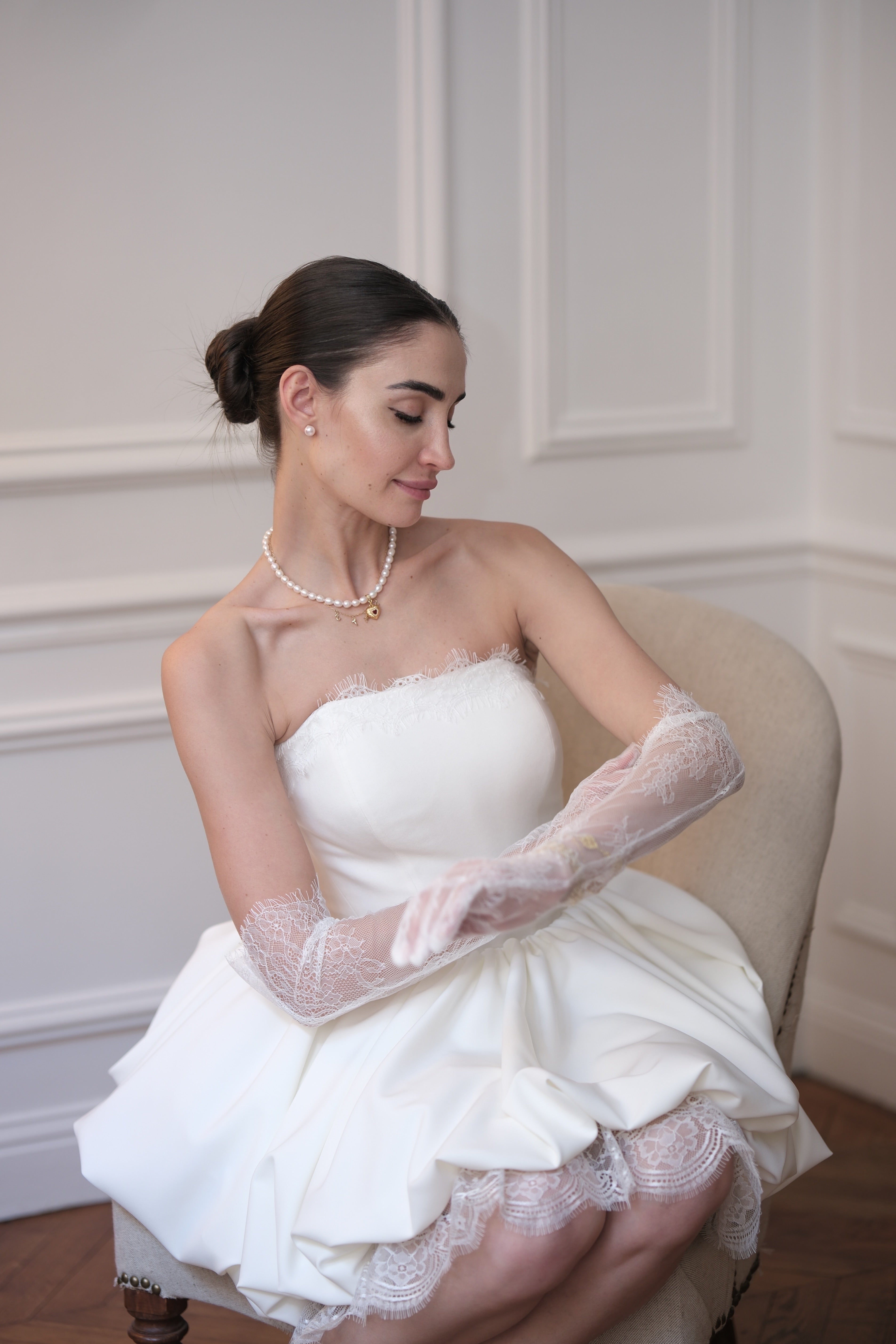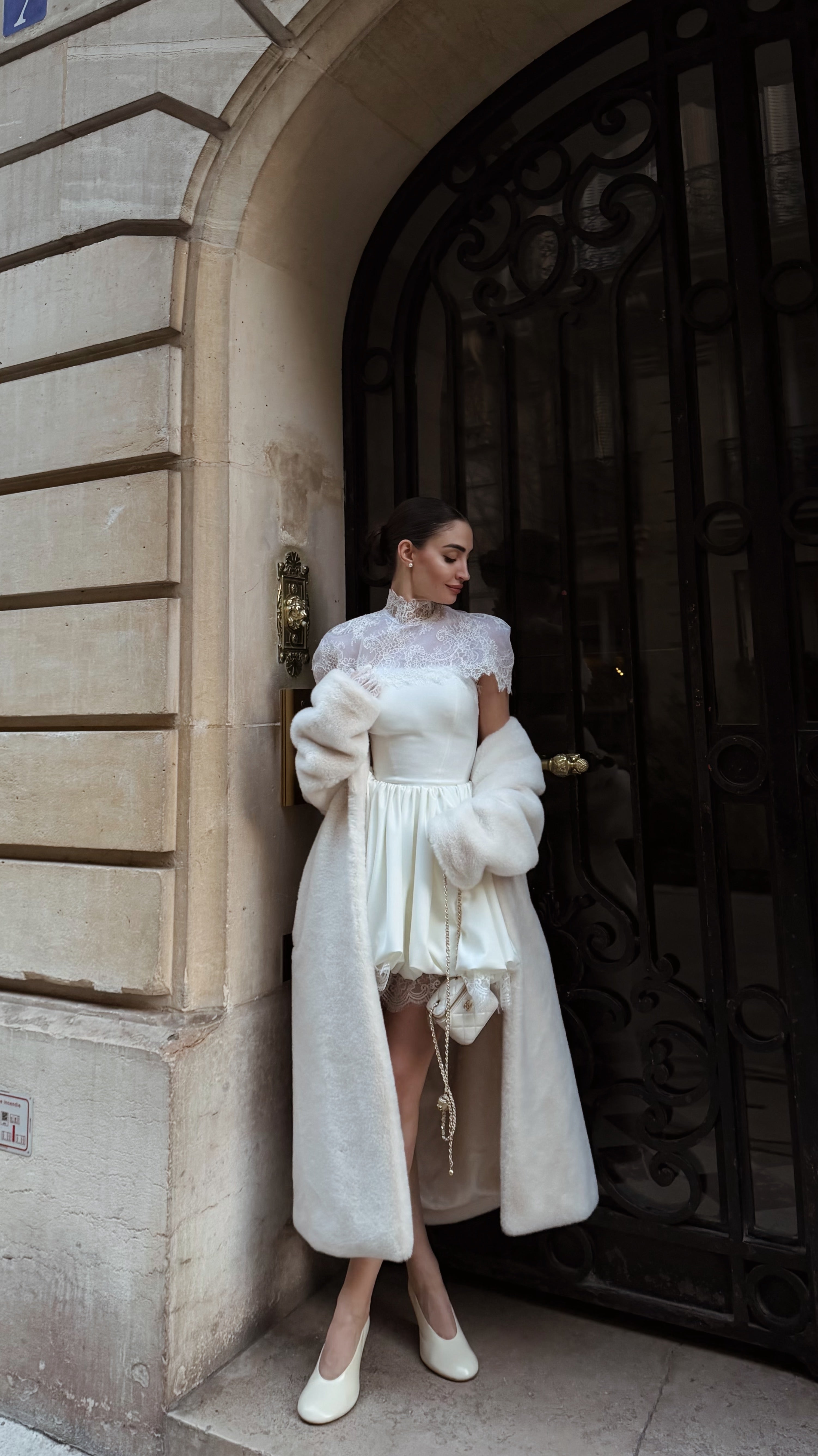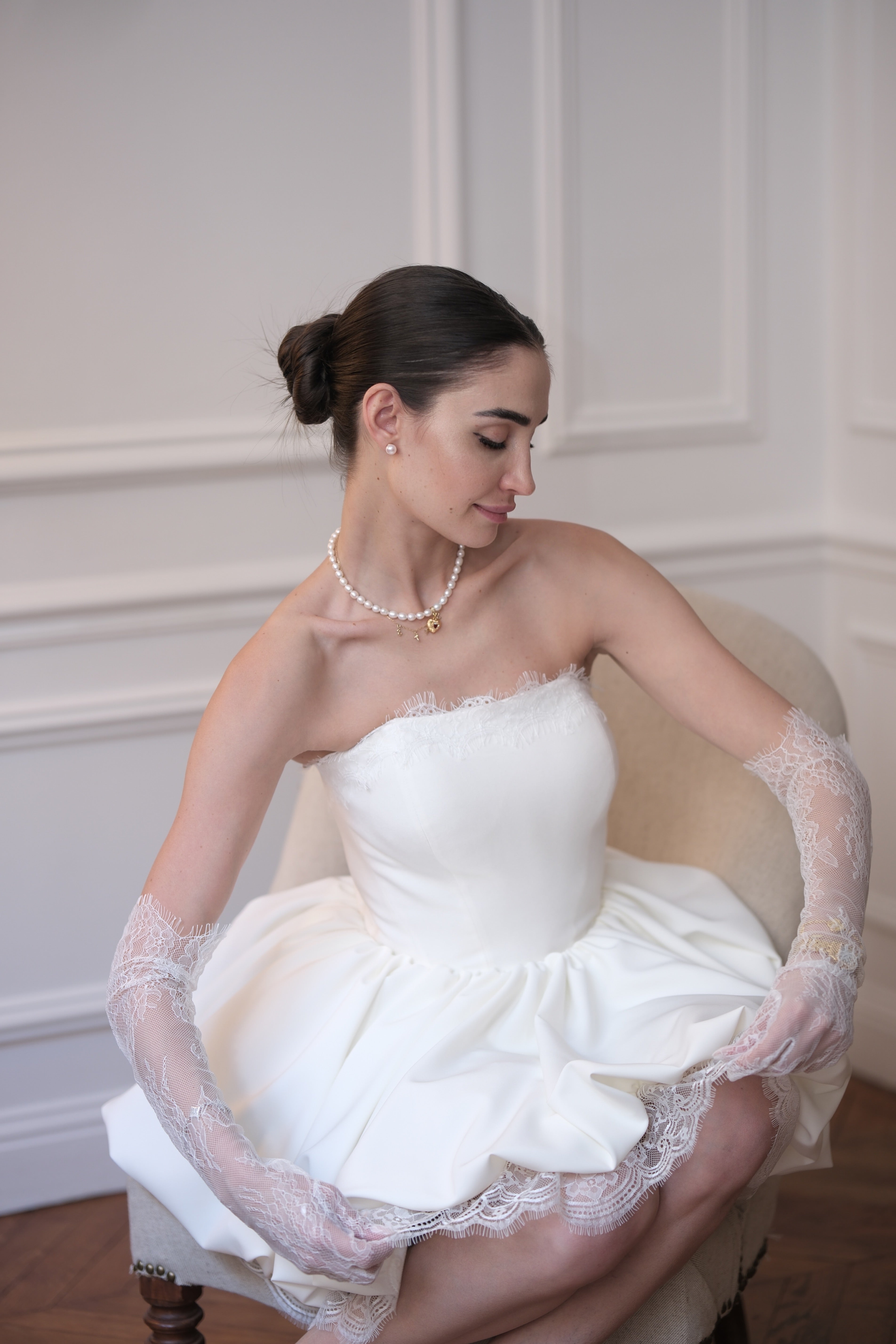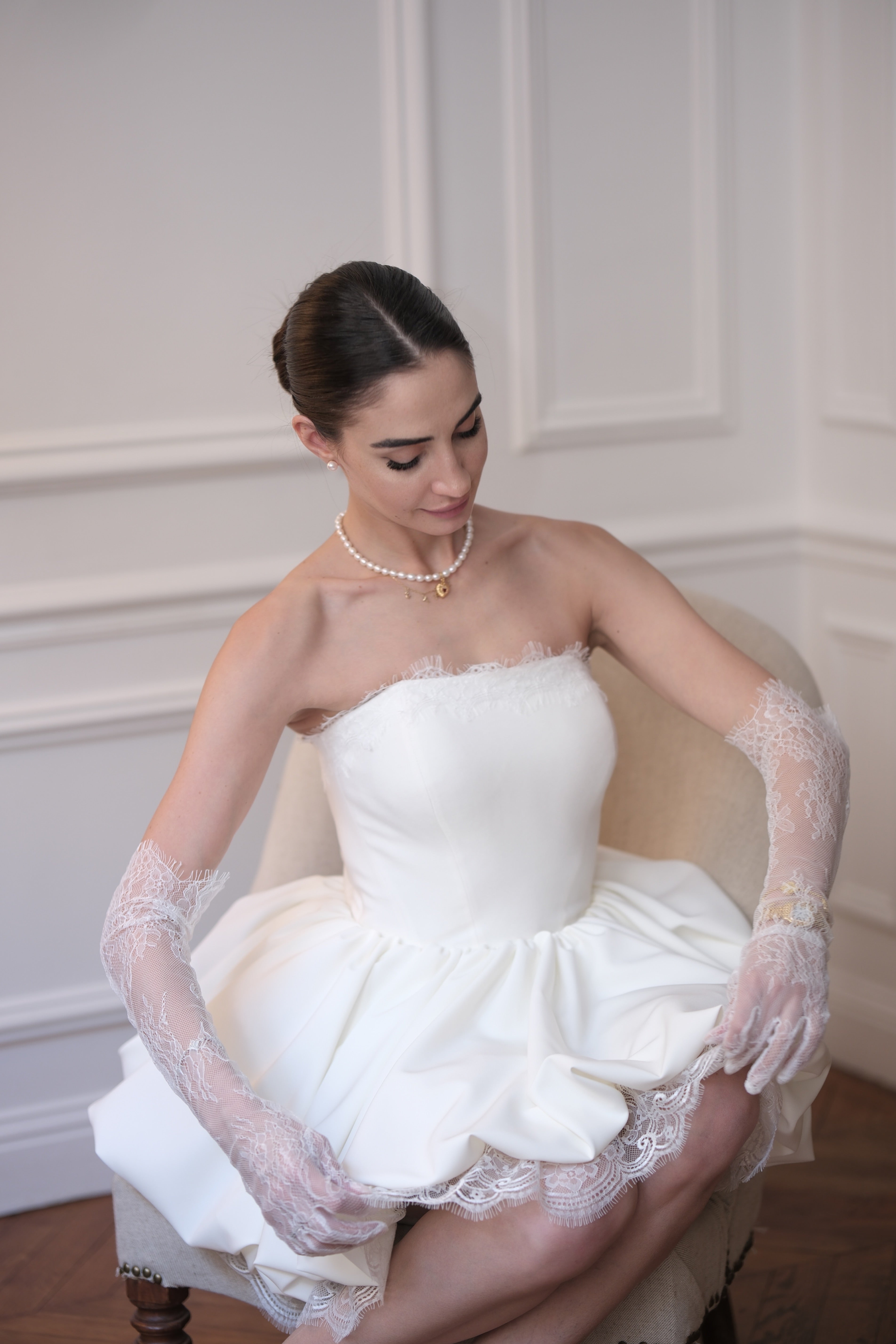 Елегантна рокля с изчистен корсет и обемна къса пола-балон, допълнена от фини дантелени акценти. Моделът впечатлява с корсетно връзване на гърба за прецизно прилягане.