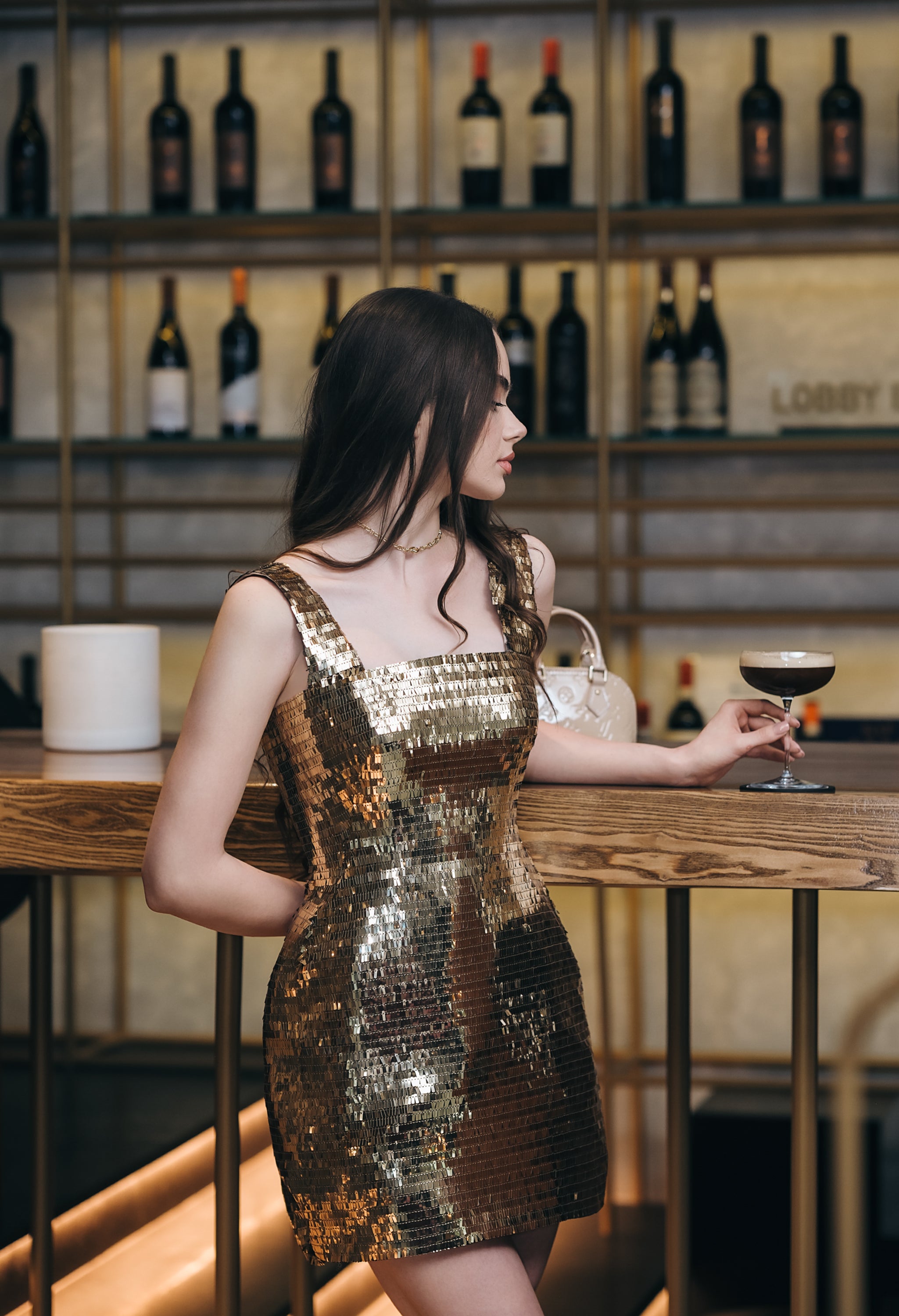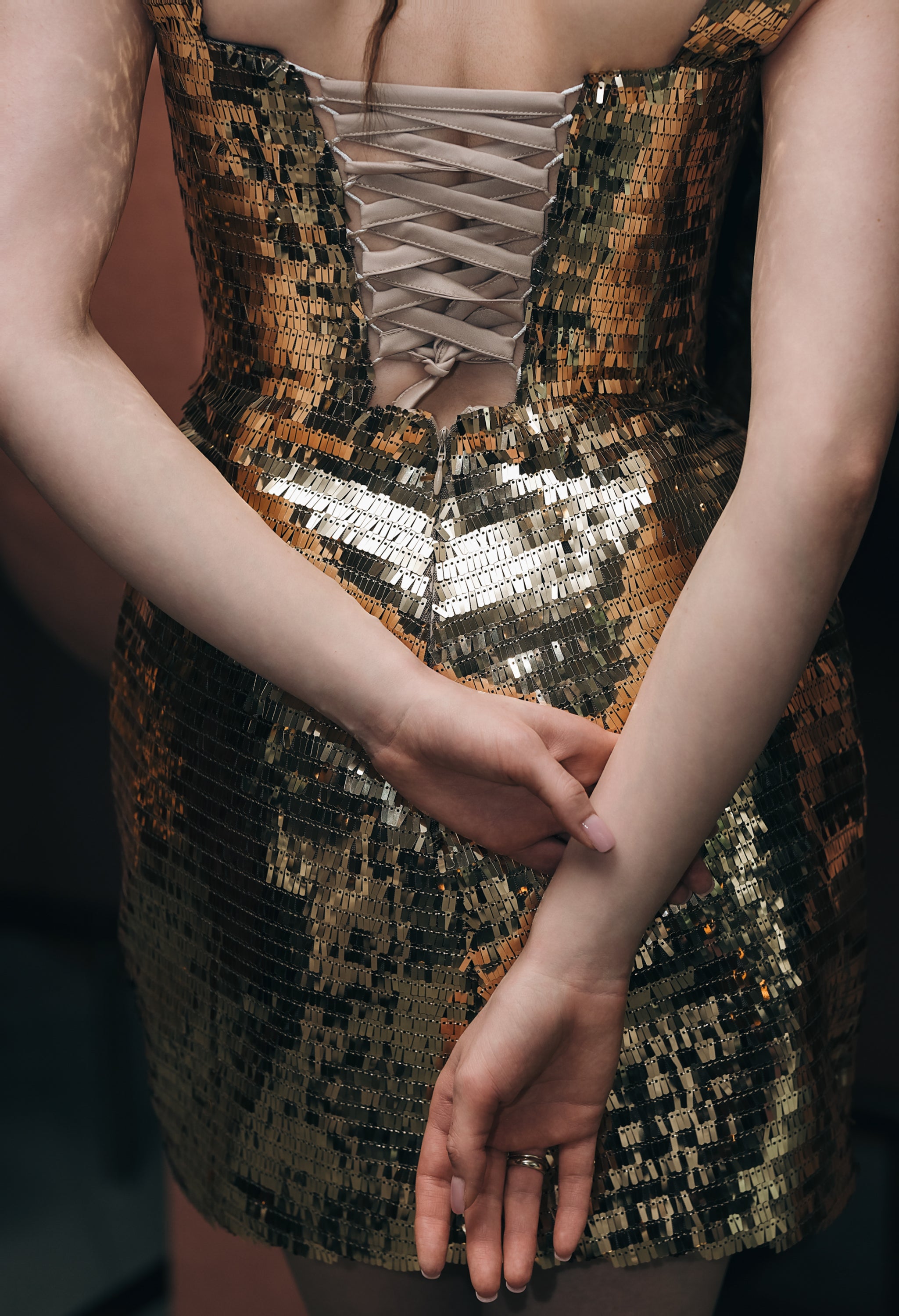 Къса рокля с втален силует, изработена от висококачествен текстил, изцяло покрит с фини пайети тип люспи. Материята пречупва светлината при всяко движение и създава ефектен, бляскав завършек. Моделът е със структурирани презрамки и изчистено квадратно деколте, което подчертава линията на раменете. Гърбът е акцентиран с връзки тип корсет, които позволяват прецизно регулиране и оформят силуета. Кройката следва естествените извивки на тялото, като подчертава талията и създава елегантна, женствена линия.