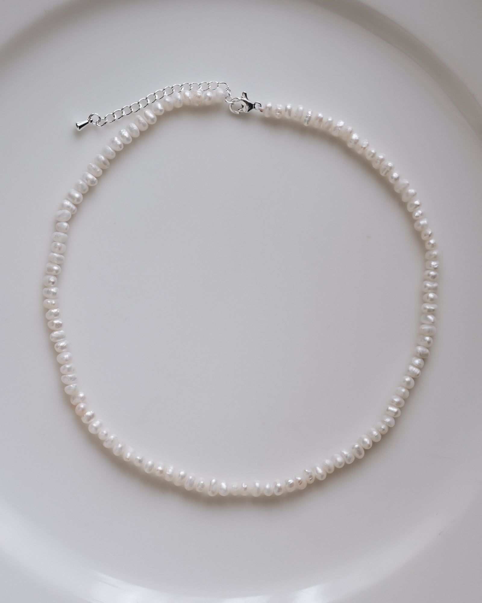 Елегантно колие с фини малки перли в редица. Колието е изработено от класически бели перли, нежно обгръщащи шията. Моделът е подходящ както за официални поводи, така и за стилни вечерни визии.