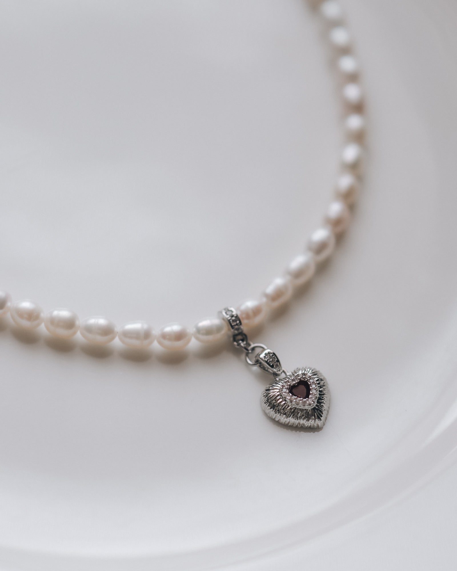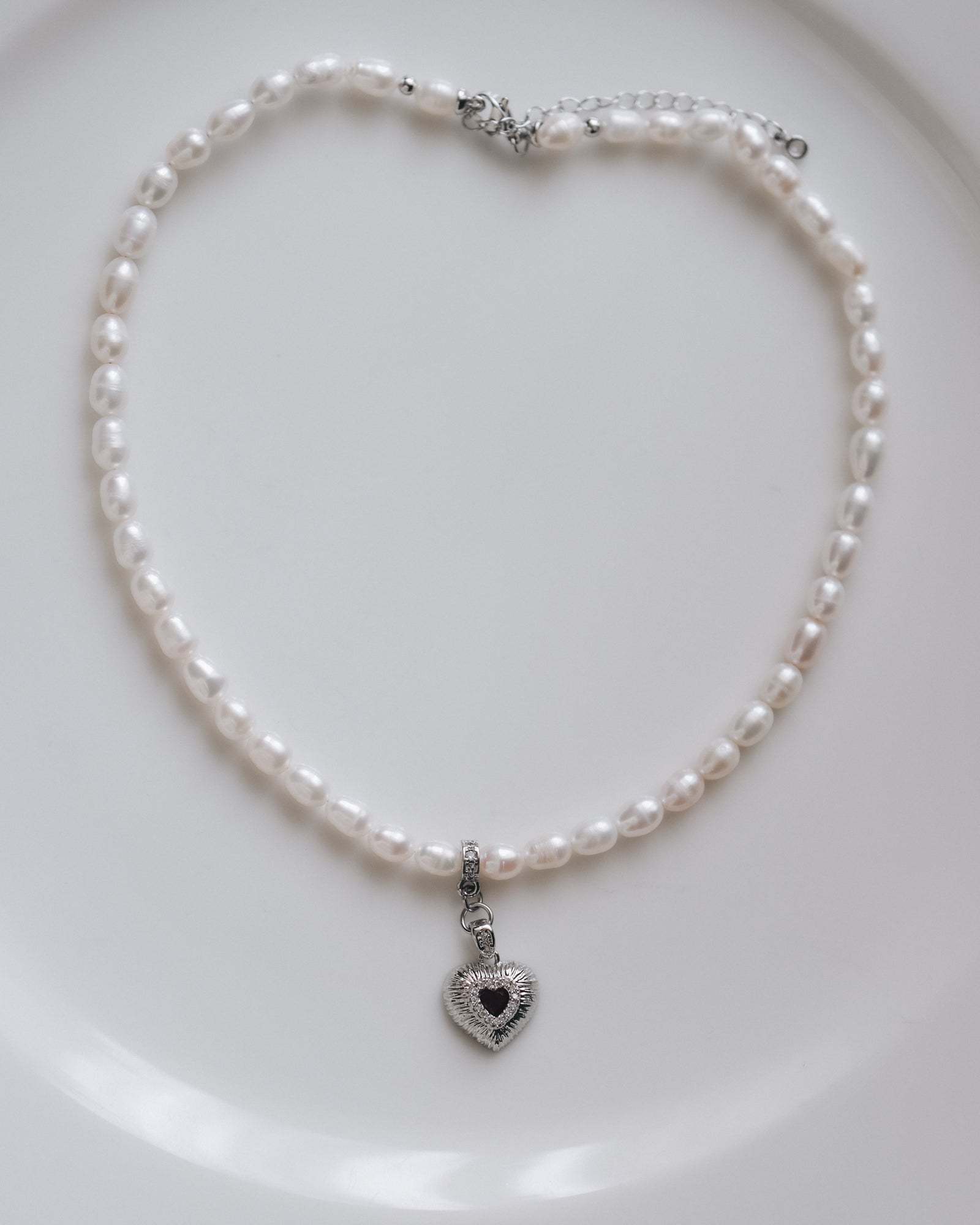 Елегантно перлено колие с фин акцент във формата на сърце. Колието е изработено от класически бели перли, нежно обгръщащи шията, допълнени от висулка в сребристо. Моделът е подходящ както за официални поводи, така и за стилни вечерни визии.