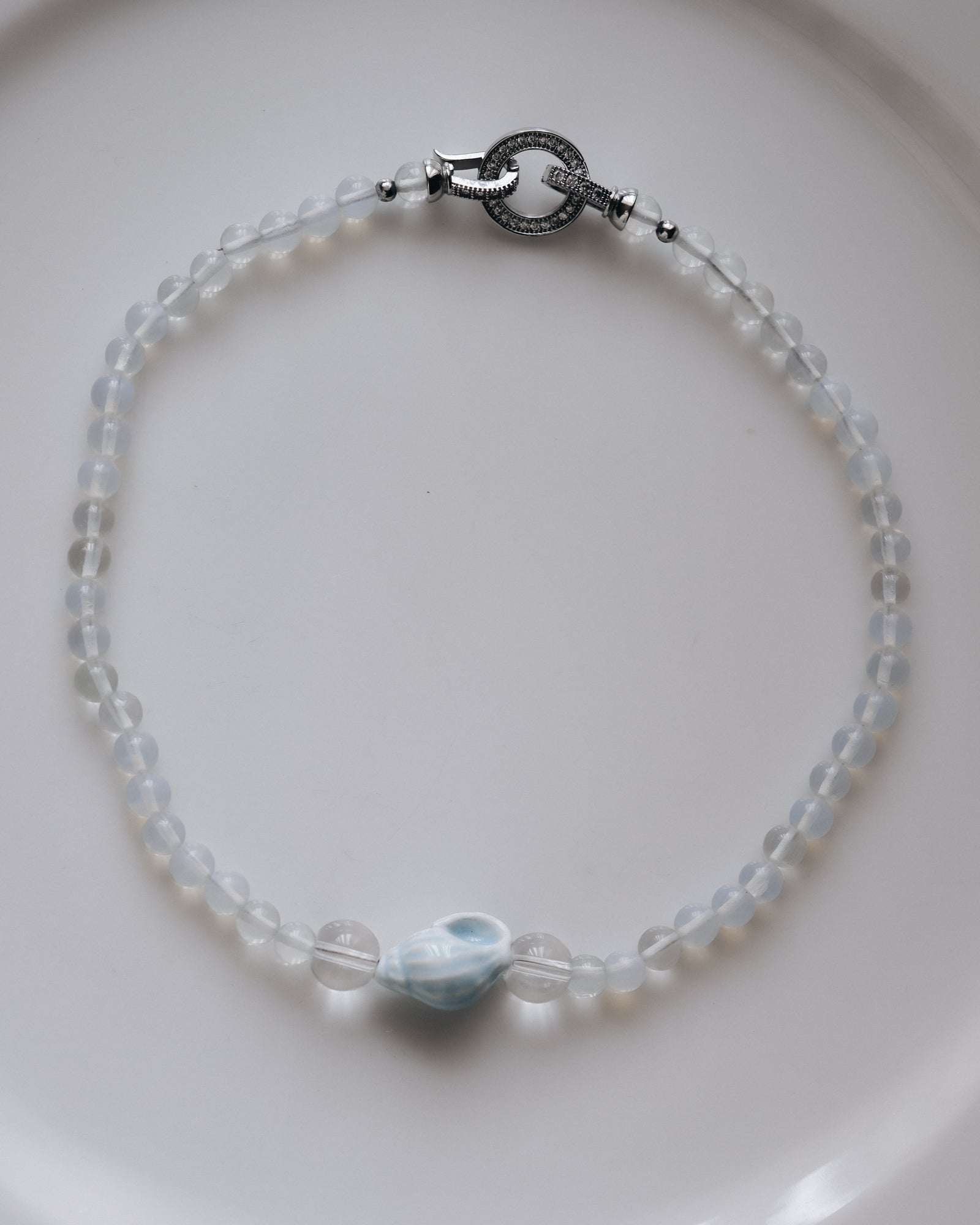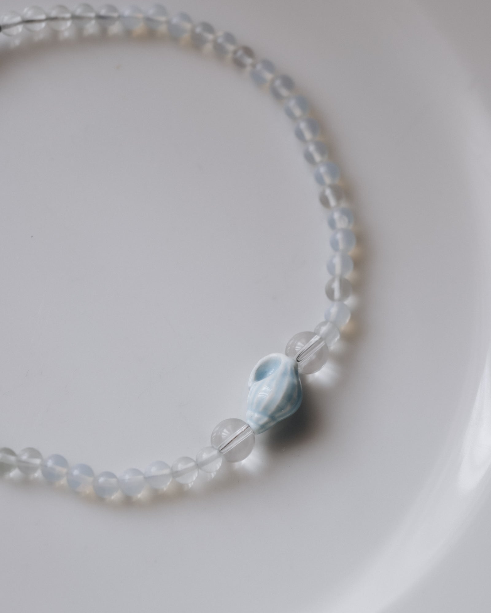 Ефирно колие, изработено от полупрозрачни мъниста в млечно бял нюанс, с централен акцент – декоративна морска черупка в нежно светлосин цвят. Дизайнът носи усещане за лекота и морско вдъхновение.