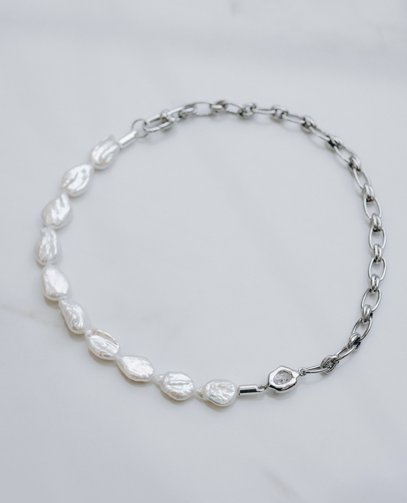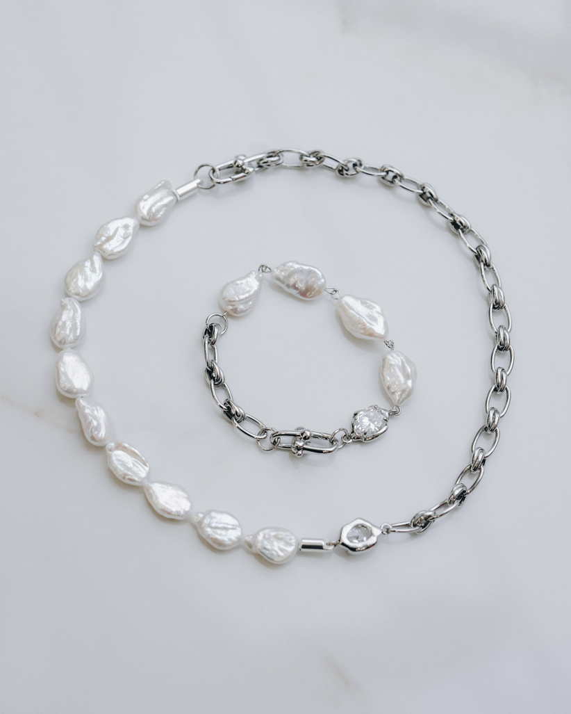 Материал – барокови перли от най-високо качество, едър елемент с циркон и верига с родиево покритие.