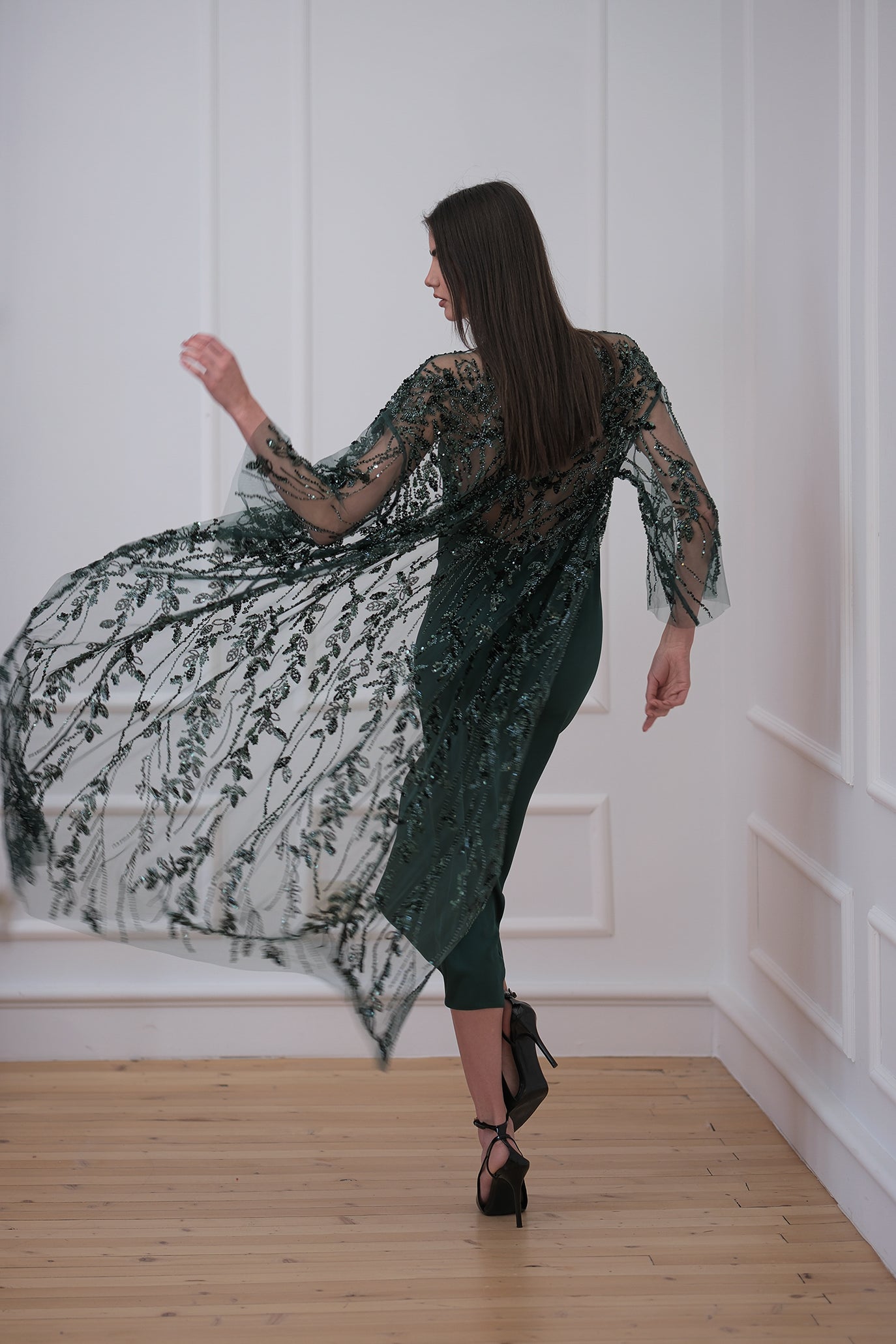 Изискан комплект, особено подходящ за луксозни вечерни събития. Изцяло ръчна изработка. Състои се от дълга рокля и жилетка. Роклята е от висококачествен сатен и с кройка тип нощница - свободна и удобна, падаща по тялото. Отзад е с кръстосани презрамки, които елегантно подчертават гърба. Жилетката е със свободна кройка, от мрежеста полупрозрачна материя, изцяло обсипана с блестящи кристали. Продуктите от комплекта могат да бъдат закупени и поотделно.