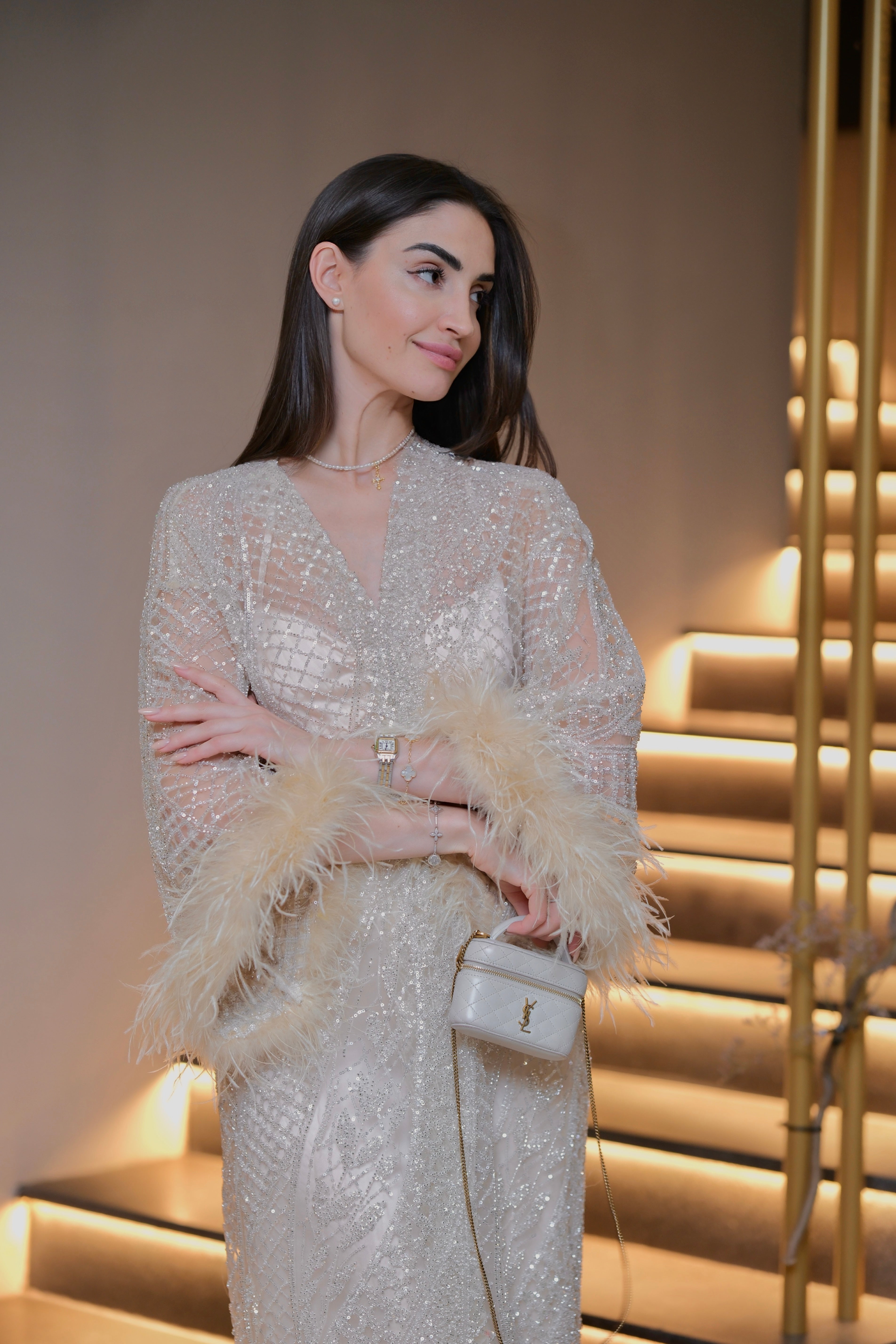 Изискан комплект, особено подходящ за луксозни вечерни събития. Изцяло ръчна изработка. Състои се от дълга рокля и жилетка. Роклята е от висококачествен сатен и с кройка тип нощница - свободна и удобна, падаща по тялото. Отзад е с кръстосани презрамки, които елегантно подчертават гърба. Жилетката е със свободна кройка, от мрежеста полупрозрачна материя, изцяло обсипана с блестящи кристали и нежни пера по ръбовете на ръкавите. Продуктите от комплекта могат да бъдат закупени и поотделно.