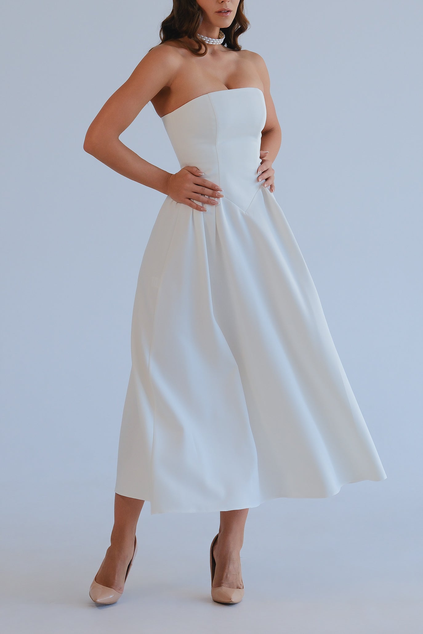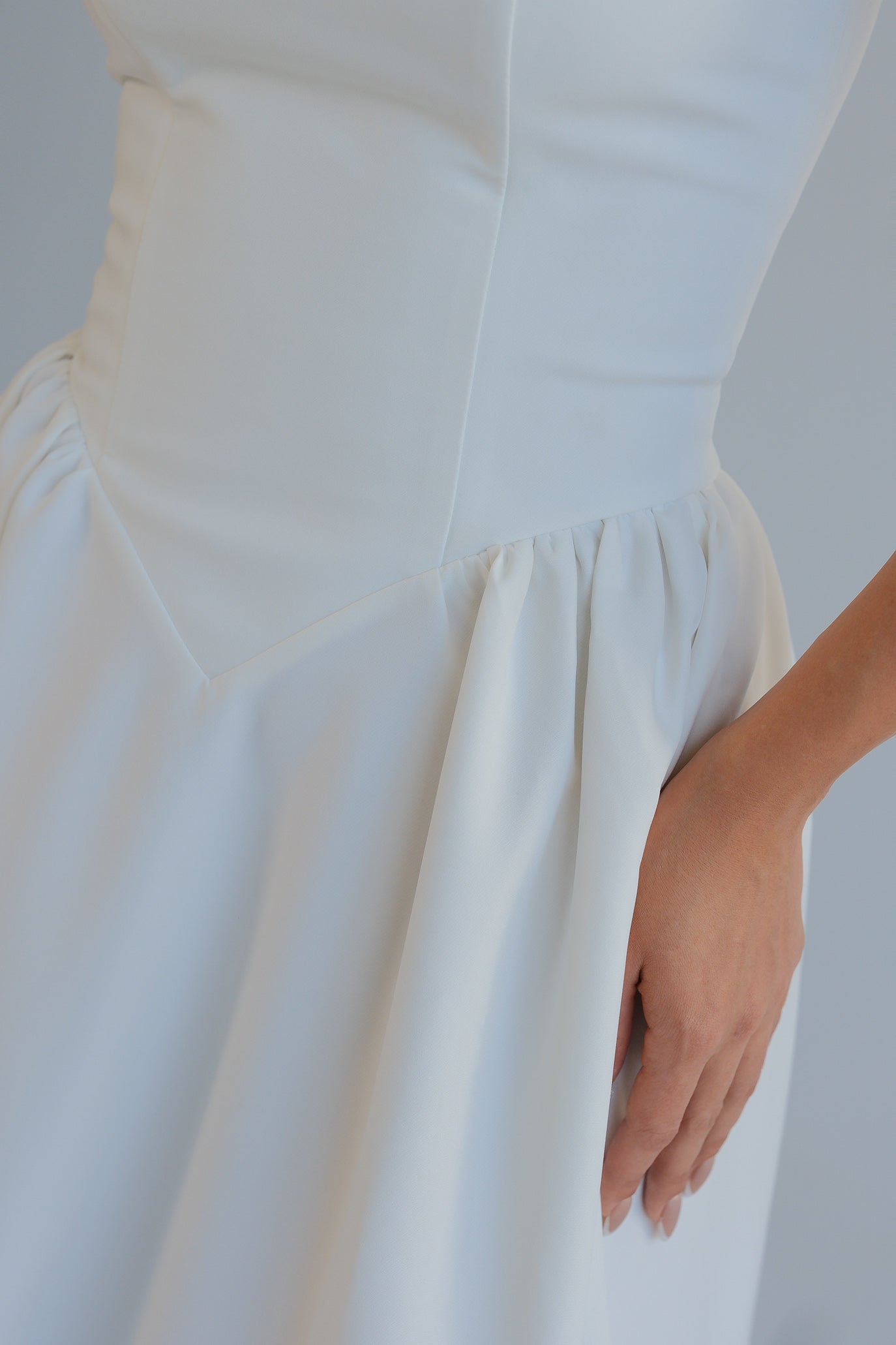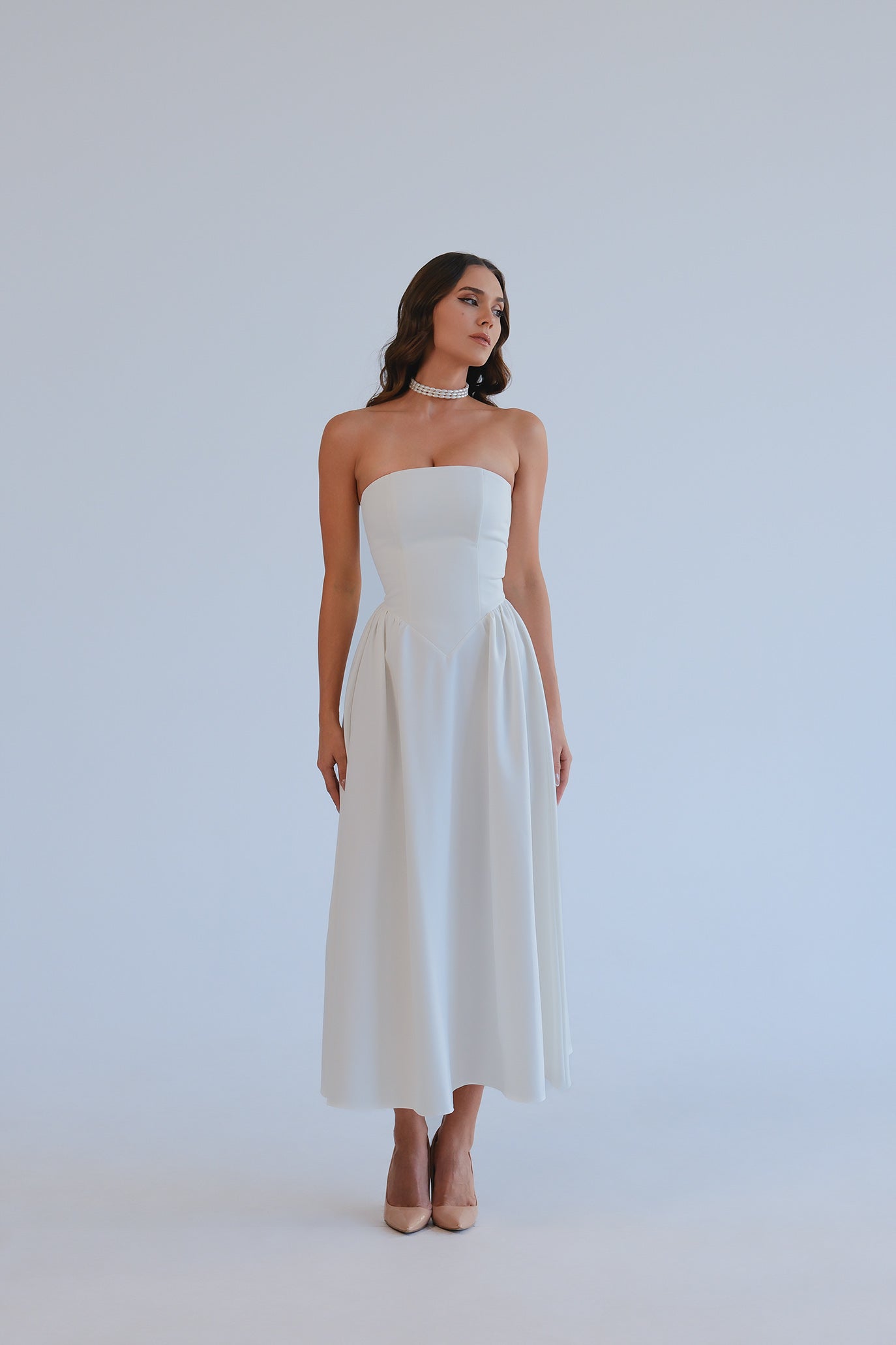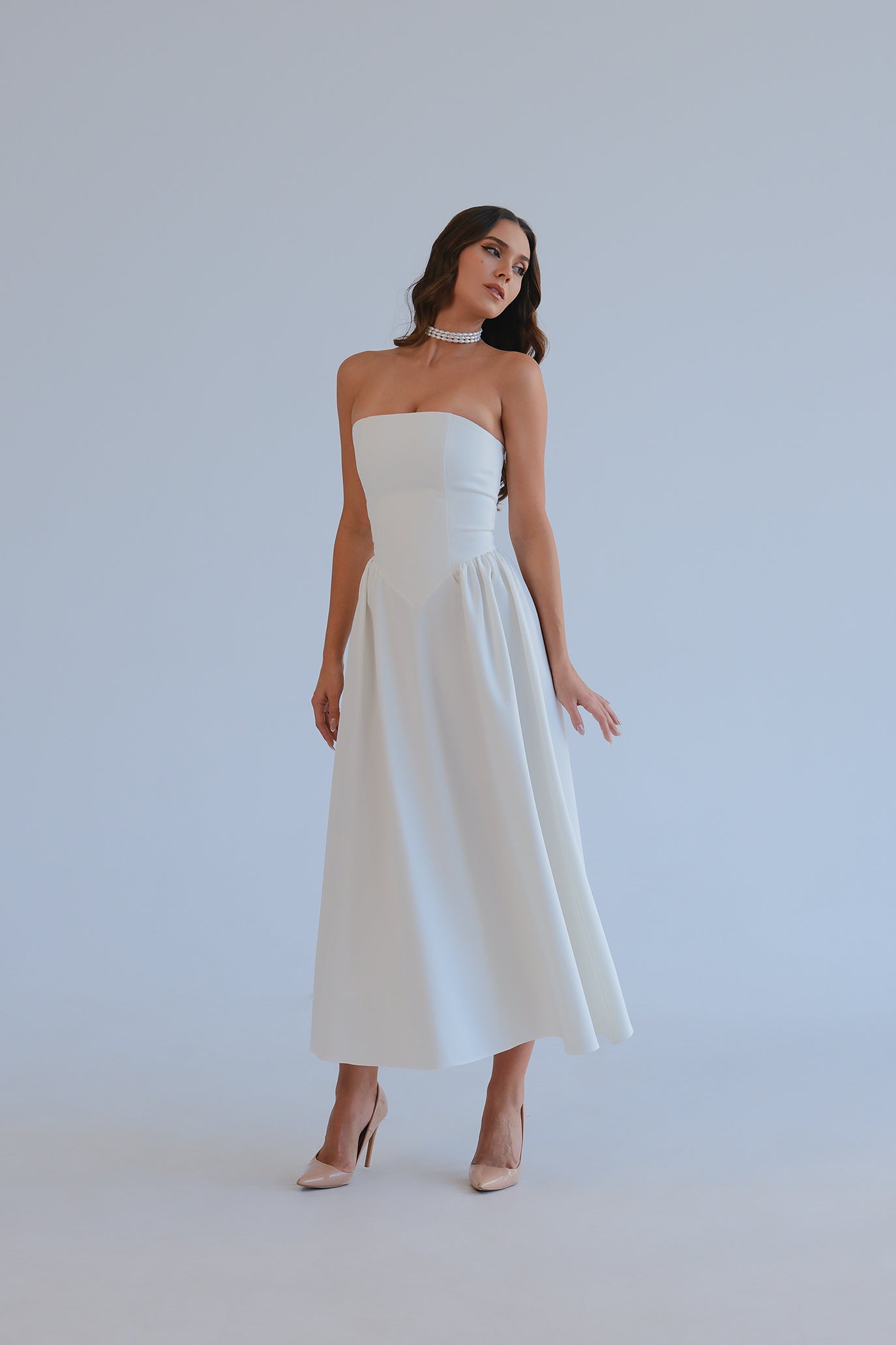 Минималистична, но впечатляваща рокля със съвременен силует. Горната част е тип бюстие със стабилна вътрешна конструкция, която прибира и оформя бюста, а V-образният шев към талията визуално издължава фигурата. Полата е с меки гънки, които придават обем и движение, падащи до елегантна миди дължина. Моделът е изработен от плътна, меко падаща материя с лек еластичен комфорт.