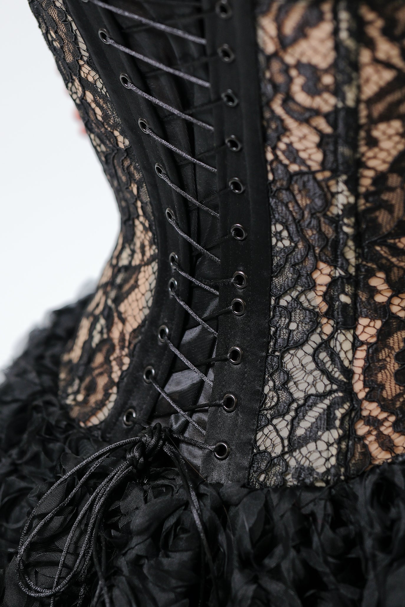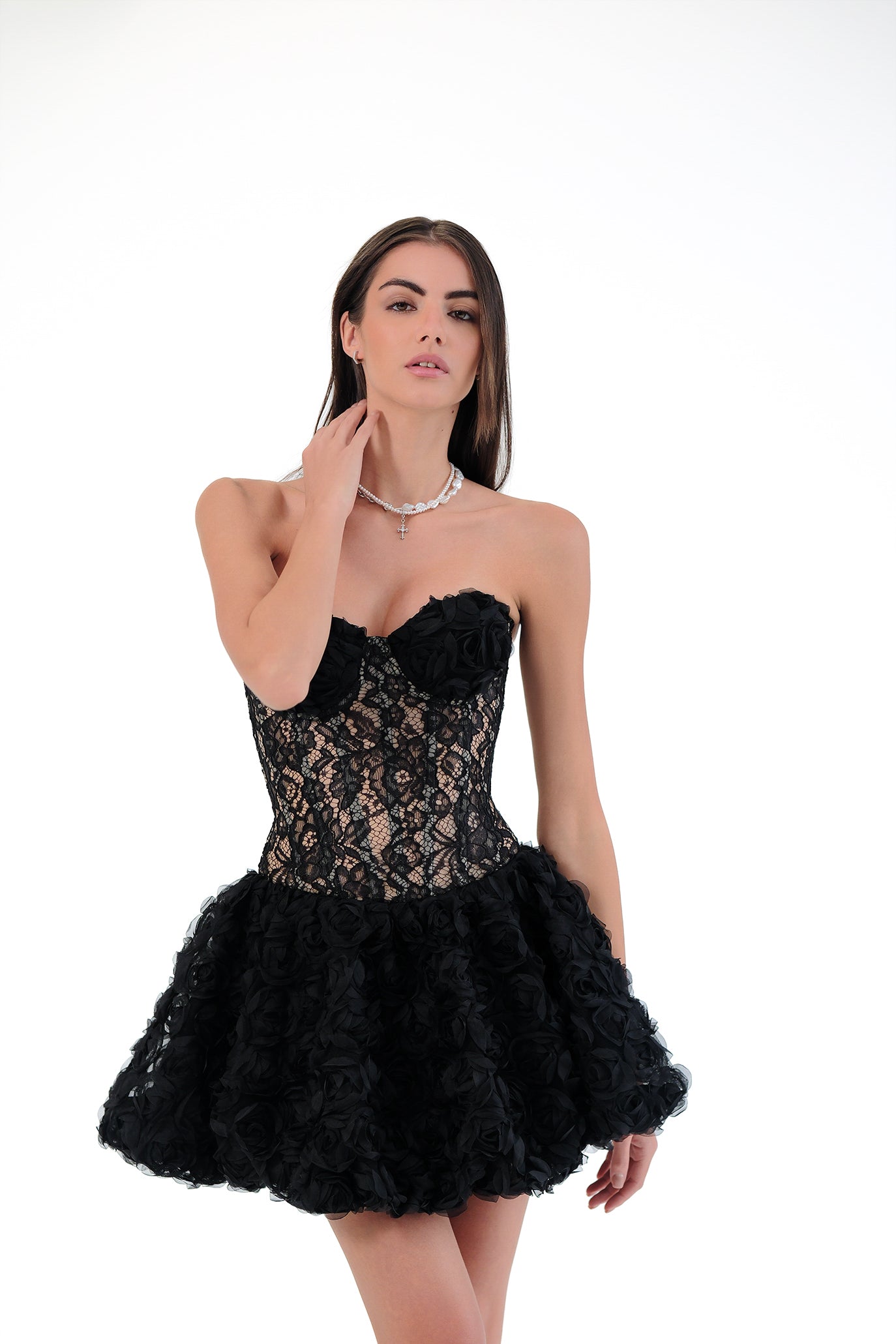 Тази уникална коктейлна рокля с корсетно завръзване е изработена от деликатна черна дантела и декоративни цветя от тюл, които придават романтичен и изискан вид. Бюстието с чашки акцентира върху фигурата, а ниското деколте допълва елегантния й силует.