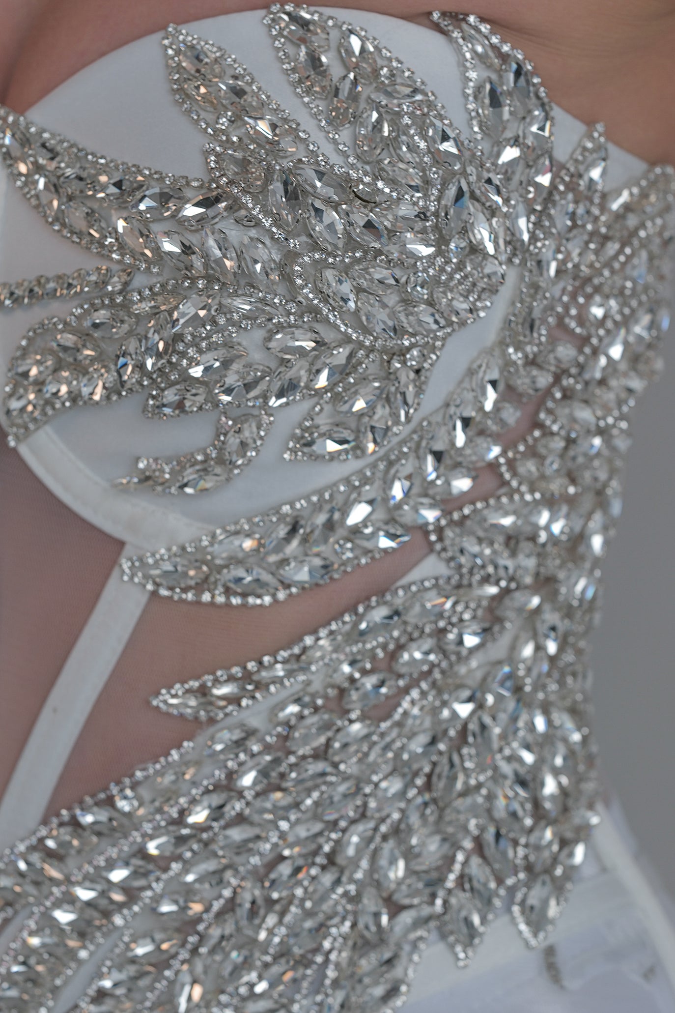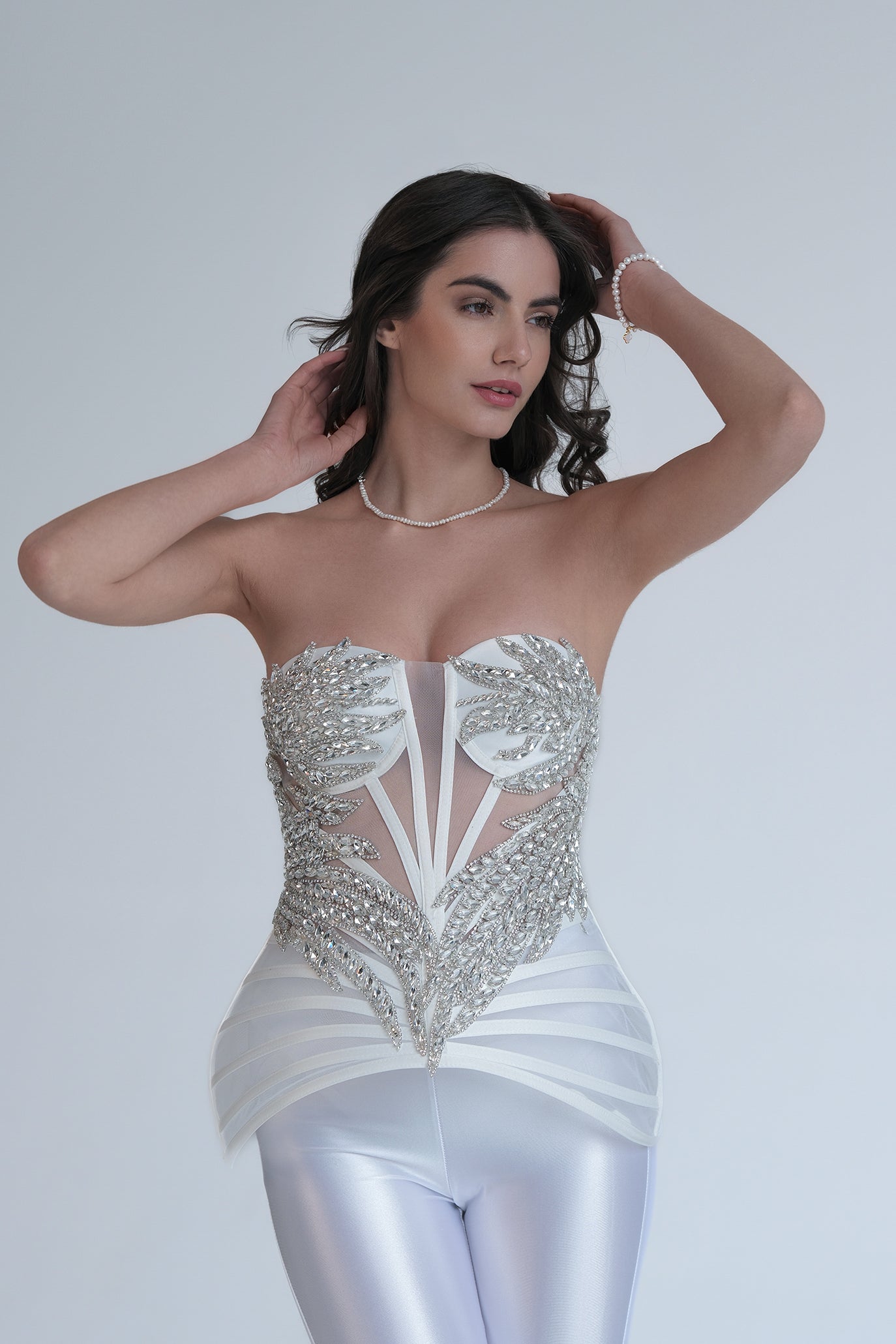 Елегантен корсет с изразителна визия и богато декорирани сребристи елементи. Моделът впечатлява с прецизно оформени апликации и прозрачни детайли, които подчертават силуета и придават драматичен и луксозен вид.