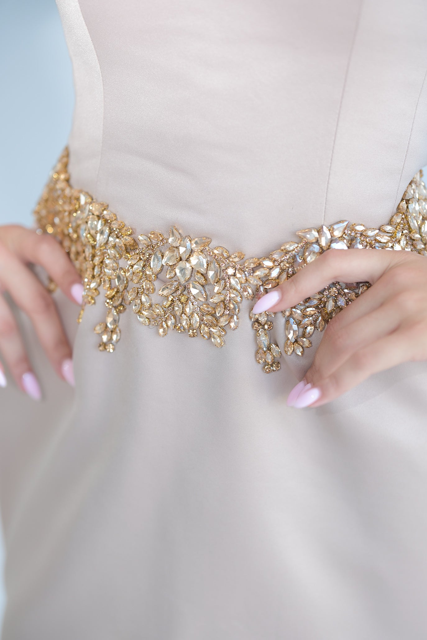 Луксозна, изцяло ръчно изработена къса рокля с нежни детайли от верижка блестящи кристали цирконий. Материята е висококачествена и плътна, благодарение на която долната част държи обемната си форма. Роклята е без презрамки, с вградени чашки. Отзад се закопчава с връзки. Може да бъде изработена според мерките на клиента срещу допълнително заплащане.