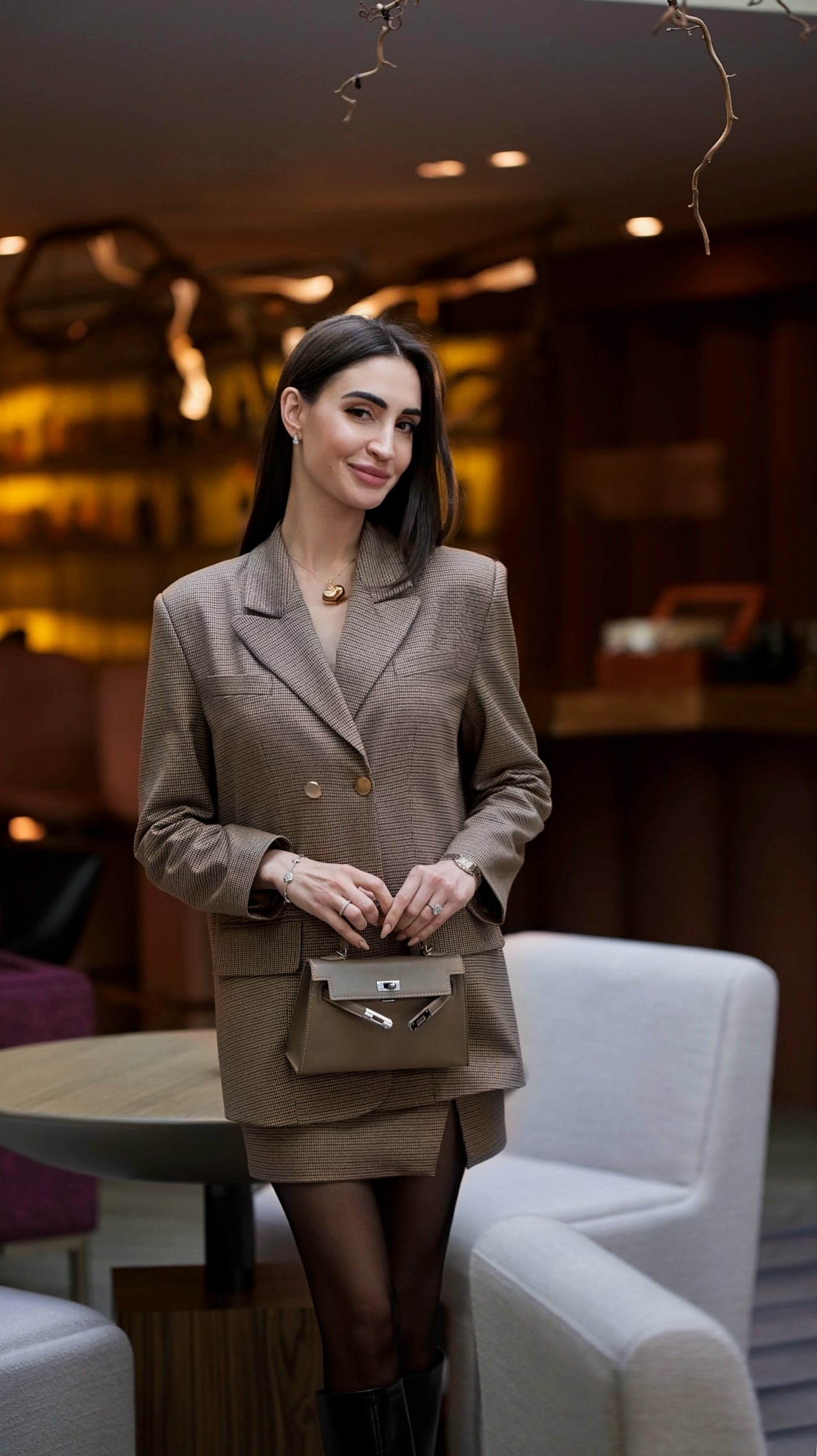 Стилен костюм, състоящ се от елегантно сако и пола с разкроена кройка. Изработен от висококачествено плетиво, което е меко на допир. Сакото е с елегантен минималистичен дизайн, с декоративни детайли и фина кройка. Полата завършва с нежно разкроена линия, закопчава се с цип отзад. И полата и сакото са с мека трикотажна подплата отдолу.