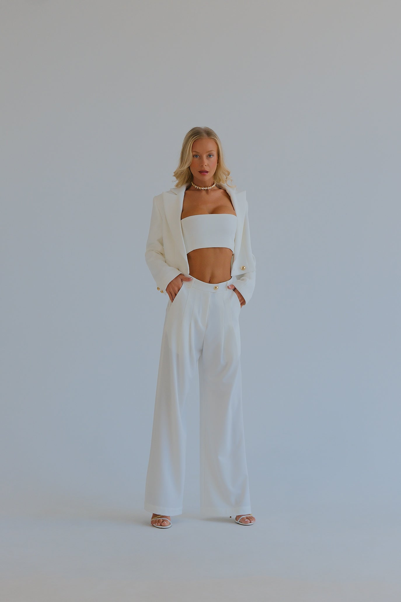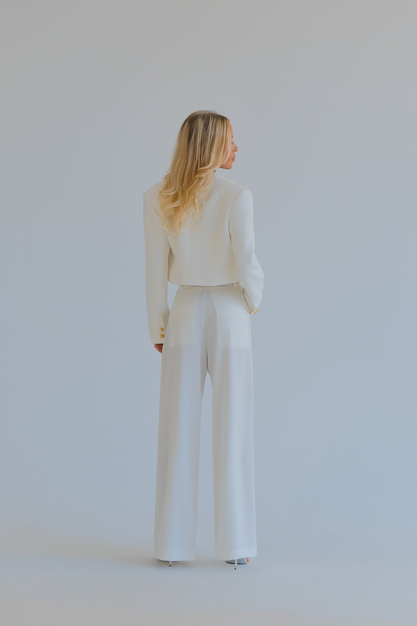 Модерен костюм с прецизна кройка и женствен силует. Късо сако оформя раменете и талията, топът стои изчистено, а дългият панталон с висока талия визуално издължава краката. Регулируемото връзване на топа осигурява перфектно прилягане. Размери L и XL се изработват след поръчка и уточняване на мерките на клиента.