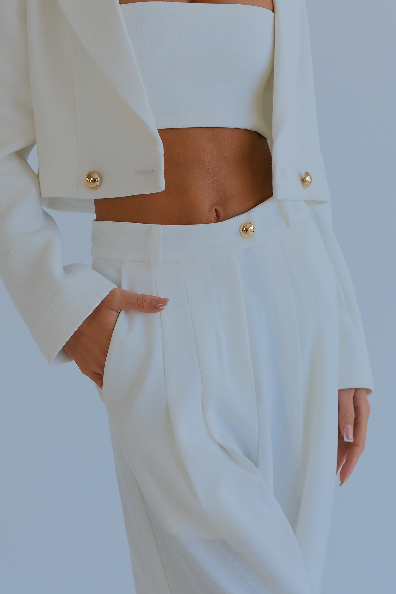 Комплектът включва: късо сако, топ, панталон с висока талия