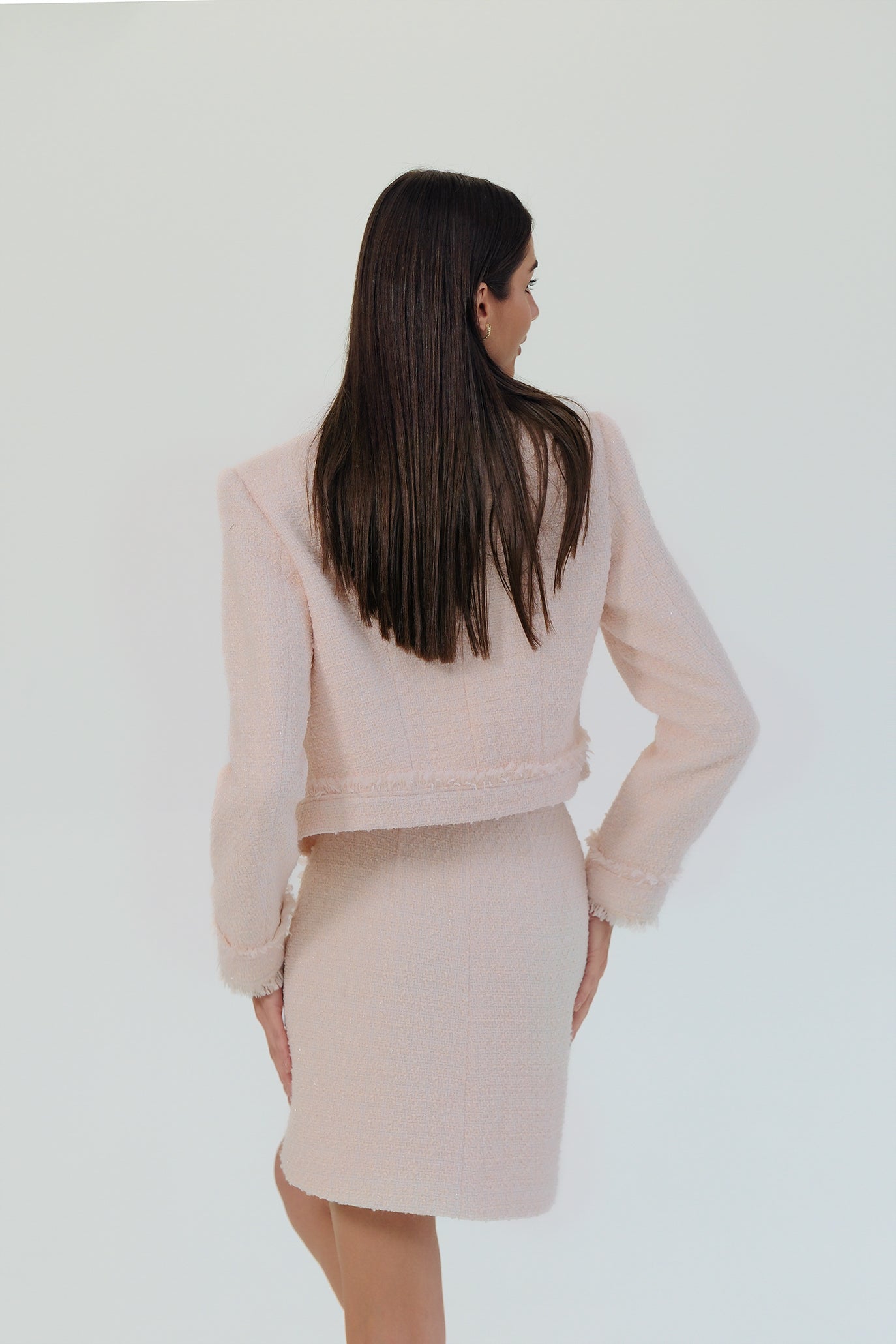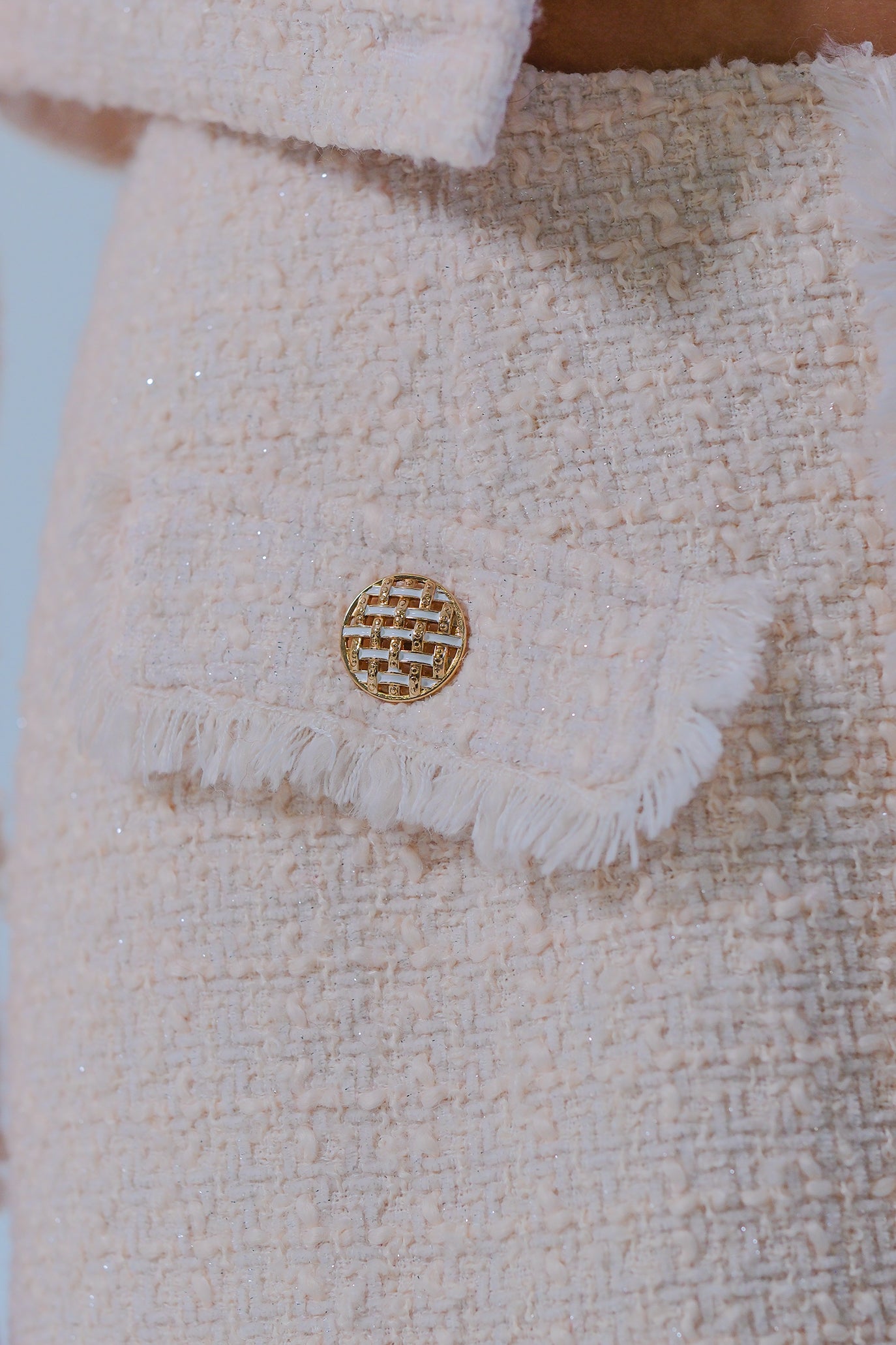 Елегантен комплект от букле – късо сако и мини пола в класическа линия. Сакото е с леко втален силует, ревер-яка, декоративни предни джобове с капачета и фини ресни по кантовете за „couture“ акцент. Полата е с висока талия и А-силует, завършена с капачета и копчета в златист тон, които кореспондират със сакото. Материята е меко букле с дискретен блясък, а вътрешността е с лека подплата за комфорт. Отдолу е с мек къс топ. Носете заедно като комплект или поотделно.