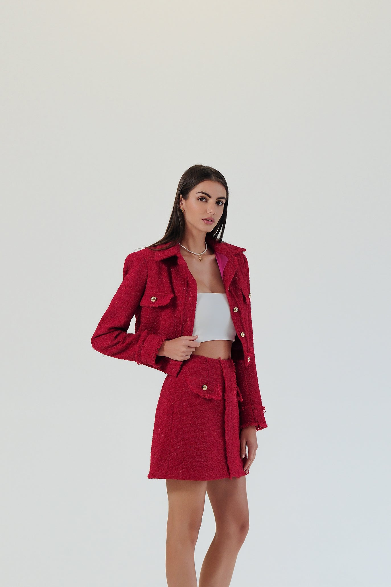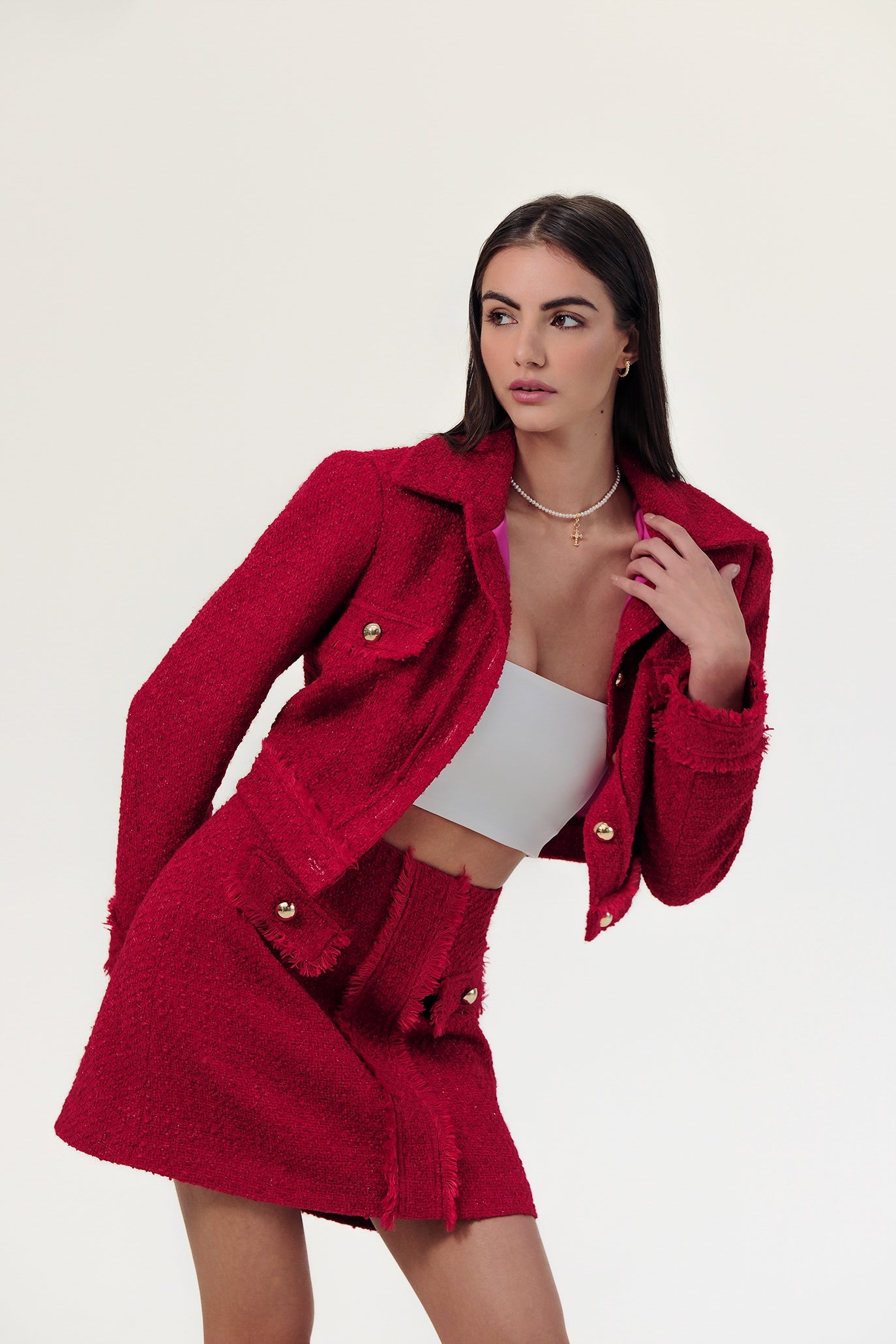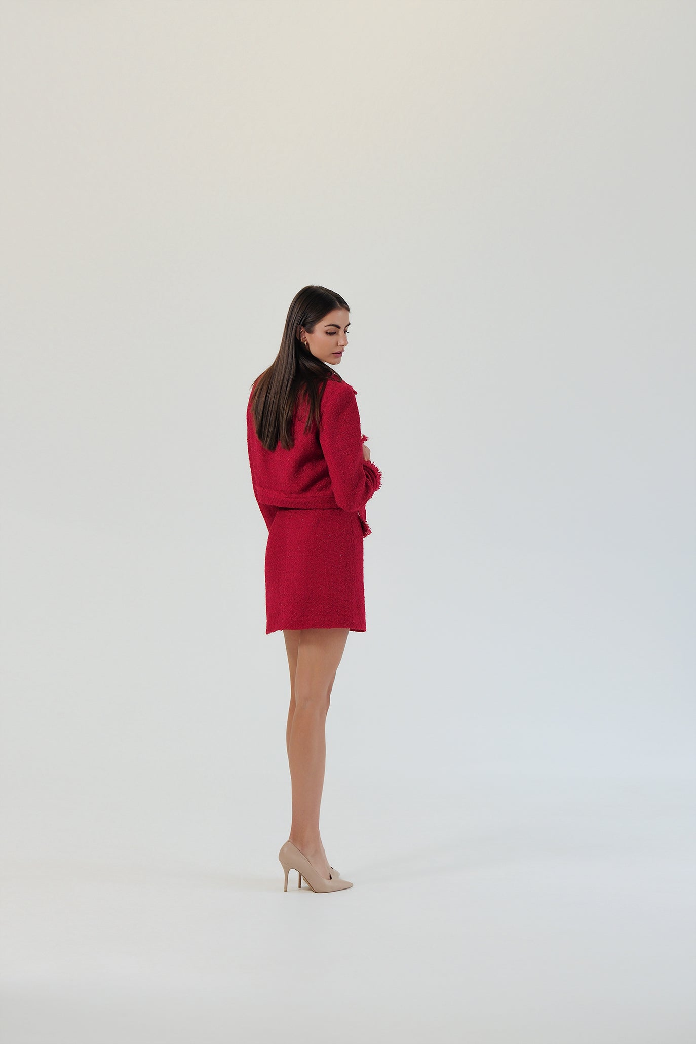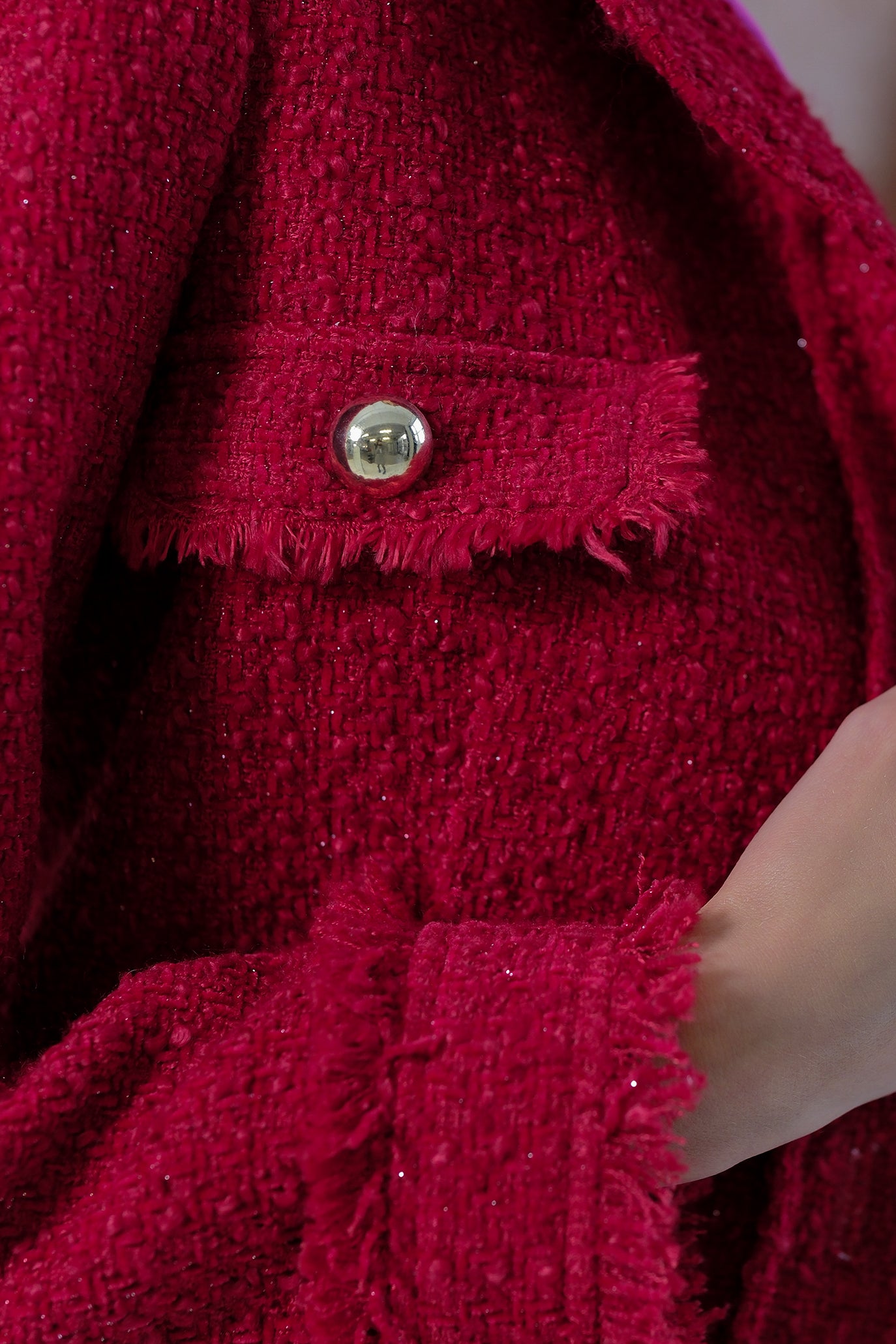 Елегантен комплект от букле – късо сако и мини пола в класическа линия. Сакото е с леко втален силует, ревер-яка, декоративни предни джобове с капачета и фини ресни по кантовете за „couture“ акцент. Полата е с висока талия и А-силует, завършена с капачета и копчета в златист тон, които кореспондират със сакото. Материята е меко букле с дискретен блясък, а вътрешността е с лека подплата за комфорт. Отдолу е с мек къс топ. Носете заедно като комплект или поотделно.