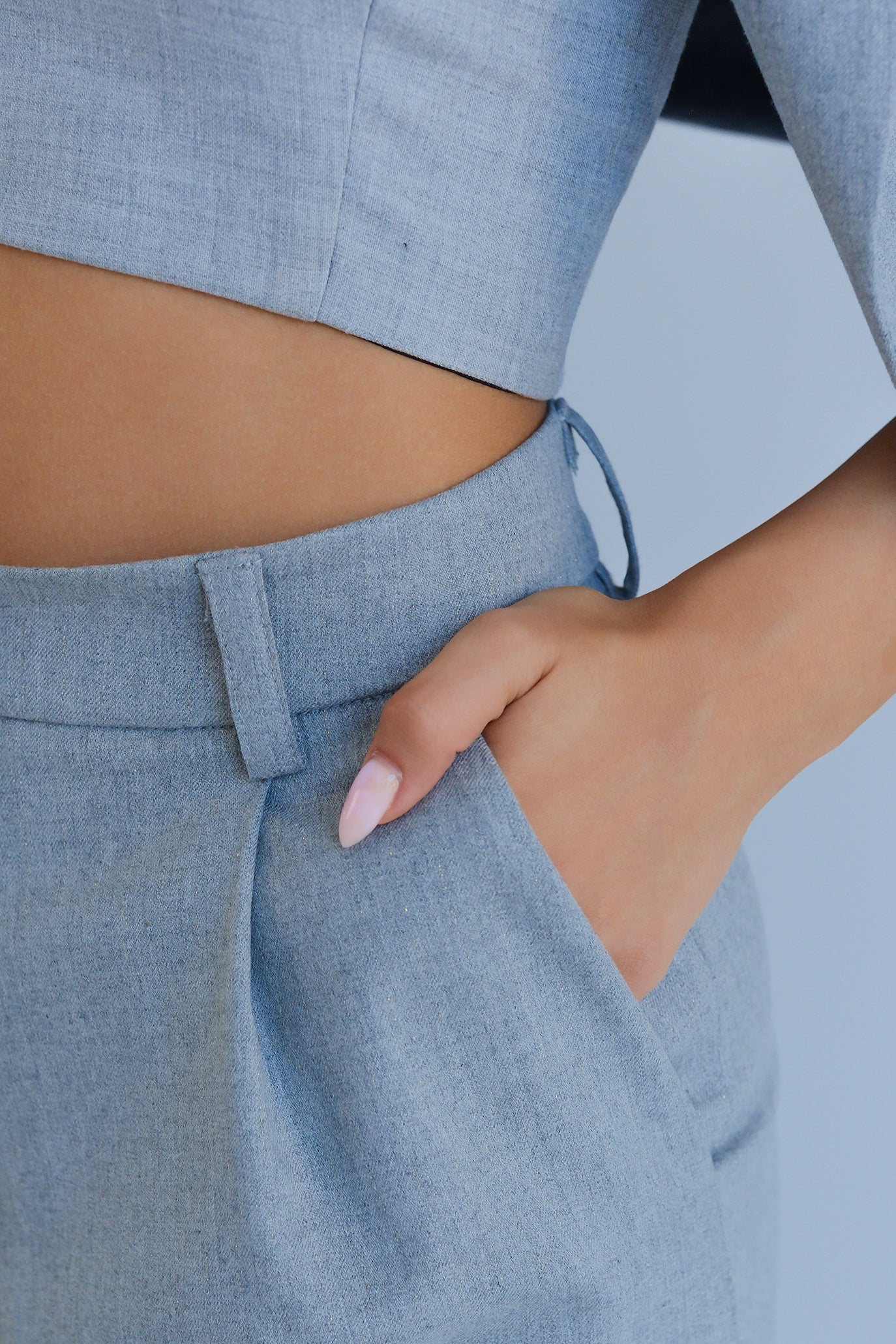 Модерен костюм с прецизна кройка и женствен силует. Късо сако оформя раменете и талията, топът стои изчистено, а дългият панталон с висока талия визуално издължава краката. Регулируемото връзване на топа осигурява перфектно прилягане. Размери L и XL се изработват след поръчка и уточняване на мерките на клиента.