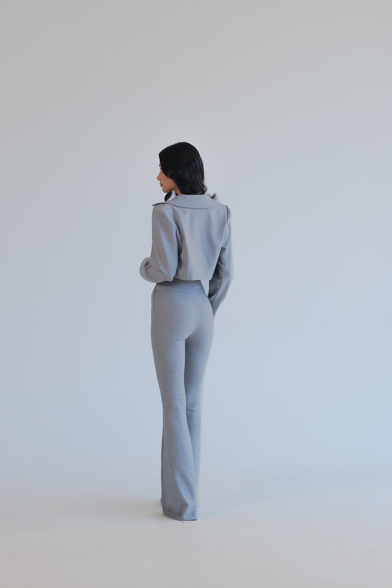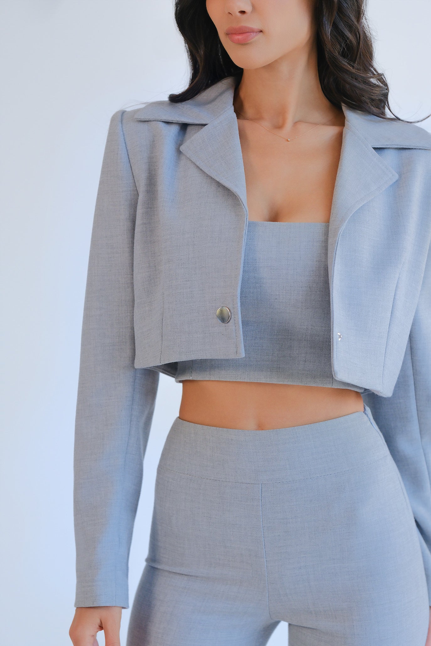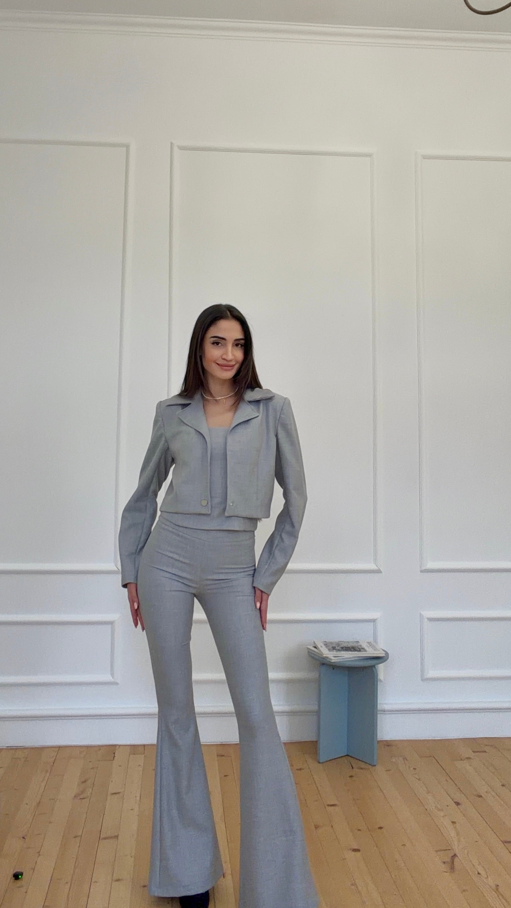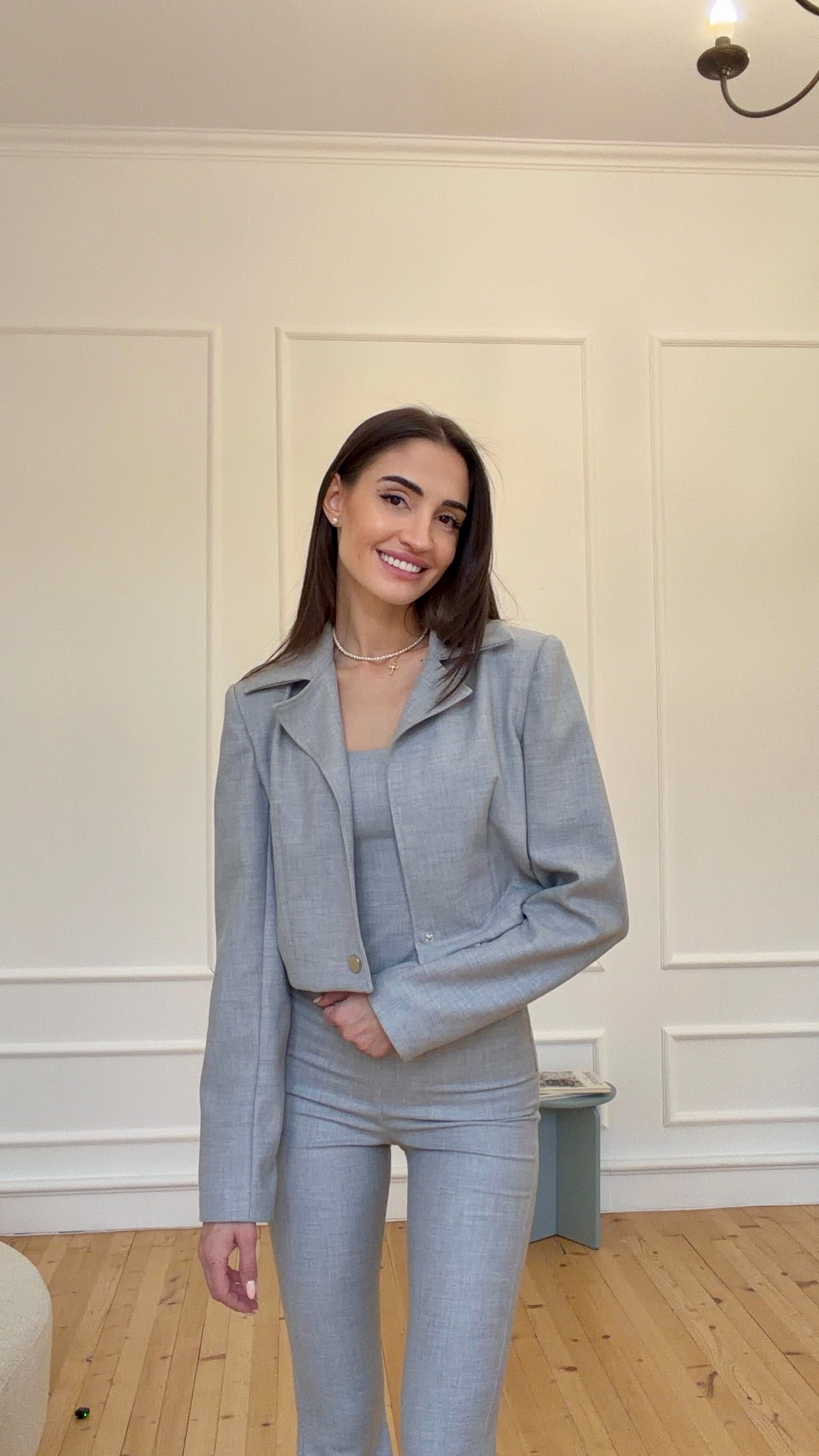 Комплектът включва три части – панталон с висока талия, къс топ и късо сако.