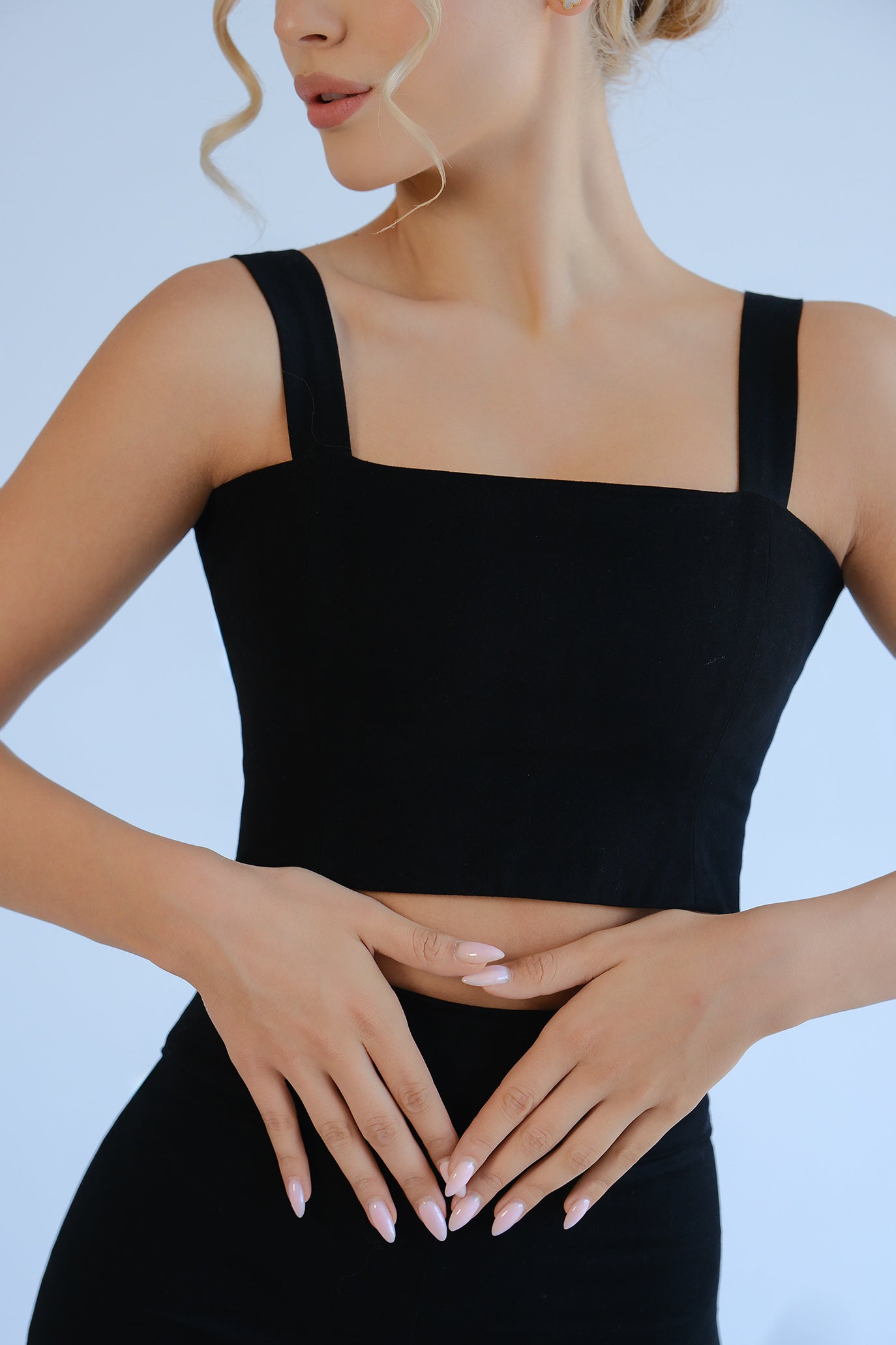 Удобен и елегантен костюм от три части. Панталонът с висока талия и разкроени крачоли издължава силуета. Отстрани се закопчава с цип. Плътната материя има стягащ ефект, прибира и оформя краката. Топът се пристяга с връзки отзад, за максимален комфорт. Сакото е късо, с тик-так копчета. Материята е подбрана така, че да приляга по тялото без да ограничава движението, а цветът го прави универсален избор за дневни събития или вечерни излизания. Подходящ и за стилна бизнес визия.