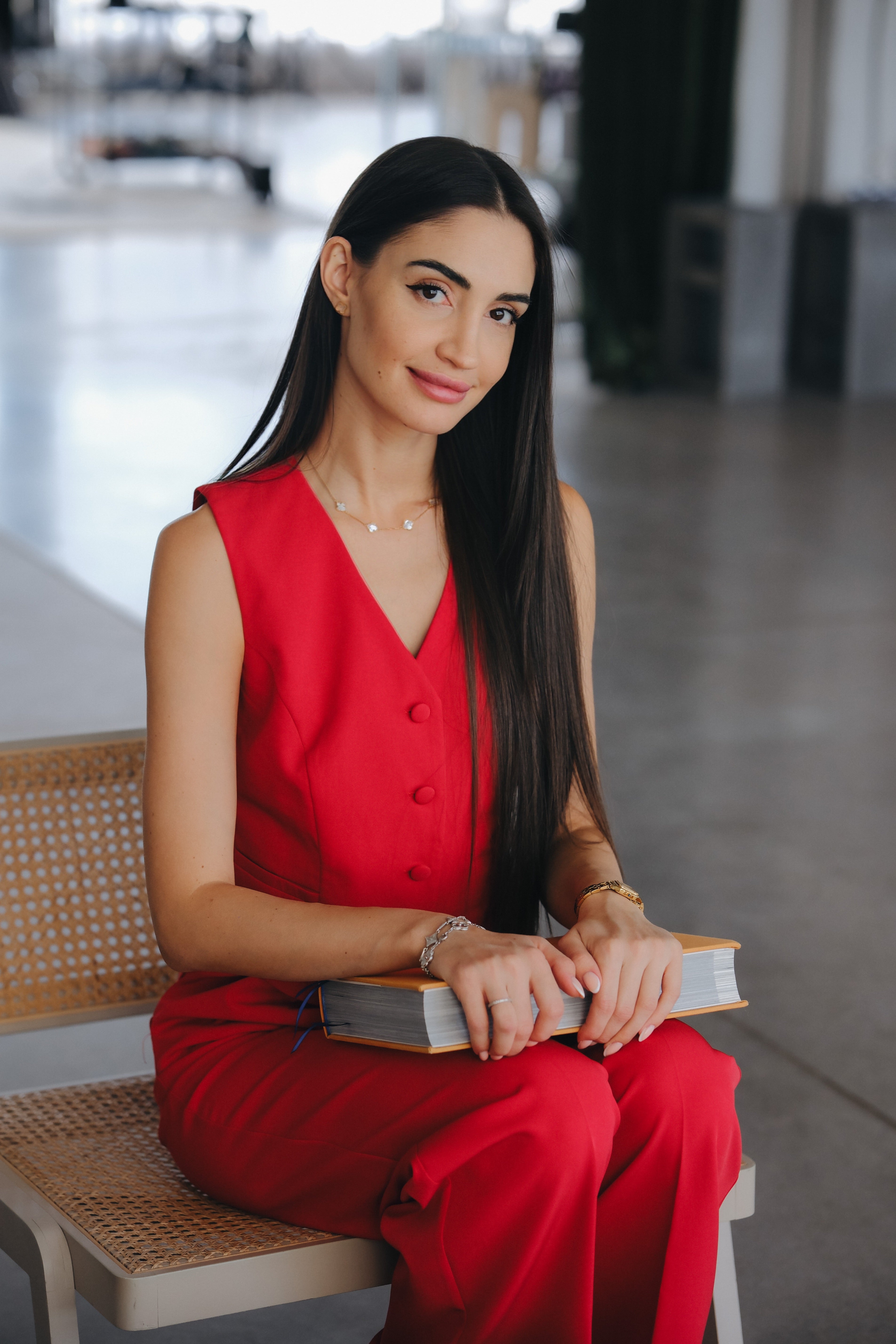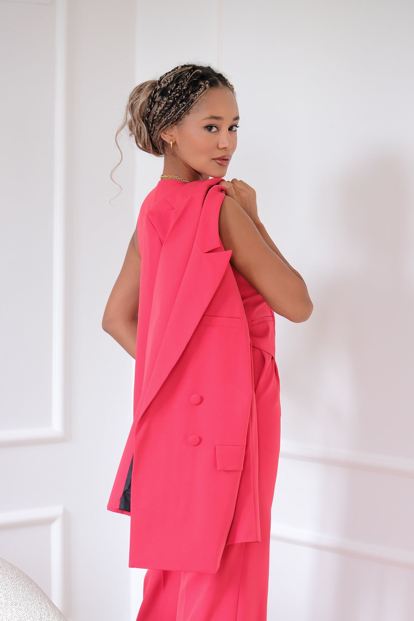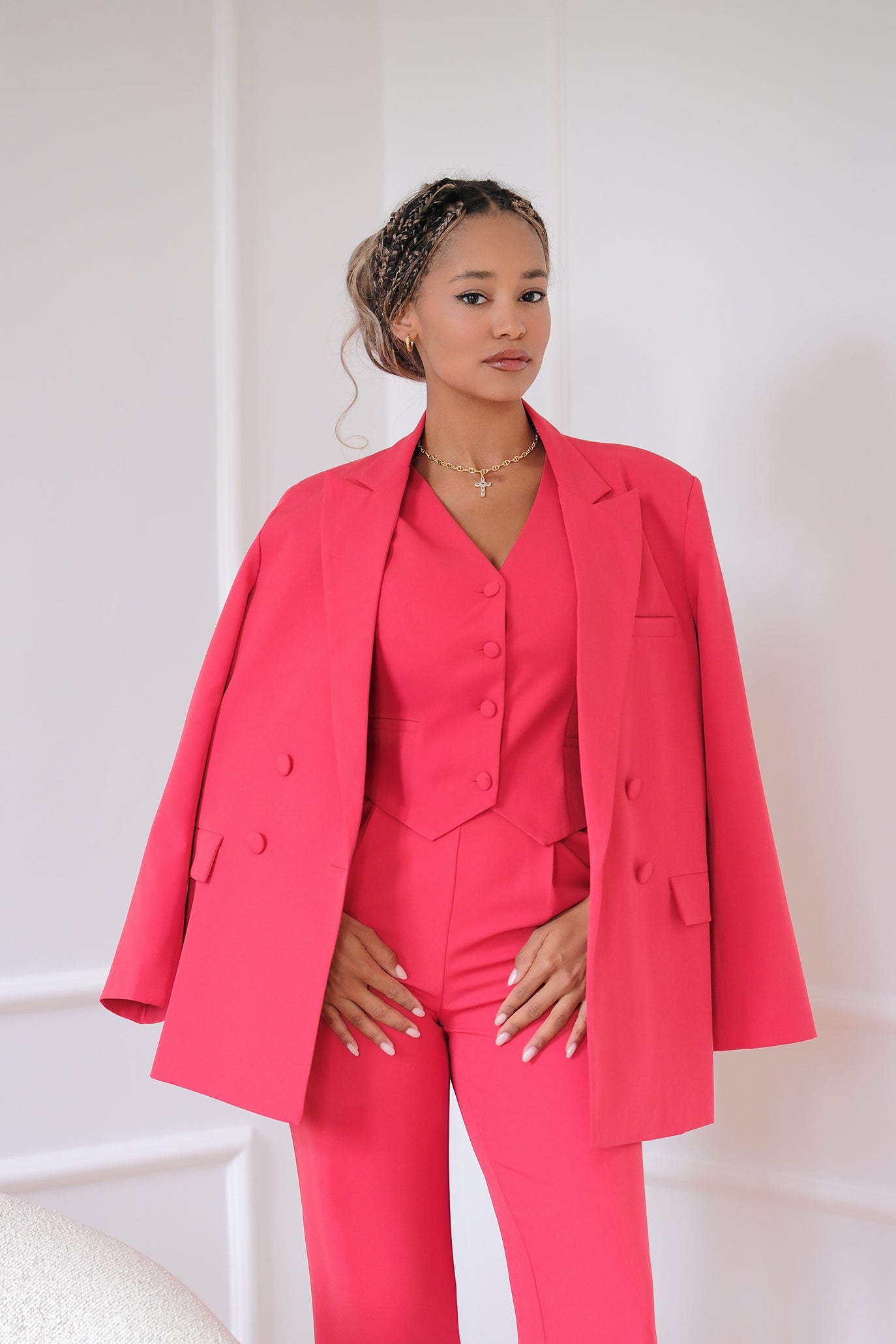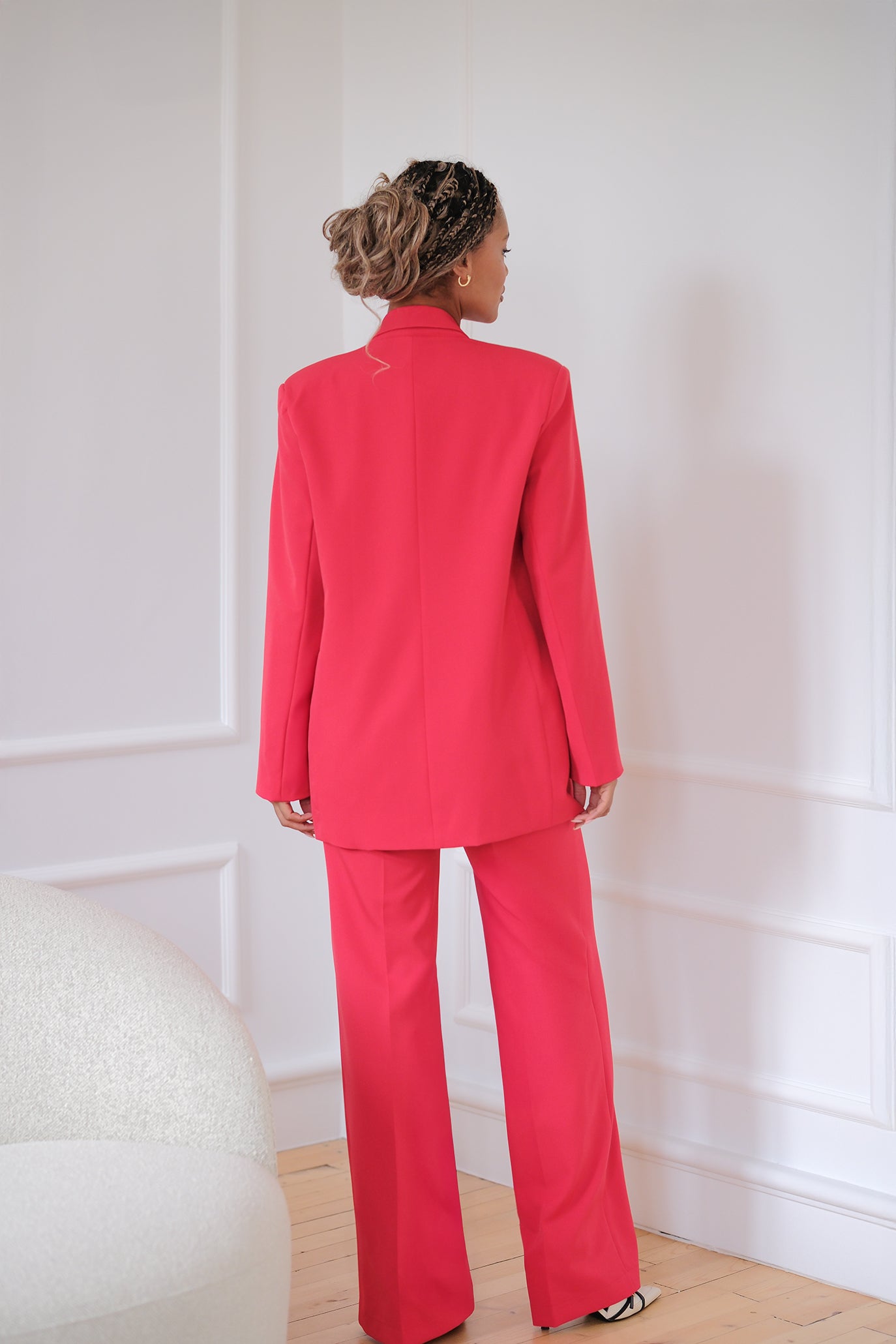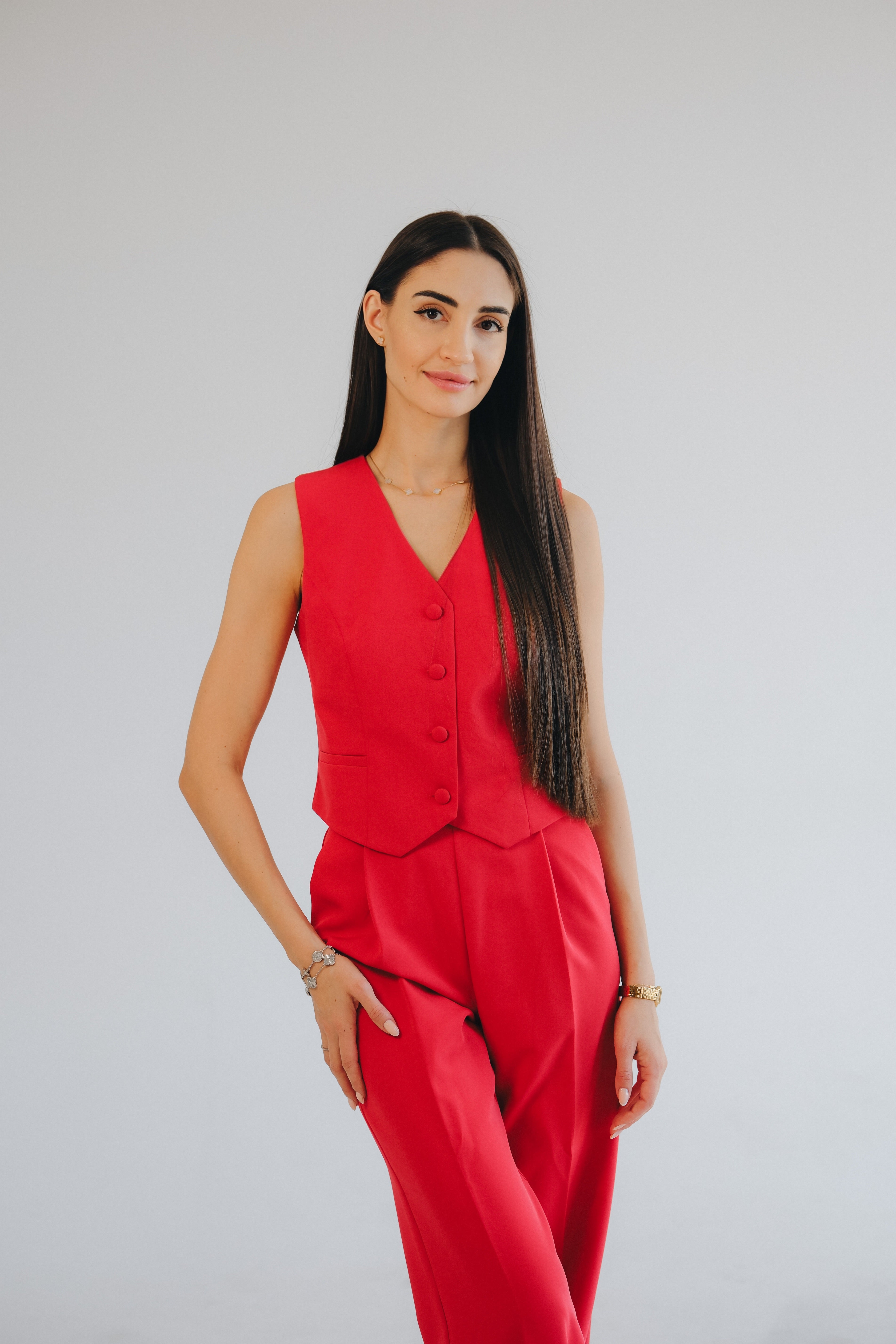 Костюм от висок клас на изработка. Кройката на сакото е тип овърсайз и леко по-дълго. Има подплата. Може да се закопчее отпред с копчета. Панталонът е с висока талия и прав крачол. Подчертава талията и визуално издължава краката. Елечето може да се носи самостоятелно или върху риза, блуза. Цветът е изкусително червен.