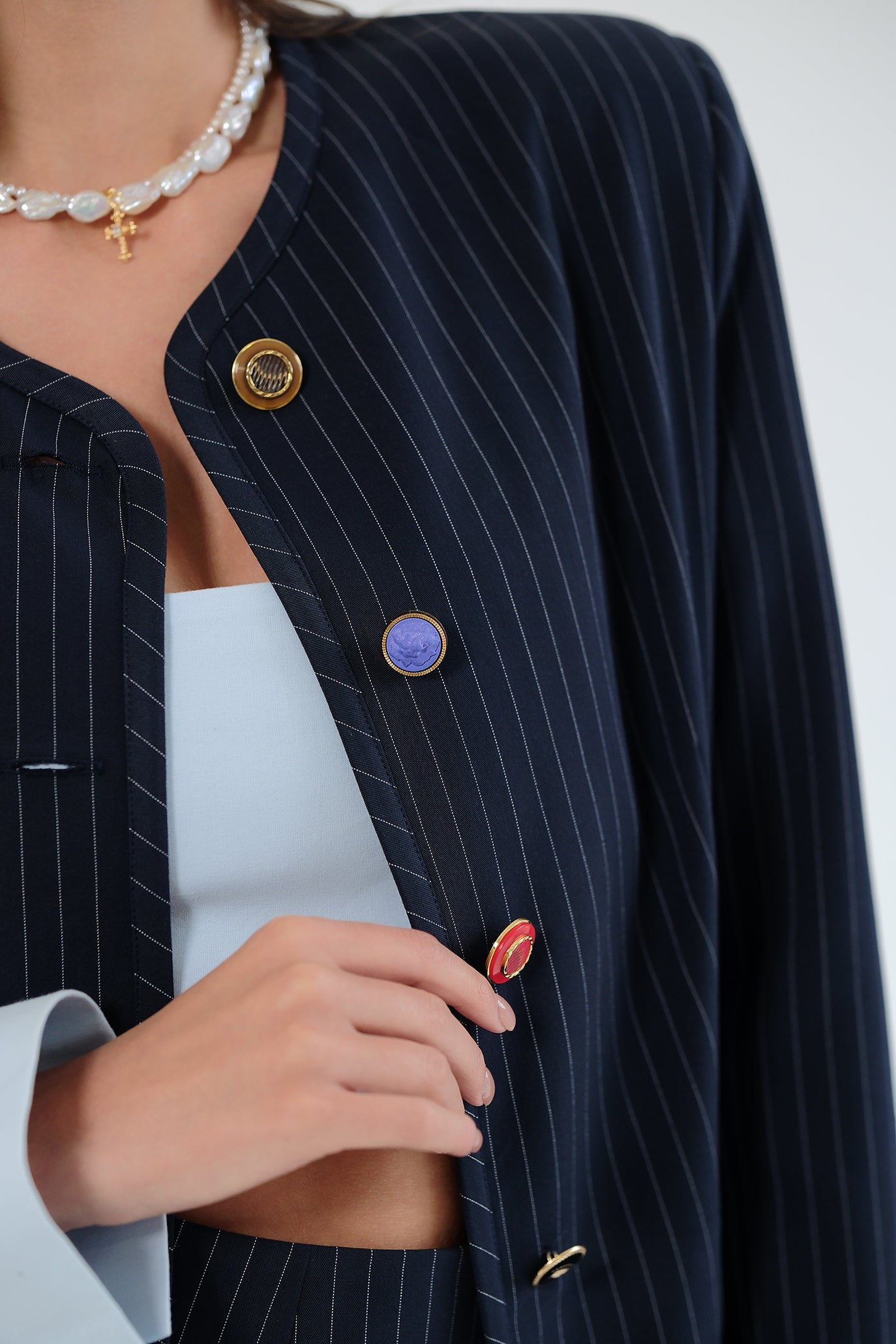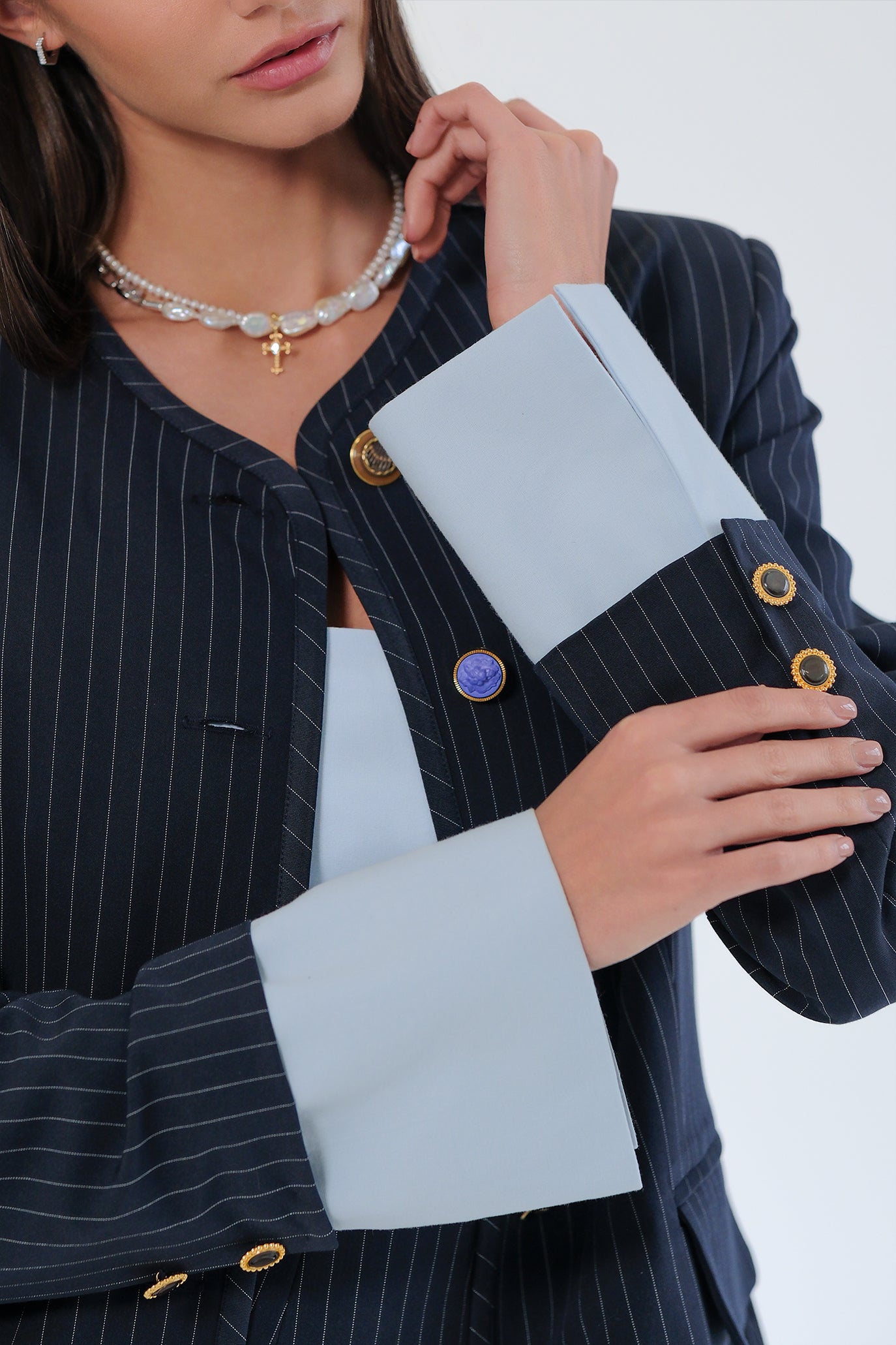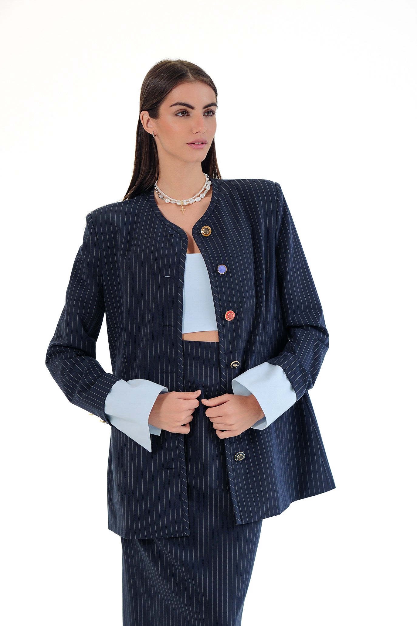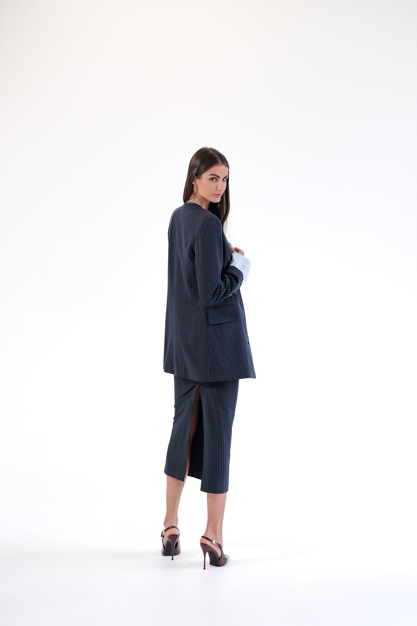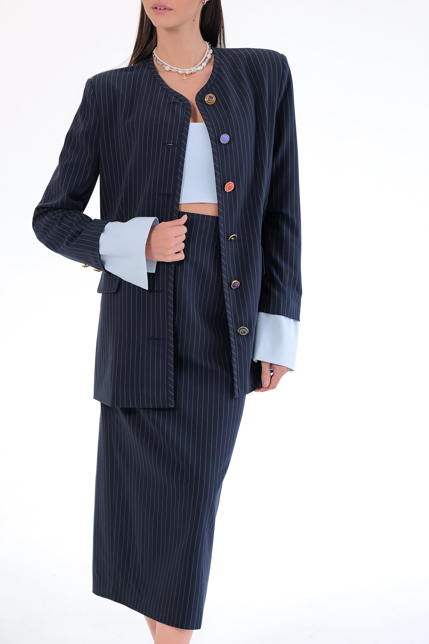 Костюм от две части, състоящ се от сако и пола молив. Сакото е с леко втален прав силует, без ревери и с контрастни маншети, които подчертават линията на ръкавите. Върху маншетите може да се персонализира с бродиране срещу допълнително заплащане. Елегантните метални копчета и мини пайетите, пришити в райетата, придават завършен луксозен акцент. Полата е с права линия и удобна дължина „миди“ – идеална както за официални поводи, така и за стилни дневни визии.