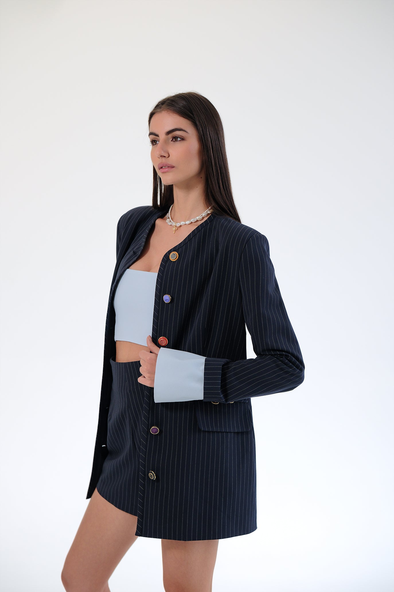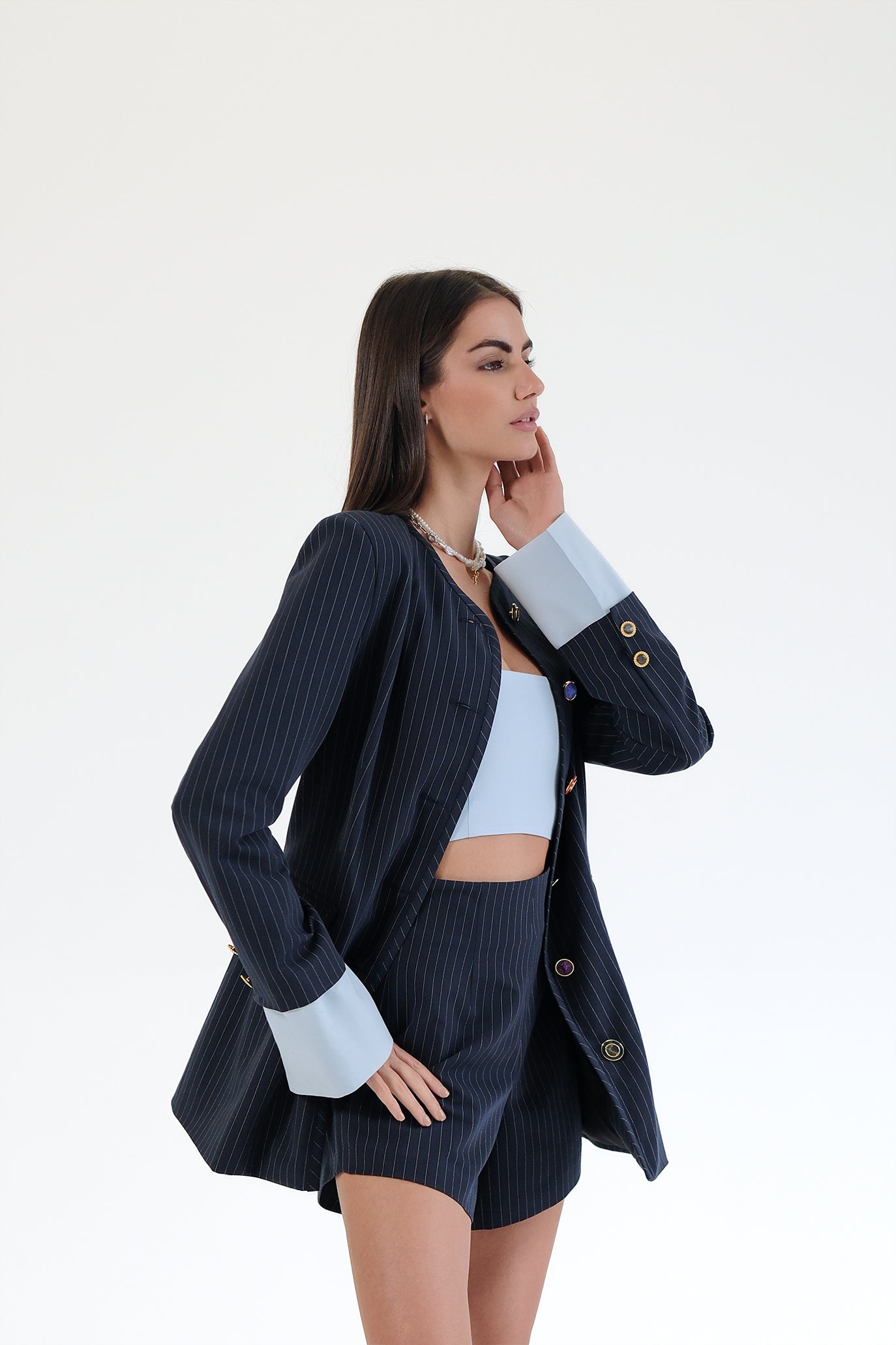 Костюм от две части, състоящ се от сако и къси панталони. Сакото е с леко втален прав силует, без ревери и с контрастни маншети, които подчертават линията на ръкавите. Върху маншетите може да се персонализира с бродиране срещу допълнително заплащане. Елегантните метални копчета и мини пайетите, пришити в райетата, придават завършен луксозен акцент. Шортите са с права линия и удобна дължина „мини“ – идеални както за официални поводи, така и за стилни дневни визии.