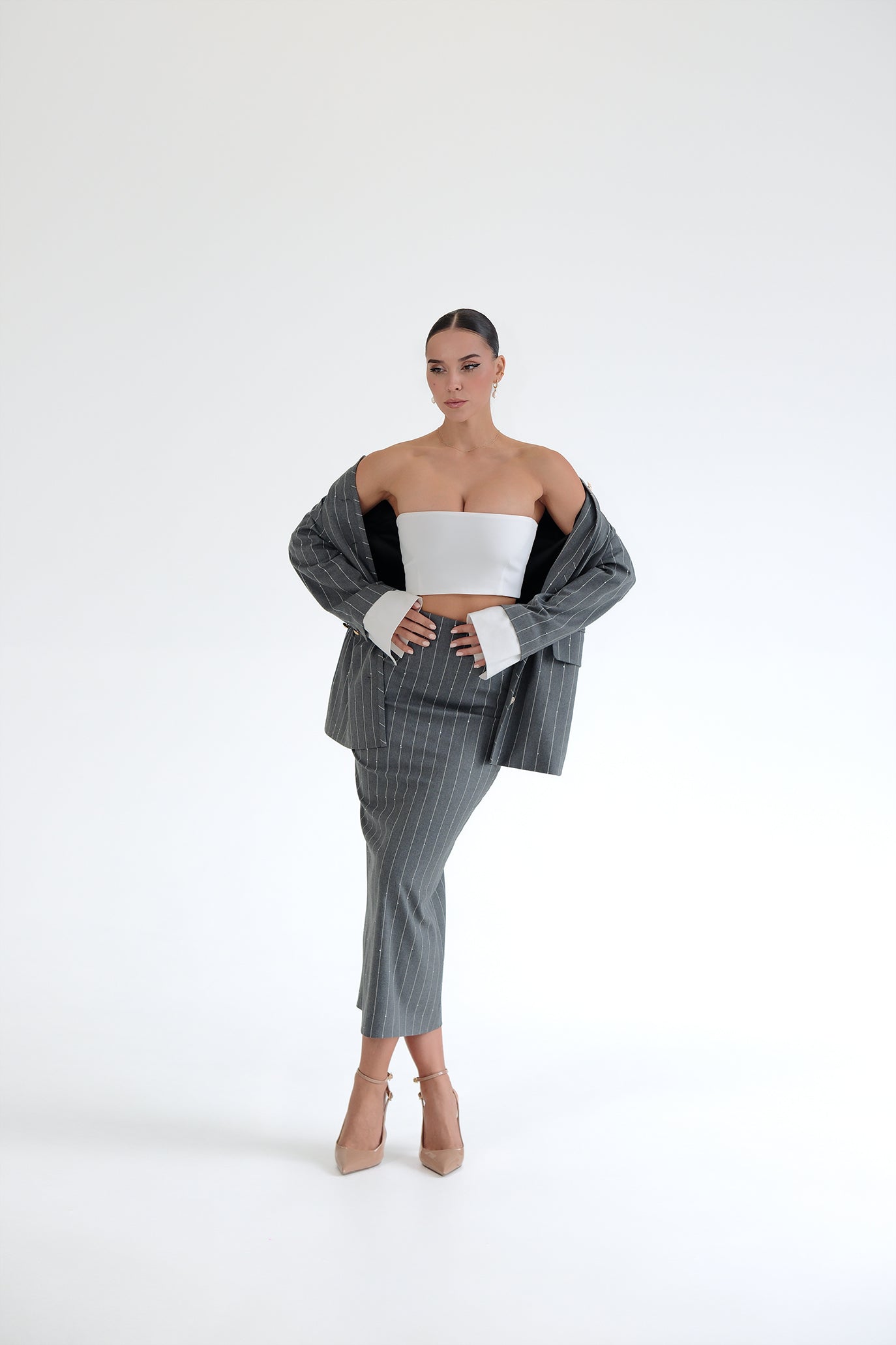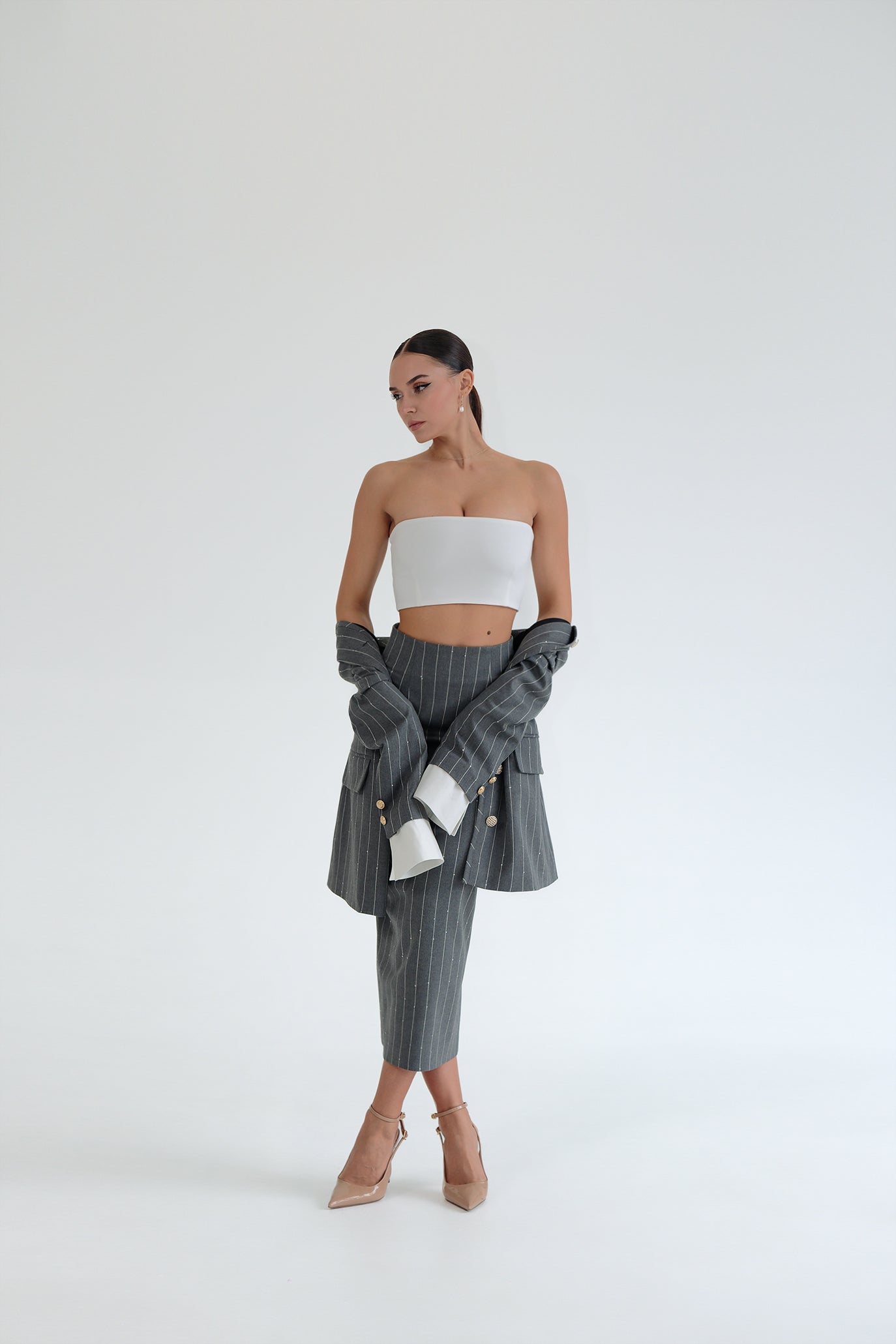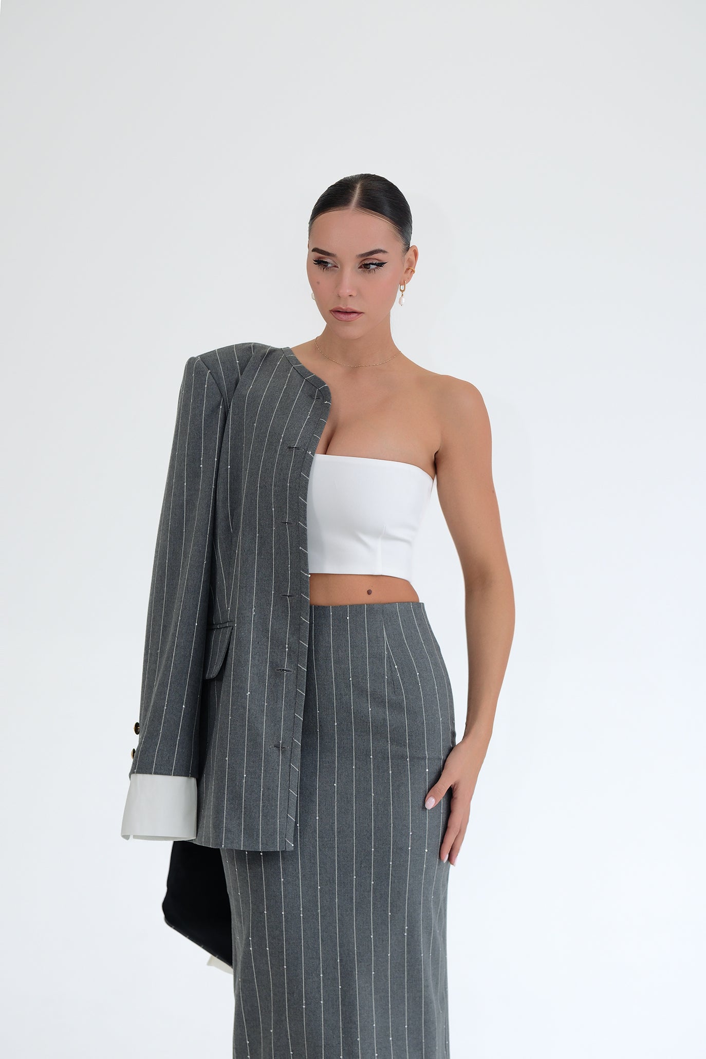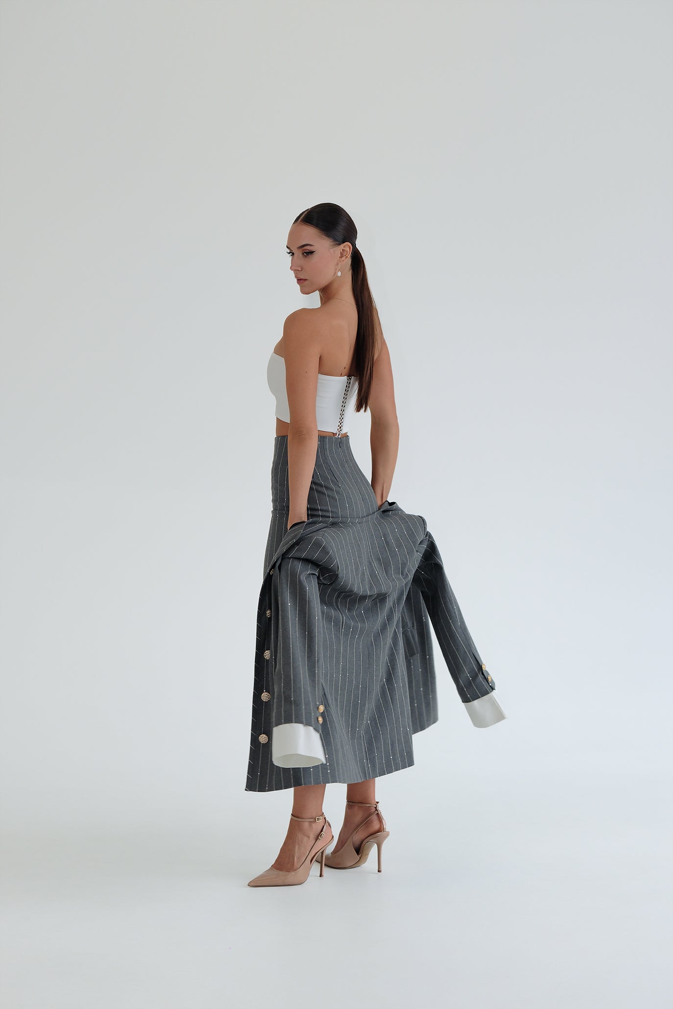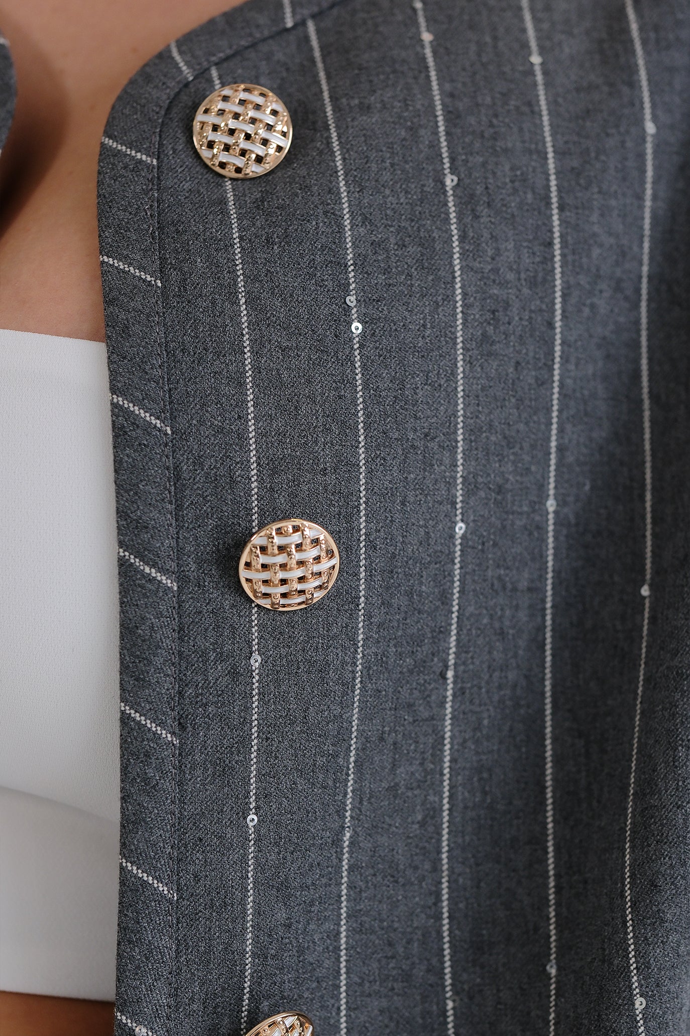 Костюм от две части, състоящ се от сако и пола молив. Сакото е с леко втален прав силует, без ревери и с контрастни маншети, които подчертават линията на ръкавите. Върху маншетите може да се персонализира с бродиране срещу допълнително заплащане. Елегантните метални копчета и мини пайетите, пришити в райетата, придават завършен луксозен акцент. Полата е с права линия и удобна дължина „миди“ – идеална както за официални поводи, така и за стилни дневни визии.