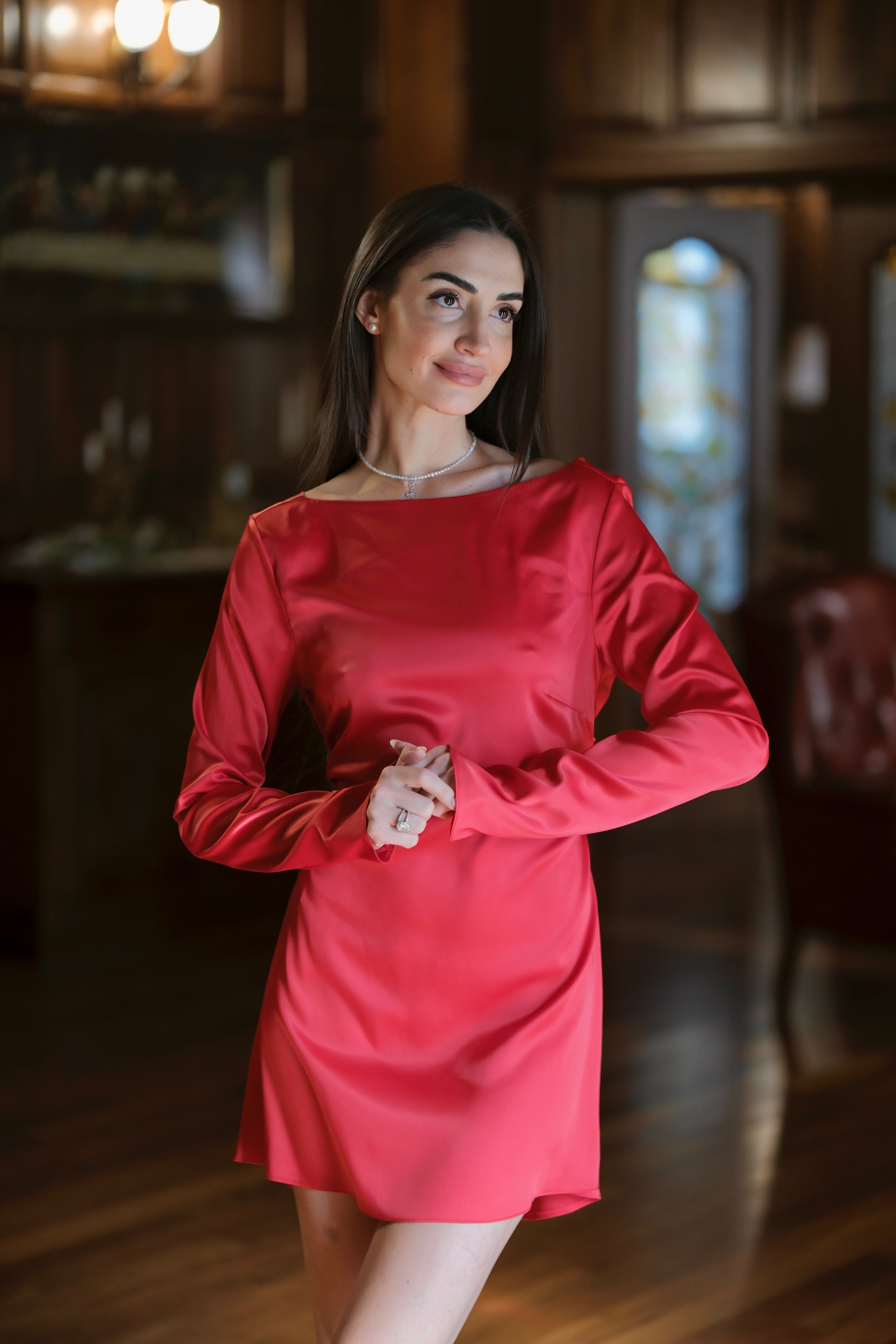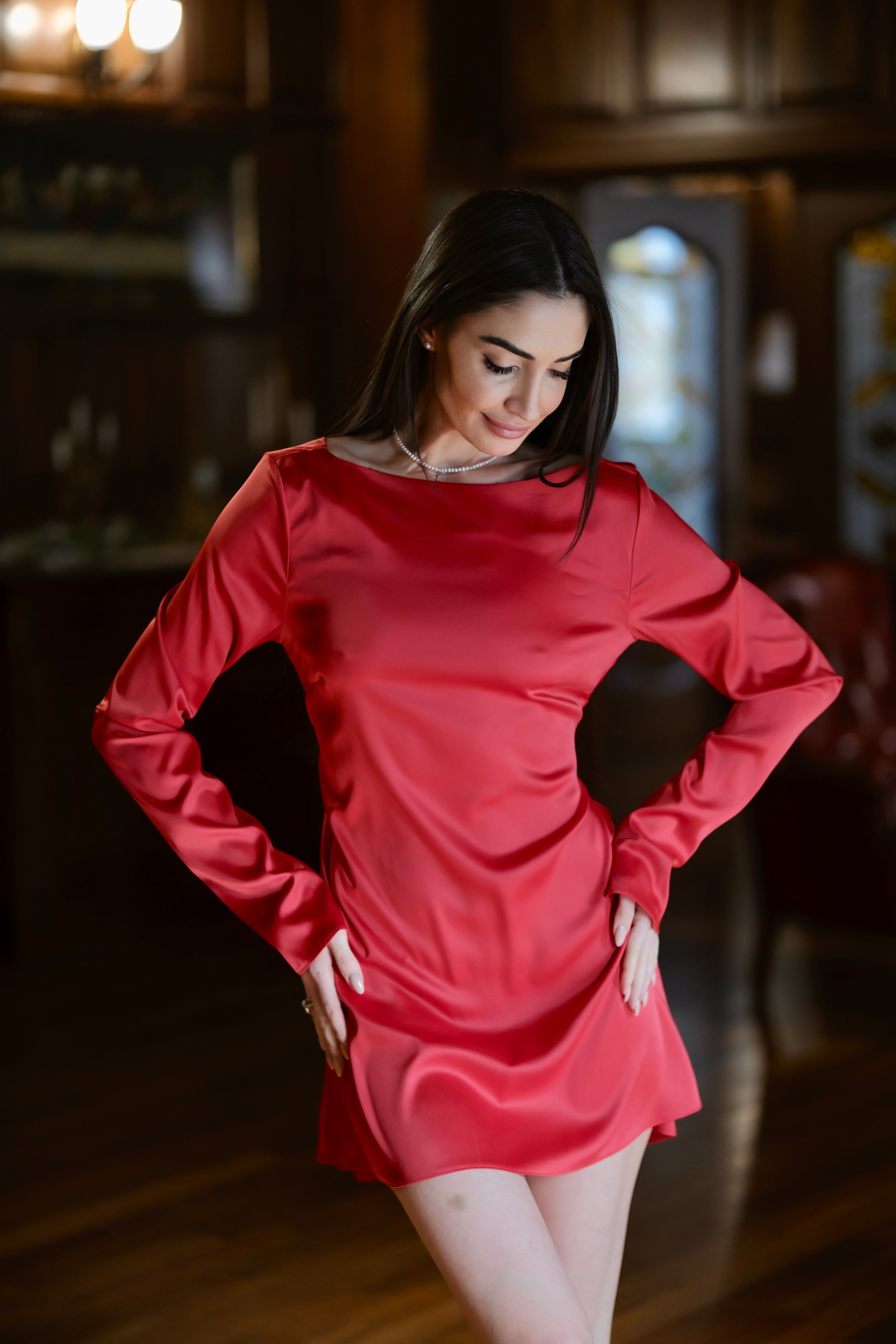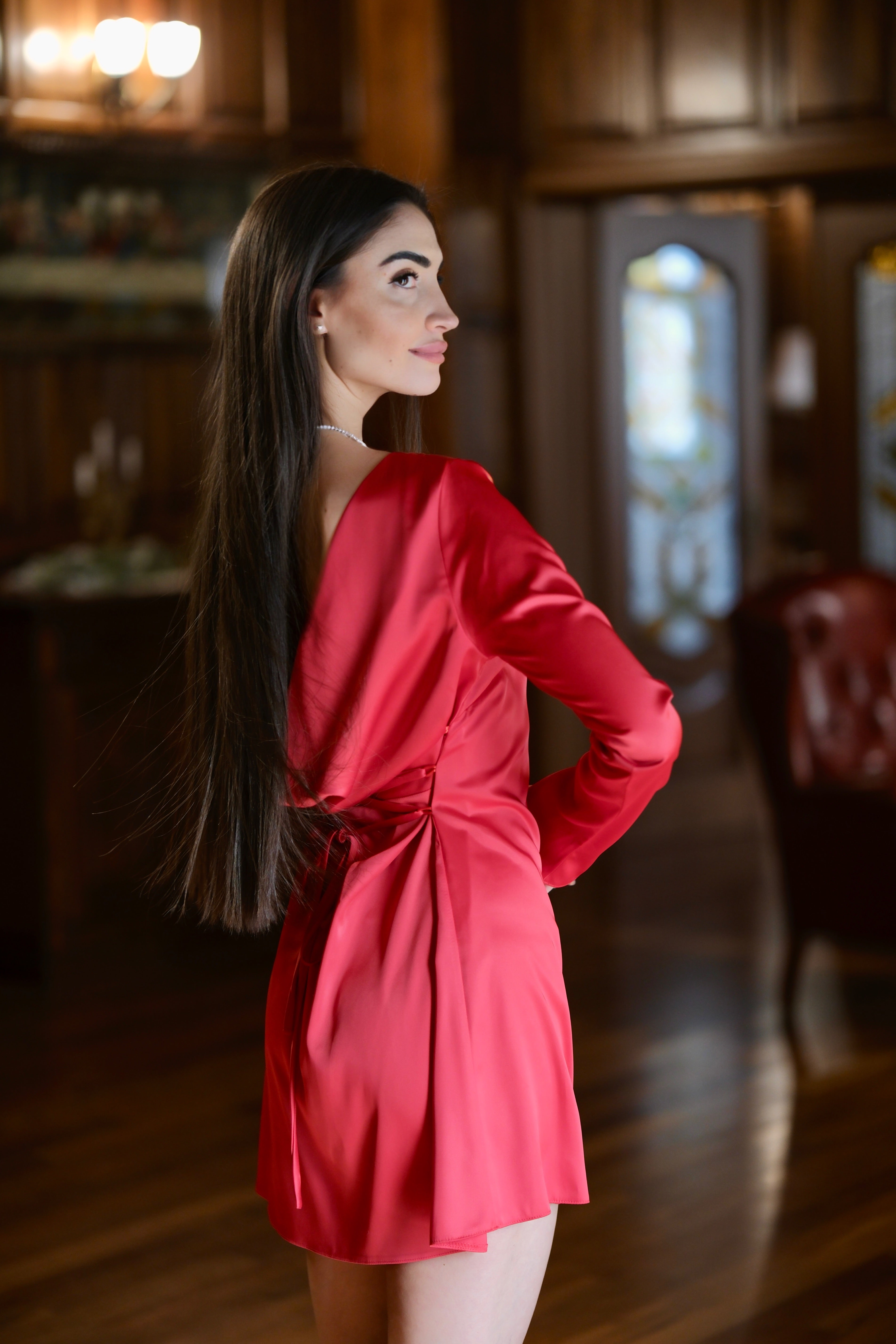 Минималистична, но въздействаща. Създадена от гладък сатен, който се движи с тялото. Предната част е с изчистено деколте, а гърбът впечатлява с дълбоко отворен гръб тип "водопад". Връзките за пристягане подчертават талията и позволяват индивидуално прилягане. Удължените ръкави са елегантни и удобни. По желание може да се добави шалче.