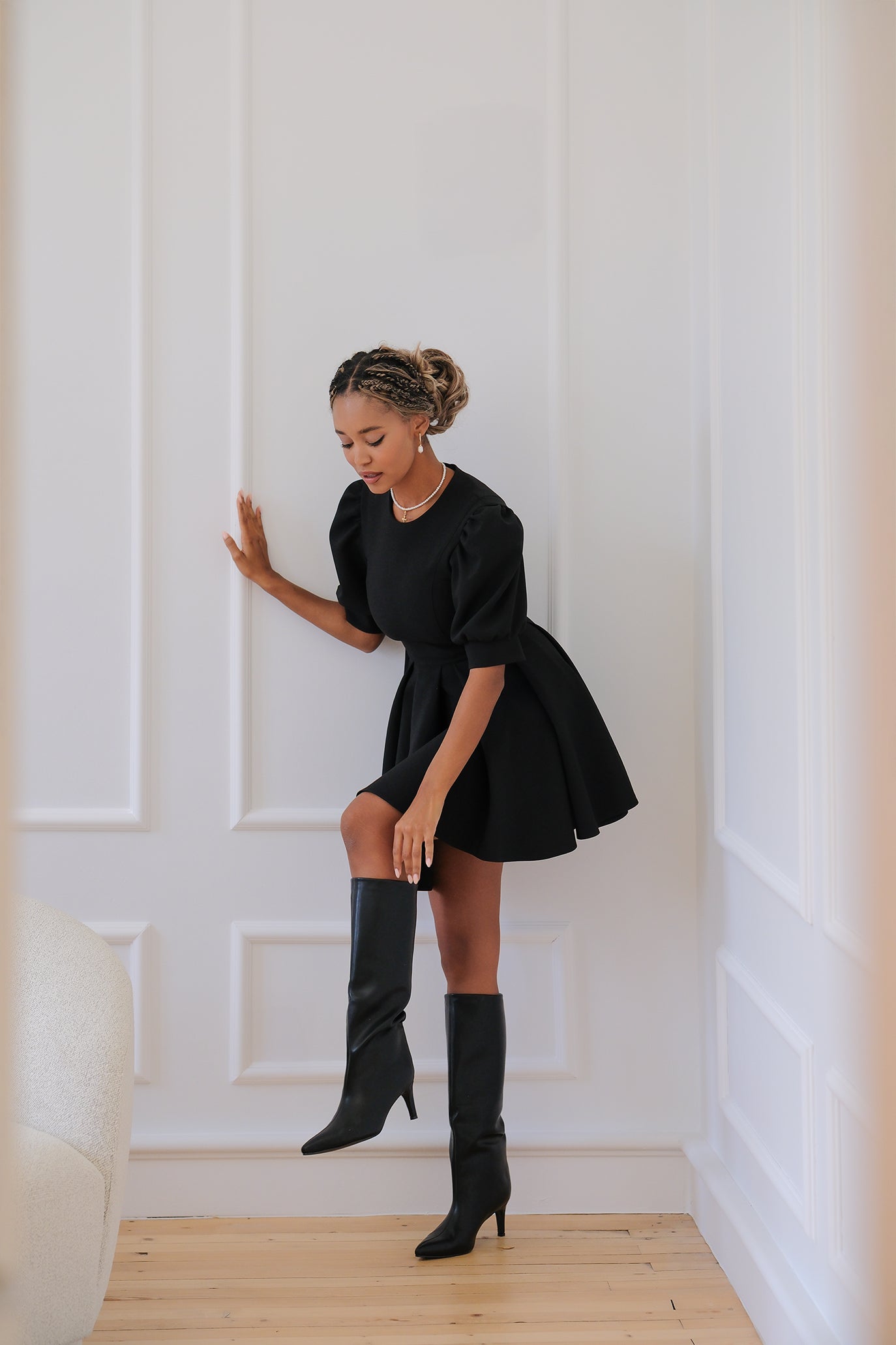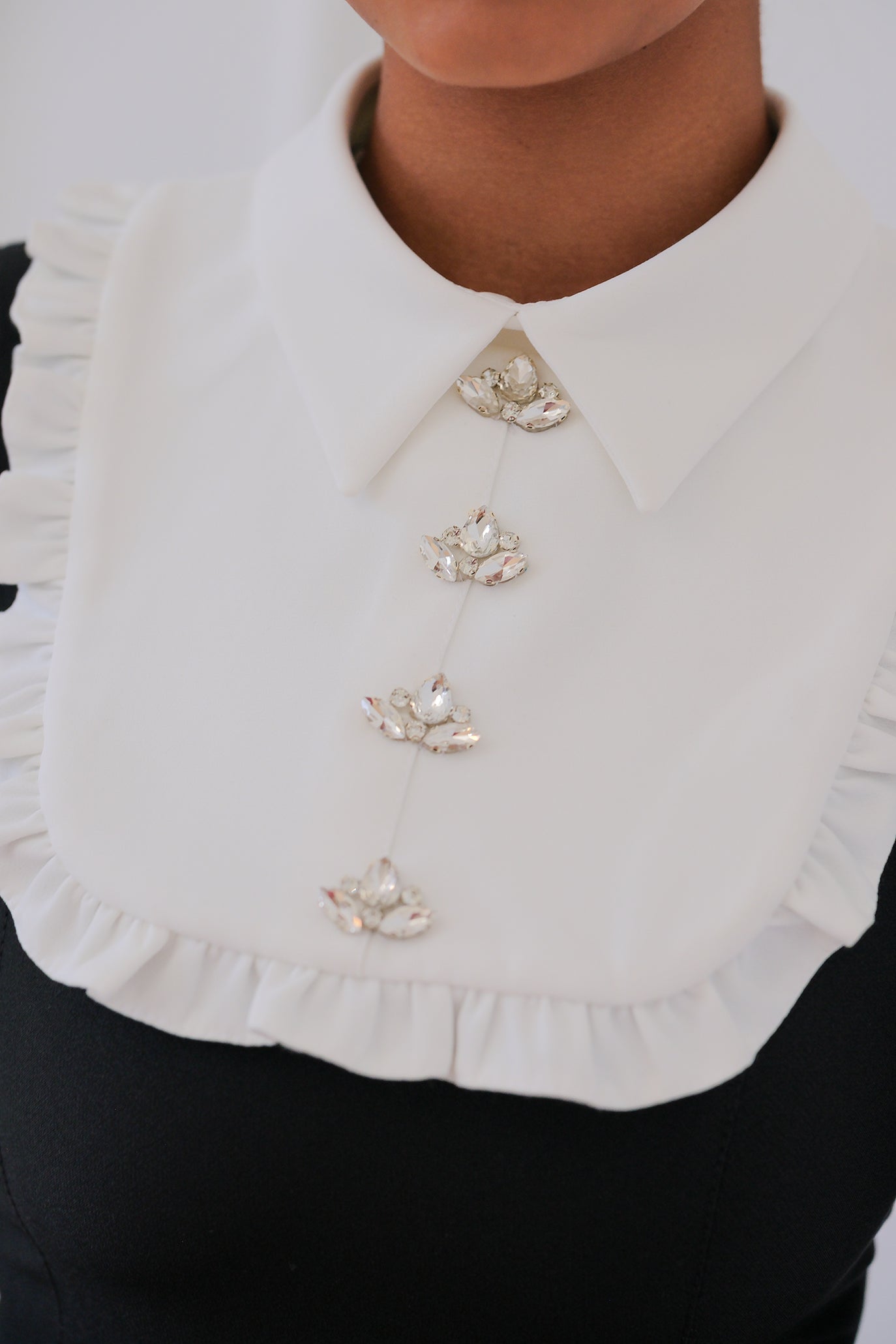 Dress made of light, pleasant fabric. With an hourglass shape and mid-thigh length. It has a white collar that can be removed if desired. And the buttons with sparkling stones complete the wonderful look.