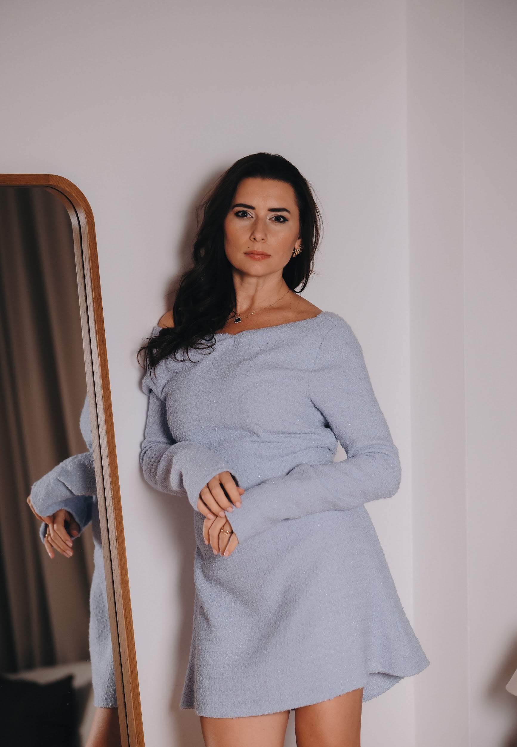 Рокля, която стопля есенните дни като прегръдка. Изработена от висококачествена материя, подобна на букле, която е изключително мека. Визията излъчва неподражаема класа с деколтето с паднало рамо и дълбокият гръб тип "водопад". Отзад се пристяга с връзки, което не само персонализира удобството, но и подчертава талията.