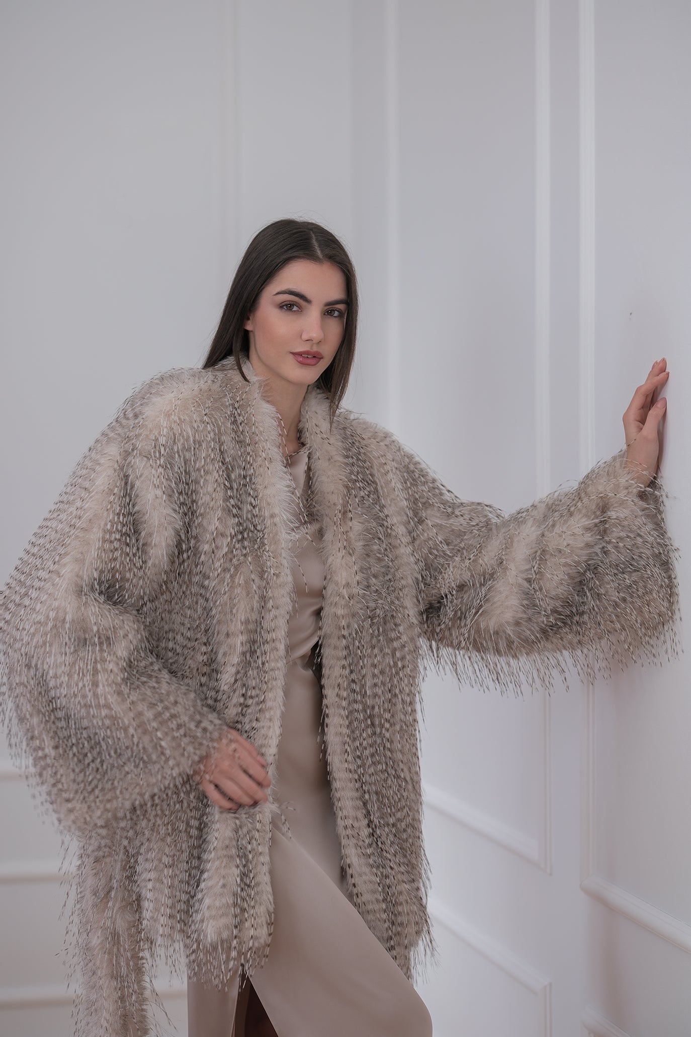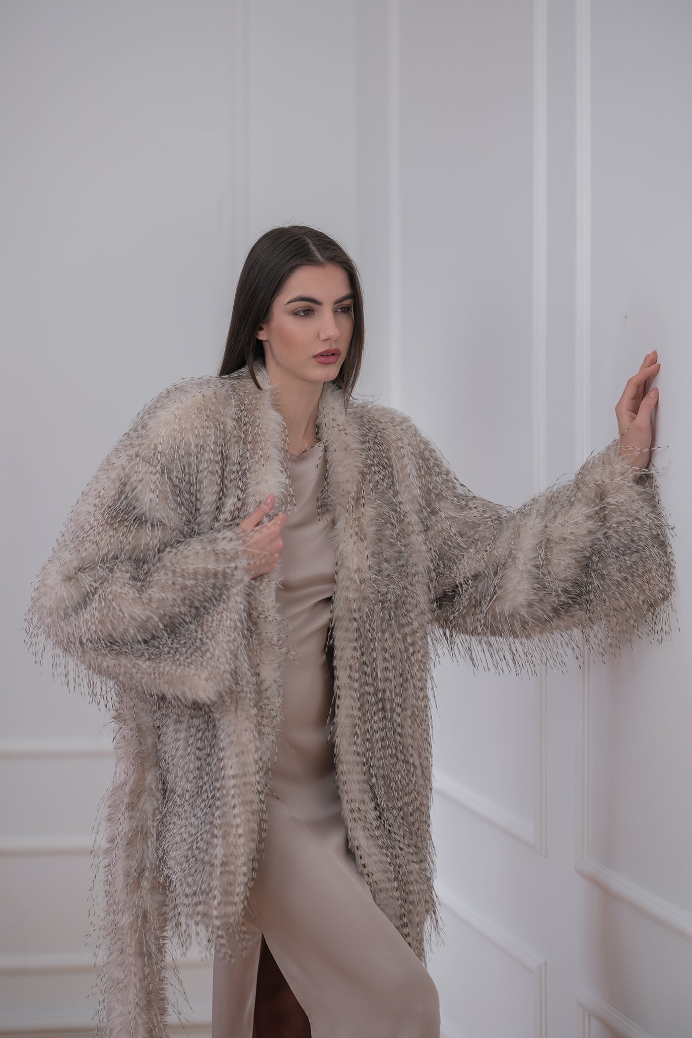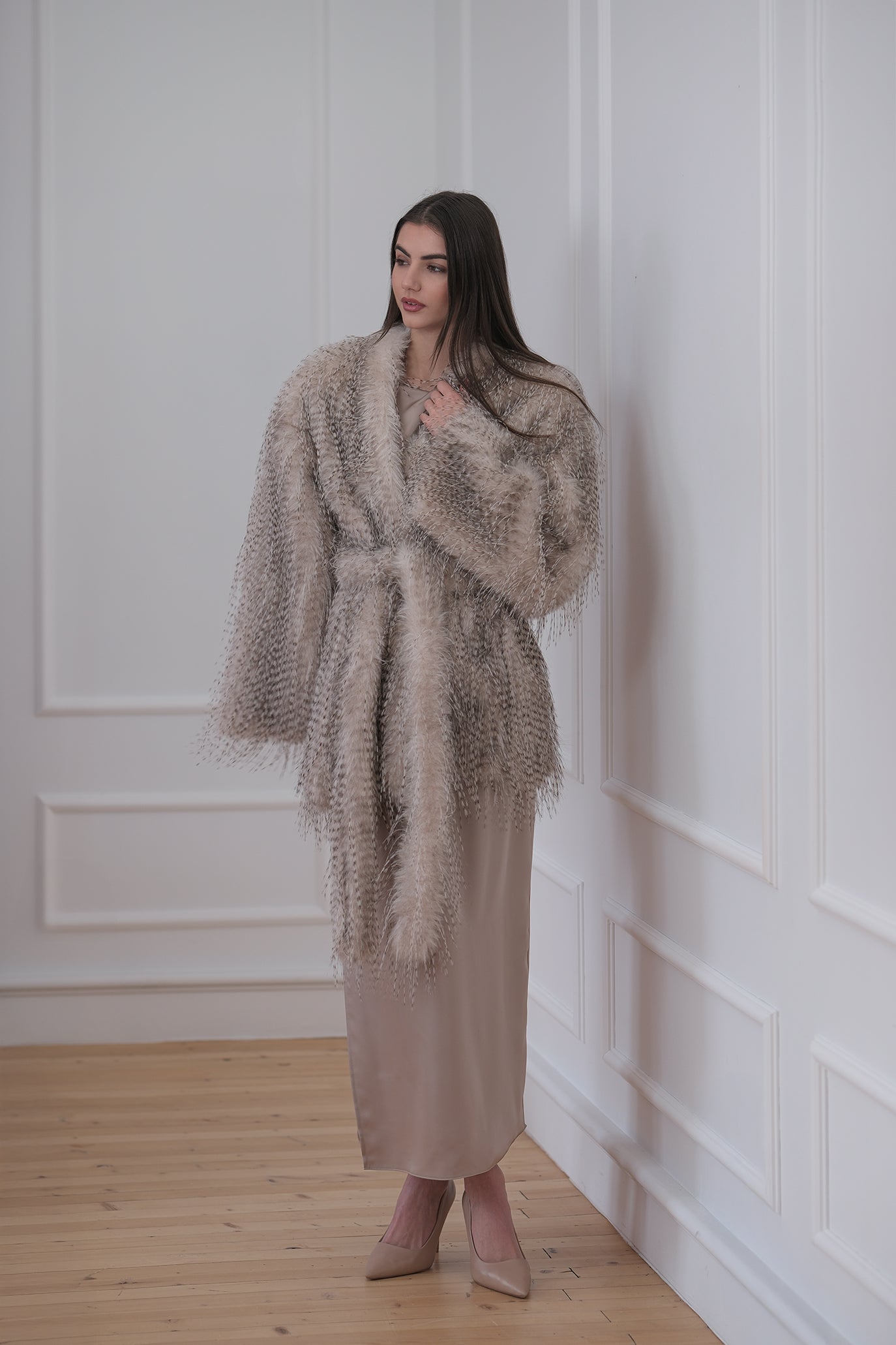 Ефектно късо палто, изработено от специални ресни с ефект на бодливо свинче. Коланът подчертава талията. Дължина до към средата на бедрото и леко движение при всяка стъпка. Идеален завършек върху рокли, костюми и гащеризони. Дължина на палтото - 75см.