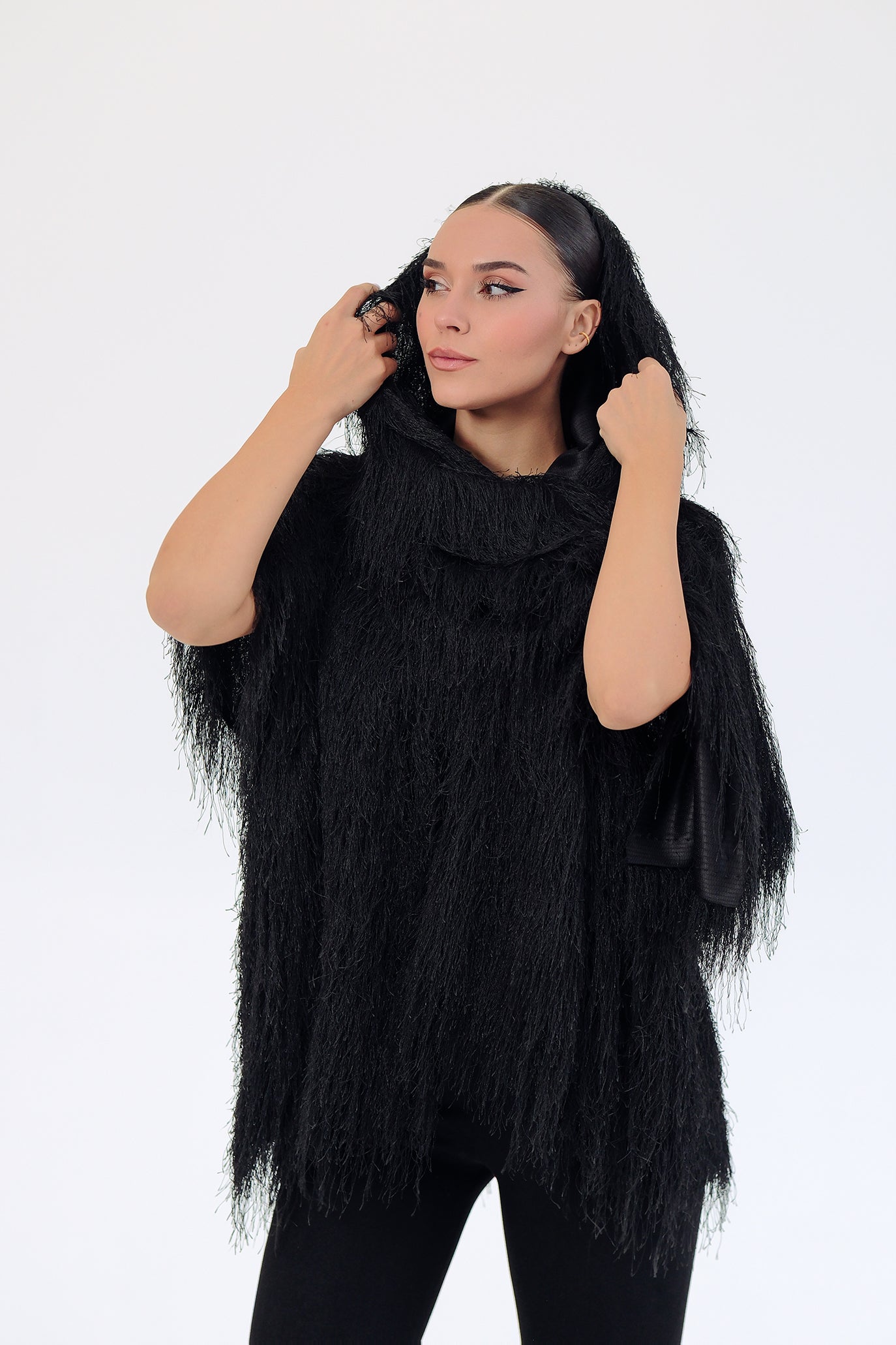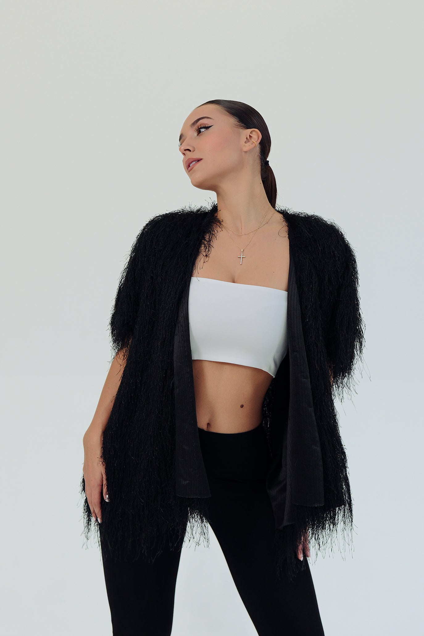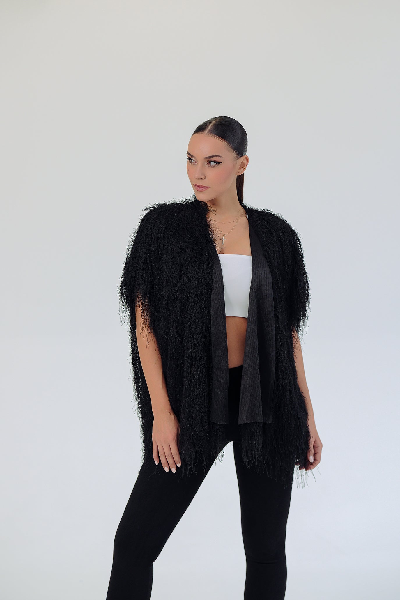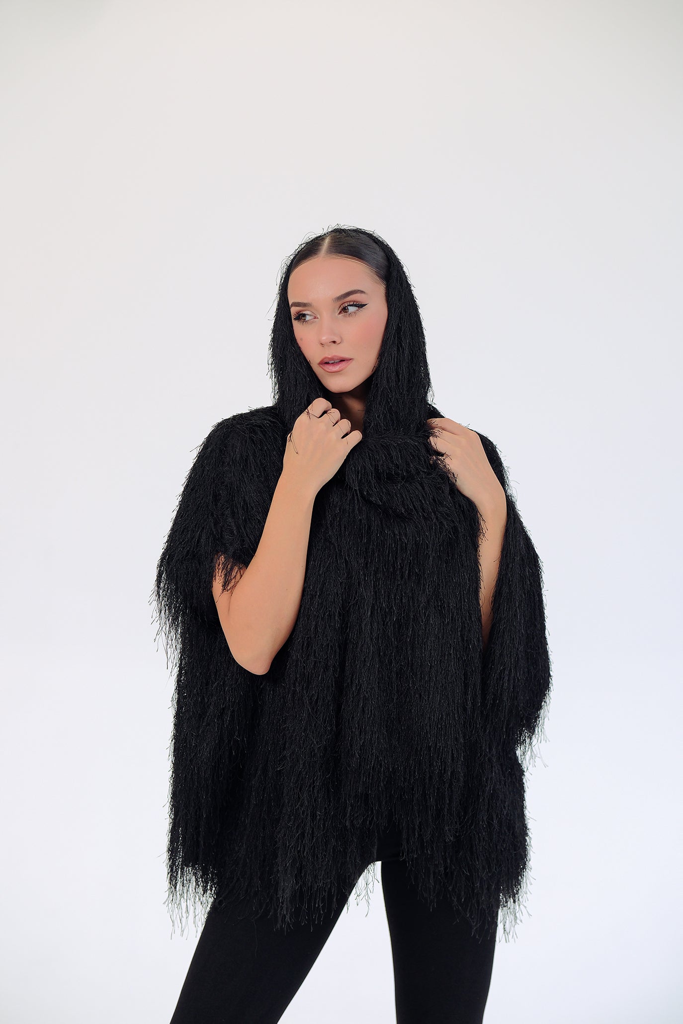 Ефектна къса жилетка, изработена от специални конци - ресни с ефект на пера или косъм. Къс ръкав тип наметка, дължина до към средата на бедрото и леко движение при всяка стъпка. Идеален завършек върху рокли, костюми и гащеризони. Дължина на наметалото - 75см.